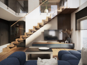 Centralnym punktem mieszkania są nowoczesne schody, które łączą funkcję użytkową z dekoracyjną.
