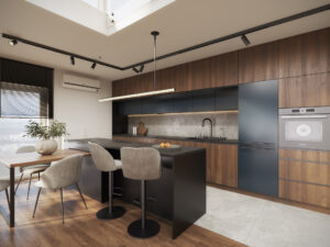 Przemyślane rozwiązania, takie jak szafy na wymiar, pozwalają maksymalnie zagospodarować dostępną przestrzeń, co znacząco ułatwia codzienne przechowywanie i utrzymanie porządku. W kuchni natomiast stylowa zabudowa kuchenna wykonana na wymiar doskonale łączy estetykę z funkcjonalnością, tworząc serce domu, które jest zarówno eleganckie, jak i praktyczne. Dzięki tym rozwiązaniom, mieszkanie nie tylko zachwyca wyglądem, ale także zapewnia pełen komfort życia, idealnie wpisując się w potrzeby nowoczesnych mieszkańców.