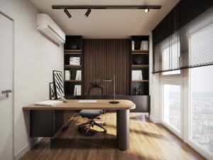 Gabinet to idealne miejsce do pracy, gdzie minimalistyczny design łączy się z funkcjonalnością. Jasne drewno i stonowane kolory pomagają skupić się na obowiązkach, a jednocześnie dodają przestrzeni elegancji.