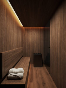 Jednym z wyróżników realizacji jest prywatna sauna, która znacząco podnosi standard mieszkania.