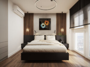 Sypialnia to oaza spokoju i intymności, gdzie minimalistyczna estetyka spotyka się z komfortem.