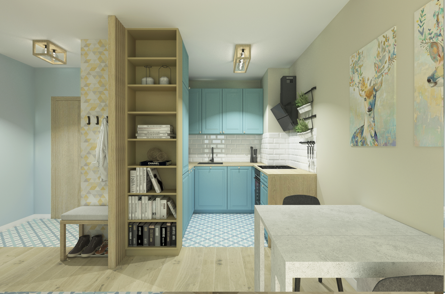 Poniższe wnętrze zostało zaprojektowanie w lekkiej, skandynawskiej stylistyce. Oryginalnym elementem wnętrza jest kontrastowa szafa modułowa wstawiona do gabinetu. Mieszkanie zostało wyposażone w meble Ikea. Przeszklona szafa wnękowa w przedpokoju optycznie zwiększa przestrzeń mieszkania.