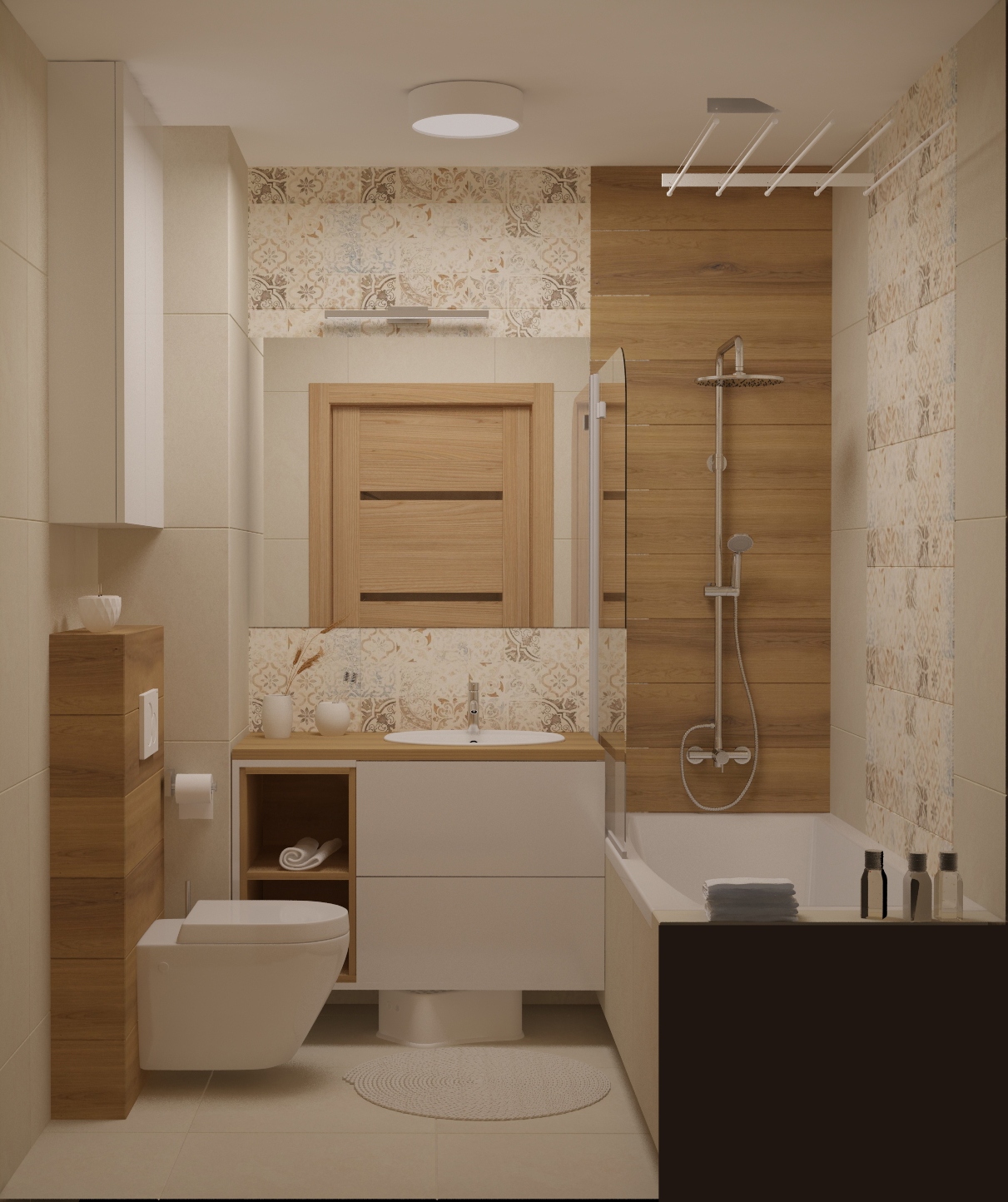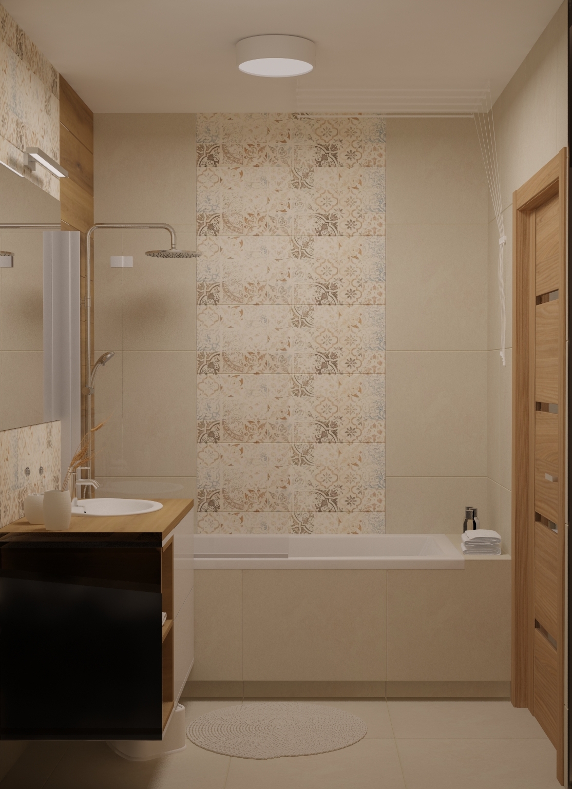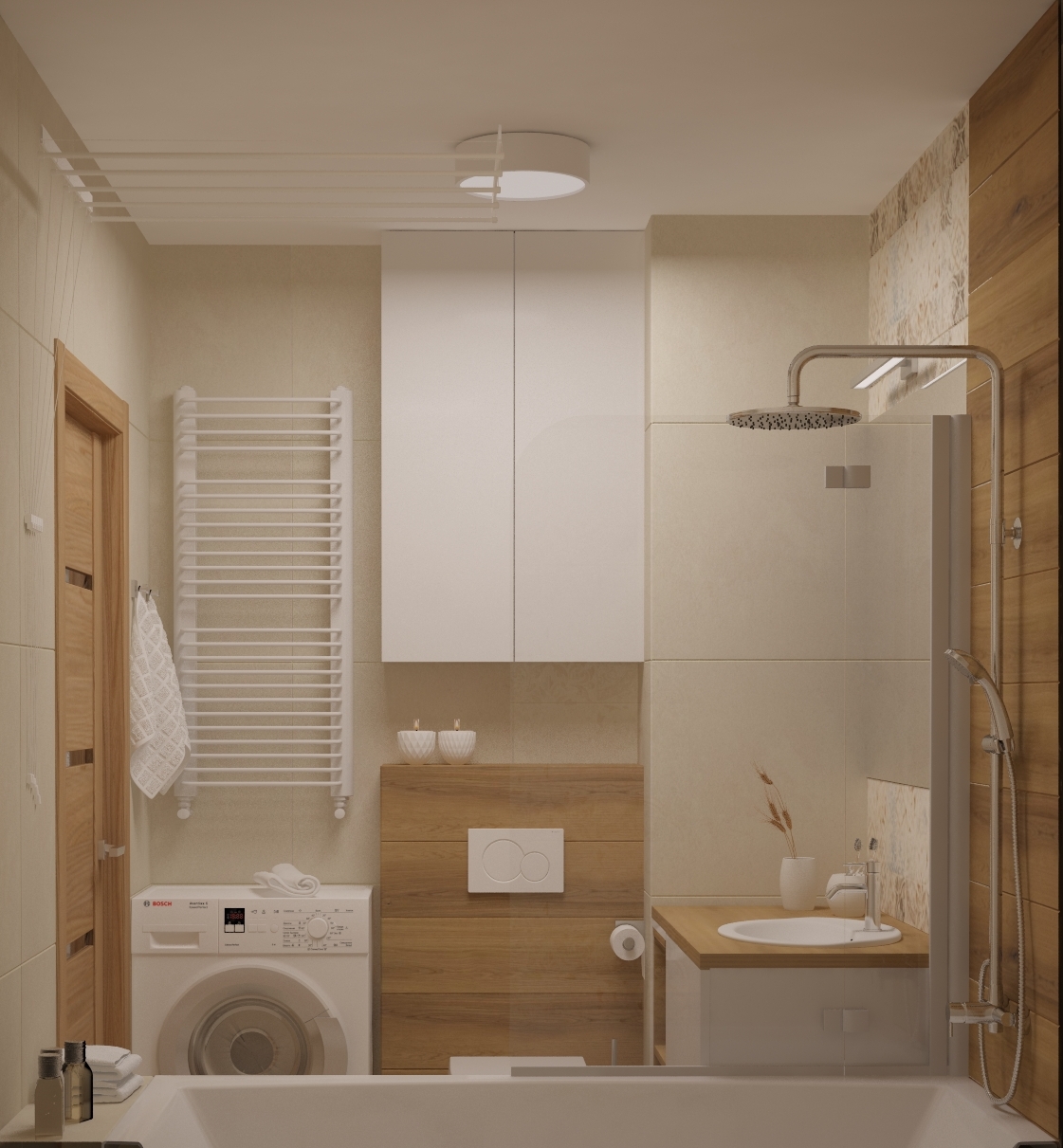 Projekt mieszkania, odwołujący się do uniwersalnej i ciepłej stylistyki, zakładał maksymalizację wykorzystania dostępnej przestrzeni. Architekt zastosował parę sprytnych rozwiązań, które mają przekładać się na komfort użytkowników: pełna zabudowa kuchni umożliwi łatwe przechowywanie produktów spożywczych; zastosowanie lustra optycznie zwiększa pomieszczenie, a zasłona pozwala w prosty sposób odseparować część kuchenną od salonu. Z uwagi na niewielką przestrzeń i ogarniczenia finansowe zdecydowano, aby nad wanną zainstalowano podwieszaną suszarkę.