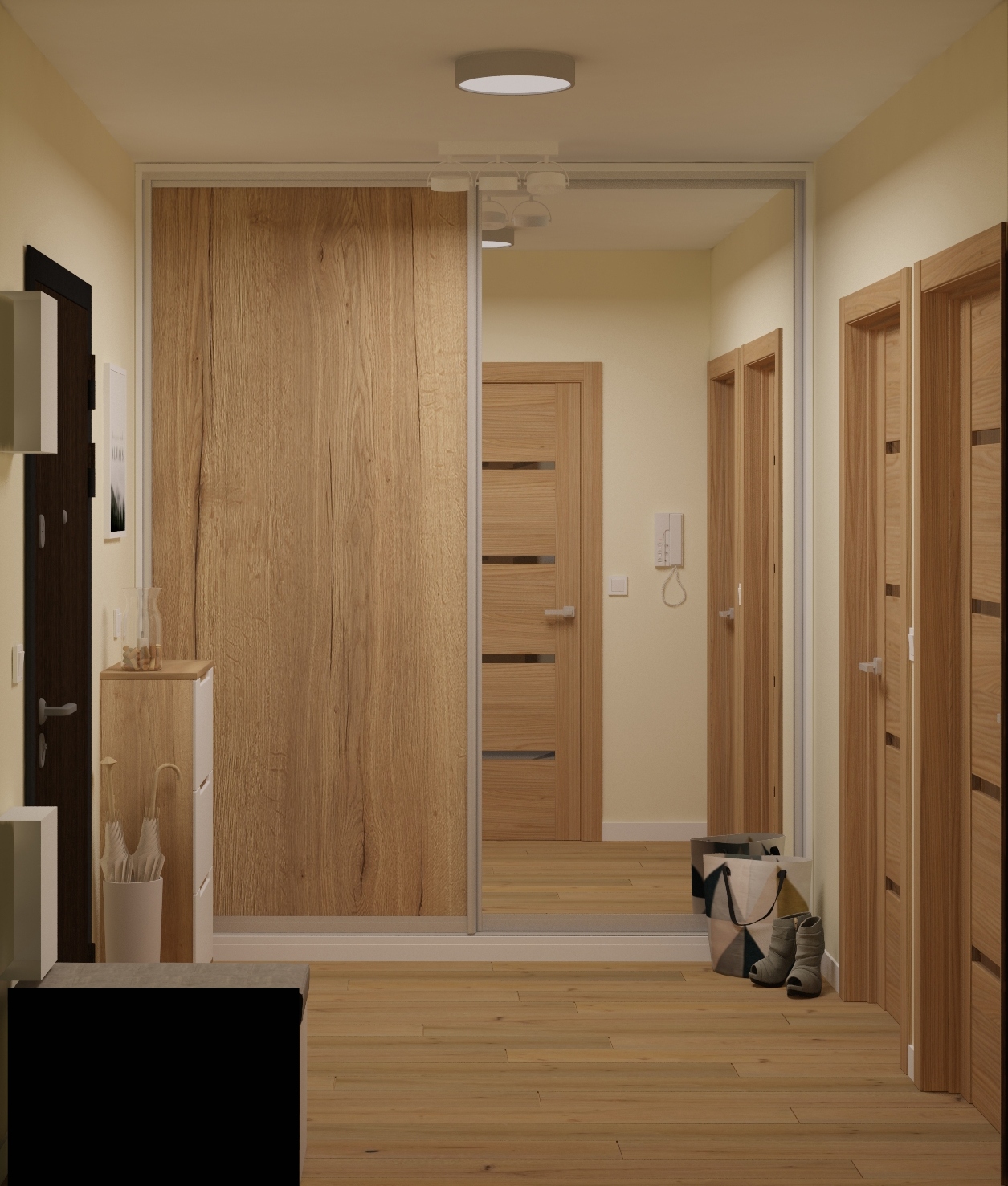 W hallu zastosowano oświetlenie chowane w sufit oraz pojemną szafę wykonywaną na wymiar zgodnie z projektem. Co więcej, zastosowanie przeszkleń, chowanego oświetlenia i lekkich lameli dekoracyjnych miało na celu optyczne zwiększenie przedpokoju.