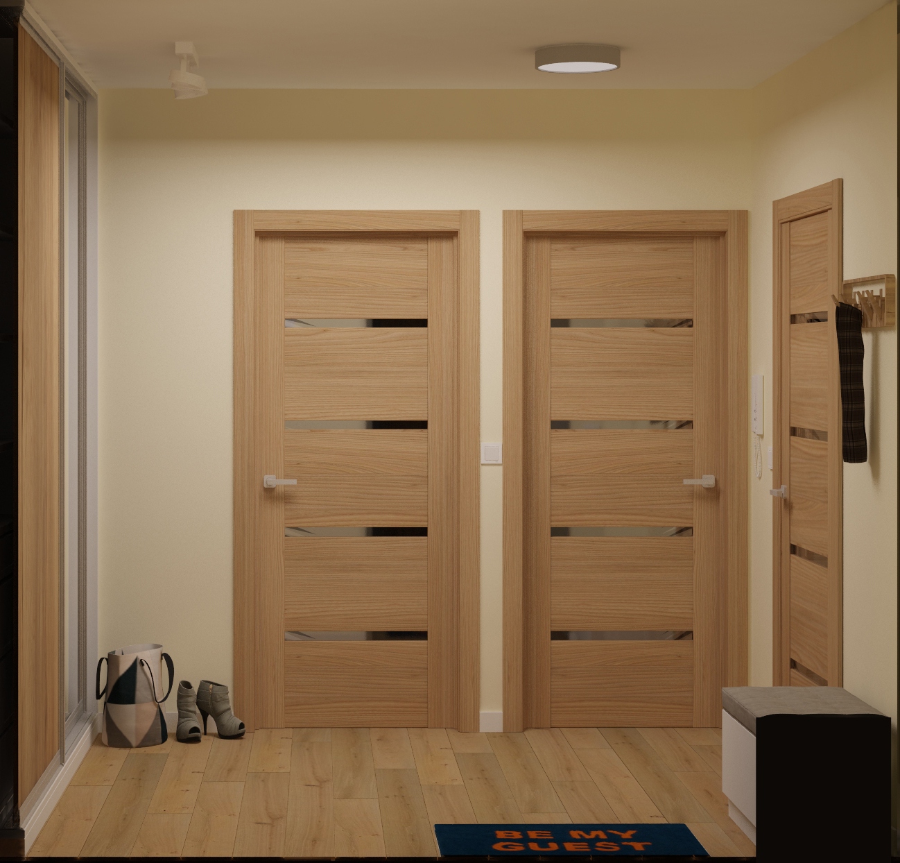 Zaprojektowane i wykończone pod klucz mieszkanie łączy nowoczesność z nutą eklektyzmu. Motywem przewodnim jest drewno i szarość, które zaakcentowano turkusowymi elementami wystroju. Stonowana i ciepła paleta kolorystyczna sprawia, że zaprojektowane wnętrze jest przytulne i stylowe. Zastosowanie przeszkolonych drzwi pomiędzy hallem a gabinetem zapewnia dostęp do światła dziennego wewnętrznej części mieszkania i optycznie zwiększa przestrzeń przedpokoju. Co więcej, industrialne drzwi doskonale się wpasowują się w elegancką formę drewna i szarości, nadając wnętrzu harmonii i powagi.