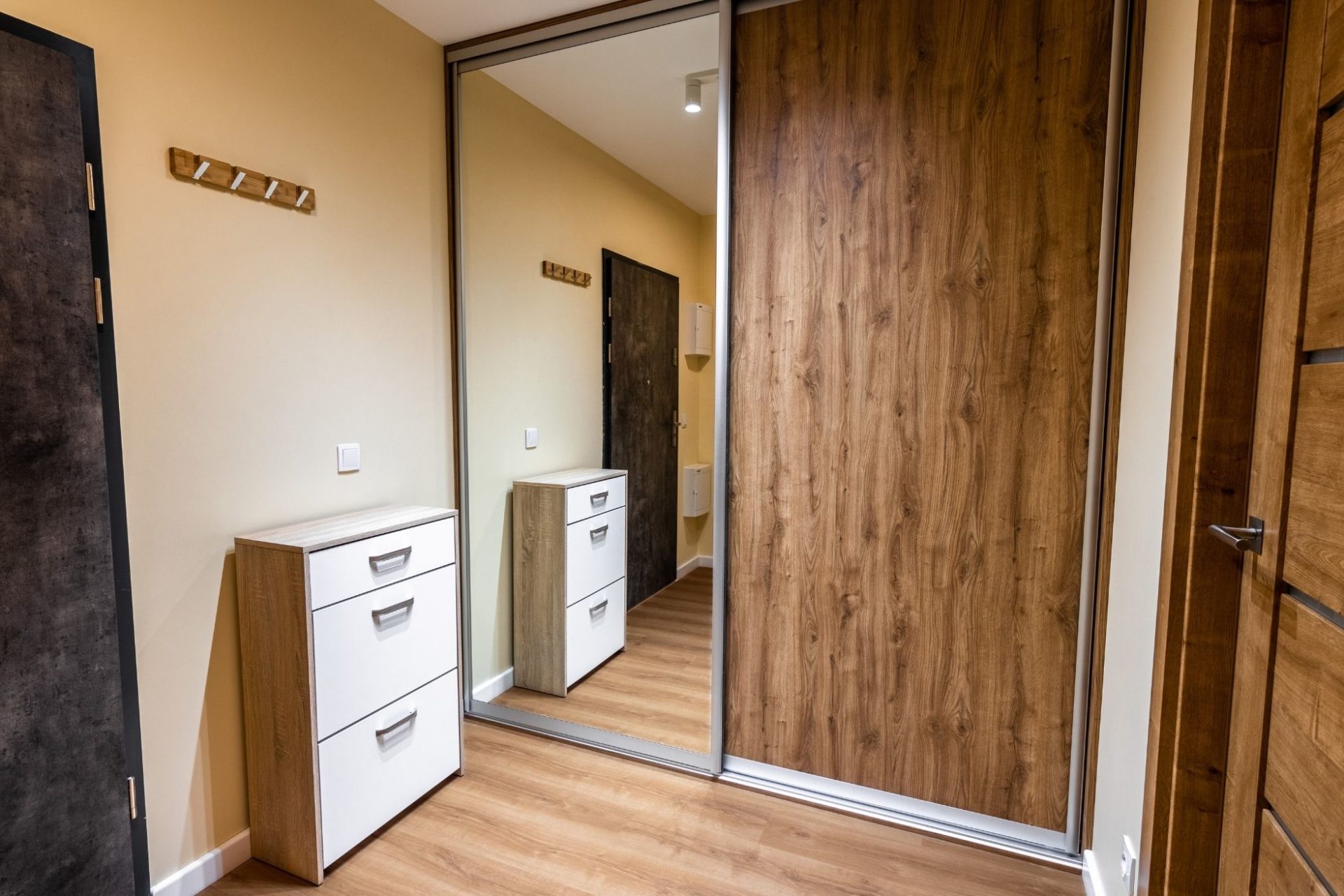 Wnętrze skrojone pod indywidualne potrzeby zostało zaprojektowane w prostej i ciepłej stylistyce. Z uwagi na niewielki metraż zastosowano przeszklenia w przedpokoju i sypialni, które optycznie zwiększają przestrzeń mieszkania. Drewniana zabudowa dzieląca salon od części kuchennej, dodaje wnętrzu lekkości.