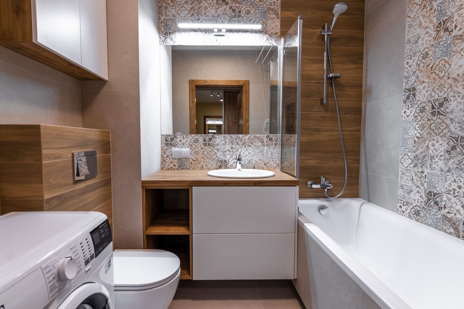 Płytki o marmurowym wzorze fantastycznie prezentuje się w połączeniu z geometrycznymi kształtami o drewnopodobnej barwie. Dlatego efekt finalny zaprojektowanej i wykończonej łazienki jest cudowny. To wnętrze eleganckie, ale i minimalistyczne. Zaprojektowanie i wykończenie łazienki w uwzględnieniem gustów i potrzeb naszych klientów jest elementem usługi pod klucz “wchodzisz i mieszkasz”