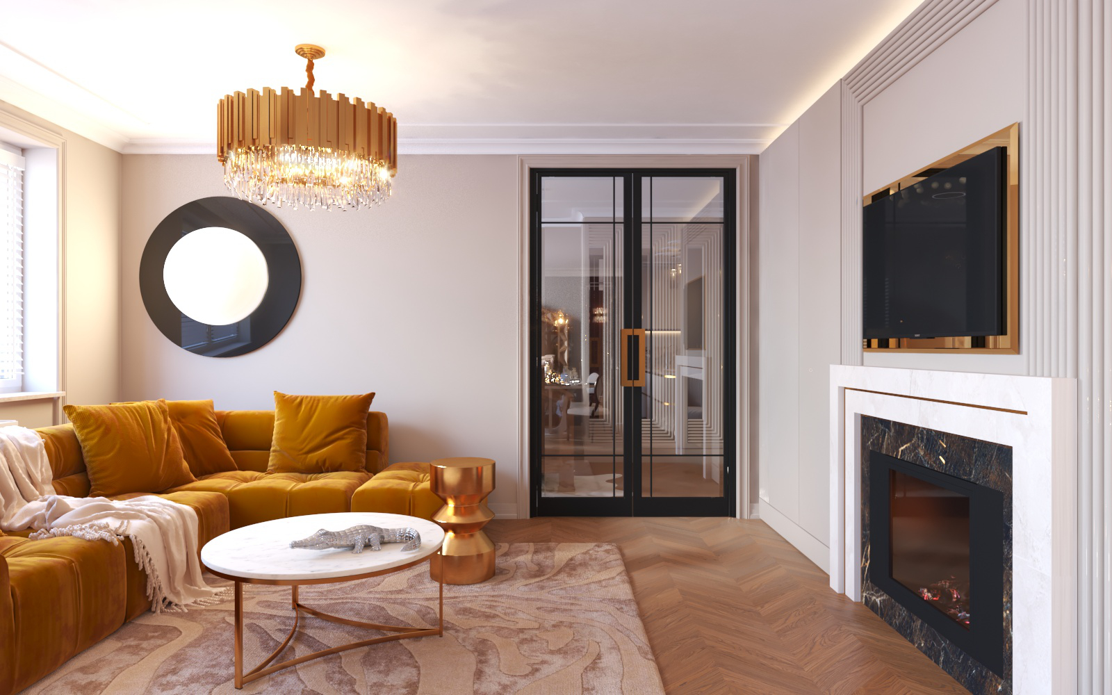 Projektując, a następnie wykańczając mieszkanie pod klucz, zadbano o najdrobniejszy detal, który uczynił to wnętrze wyjątkowym i pięknym. Stylowa podłoga w jodełkę, dekoracyjne wykończenie ścian, prestiżowa zabudowa kominka czy szklane drzwi oddzielające salon od sypialni. Dlatego każdy z dobranych elementów wyposażenia i materiałów wykończenia sprawia, że mieszkanie odbierane jest jako wnętrze luksusowe i eleganckie. Warto zwrócić uwagę na ozdobne wykończenie szafy w przedpokoju, które przyozdobiono grafiką.