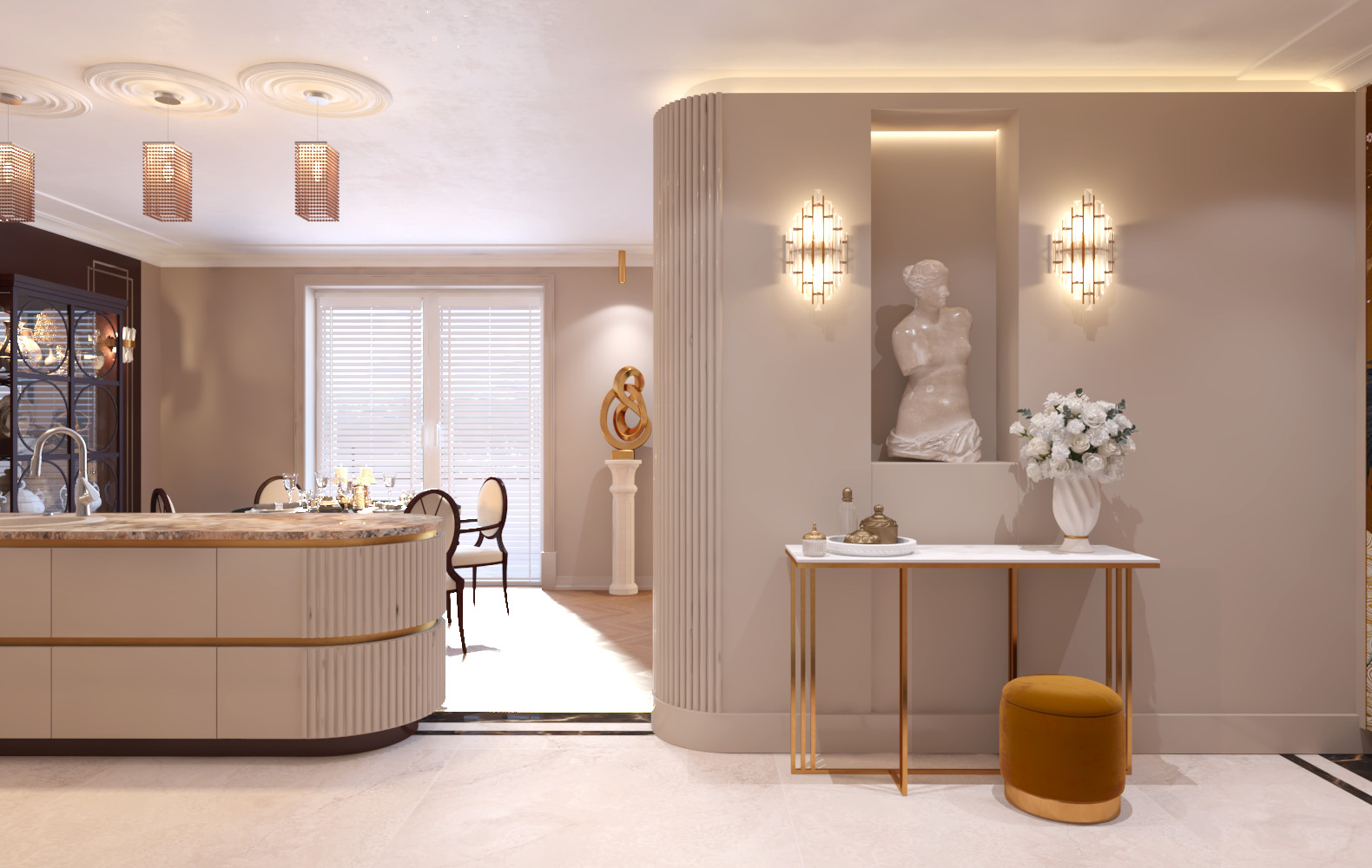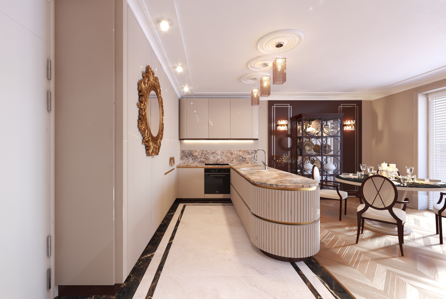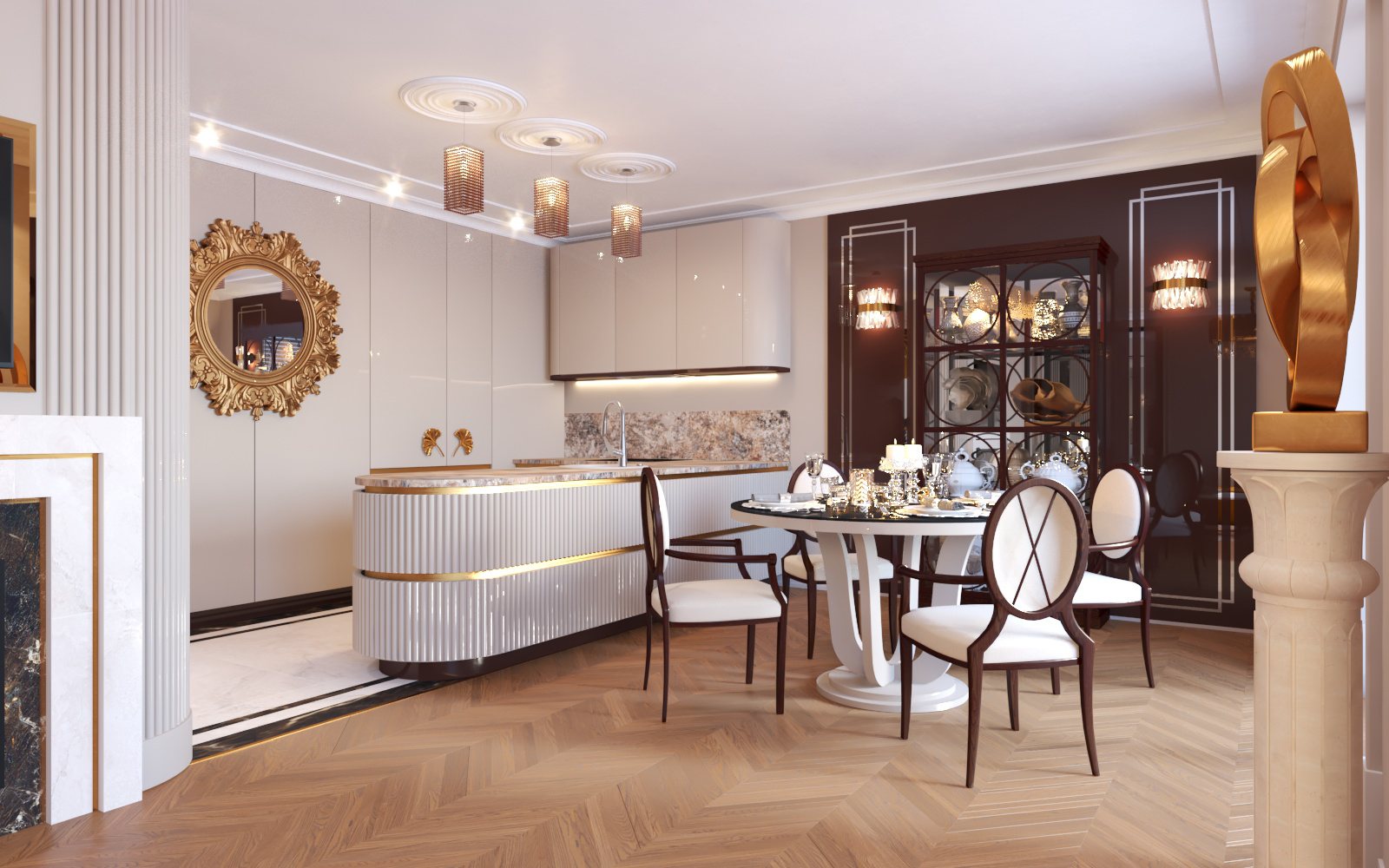 Przepięknie prezentuje się kuchnia, która swoim designem nawiązuje do estetyki art déco. Oryginalny wzór zaokrąglonej wyspy, frezowane wykończenie i wysokiej jakości materiały składają się na przepiękny efekt. Co więcej, eleganckim uzupełnieniem są złote listwy. Całość w połączeniu z sztukaterią i ozdobnym oświetleniem jest niesamowita.