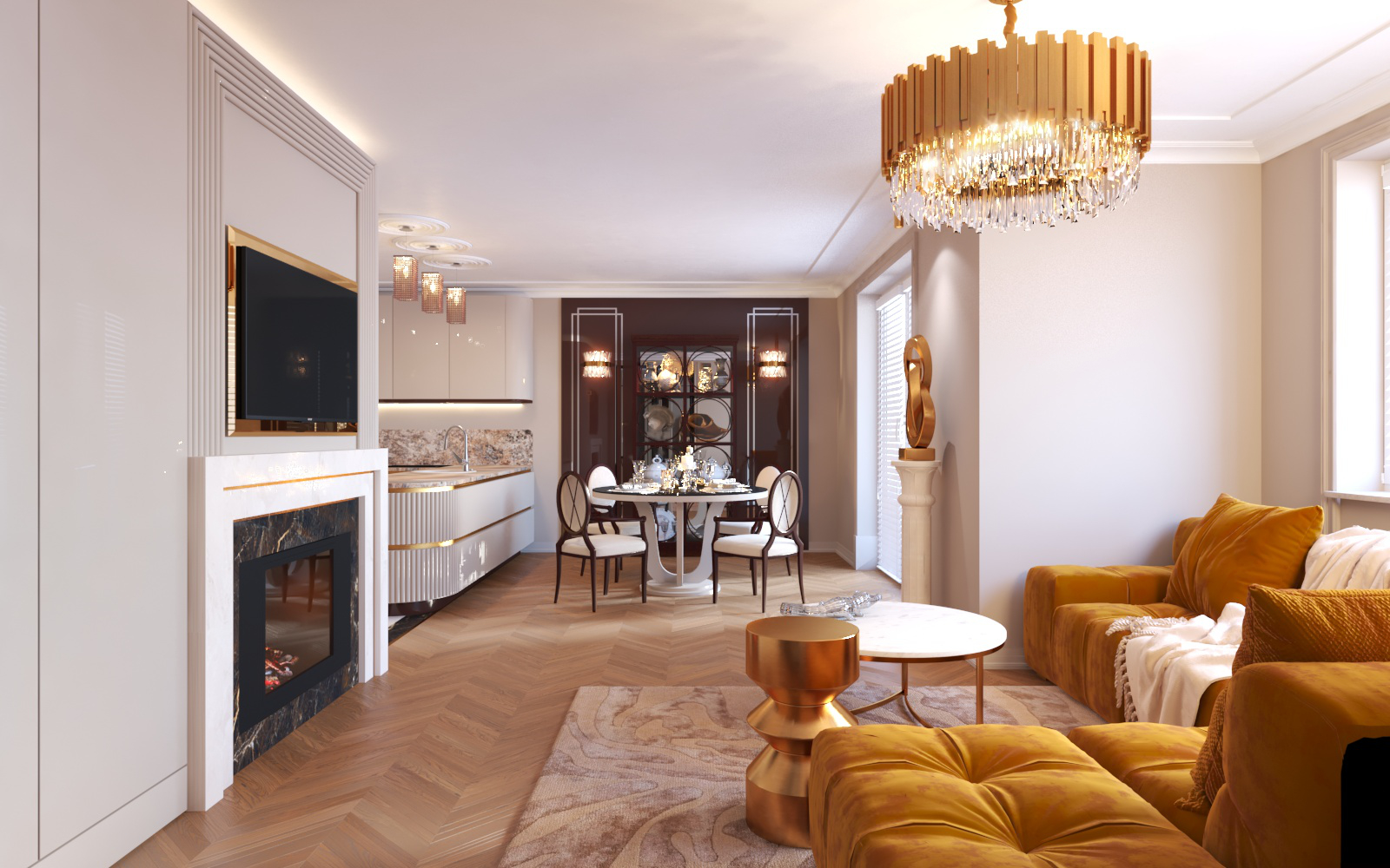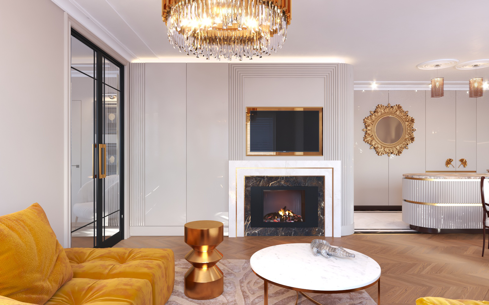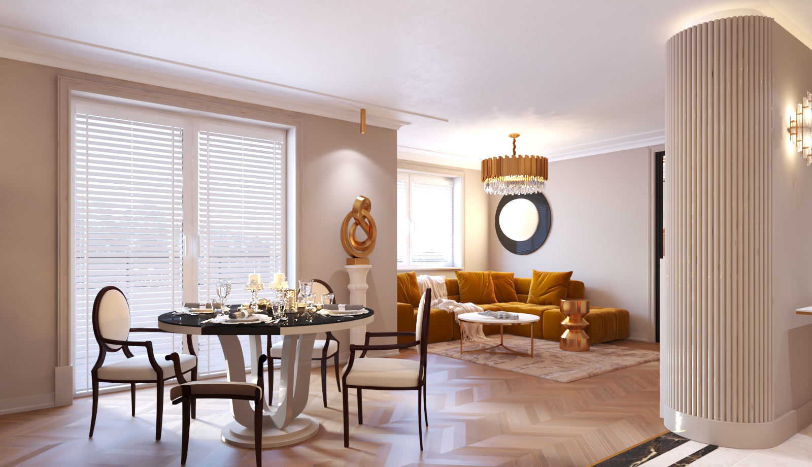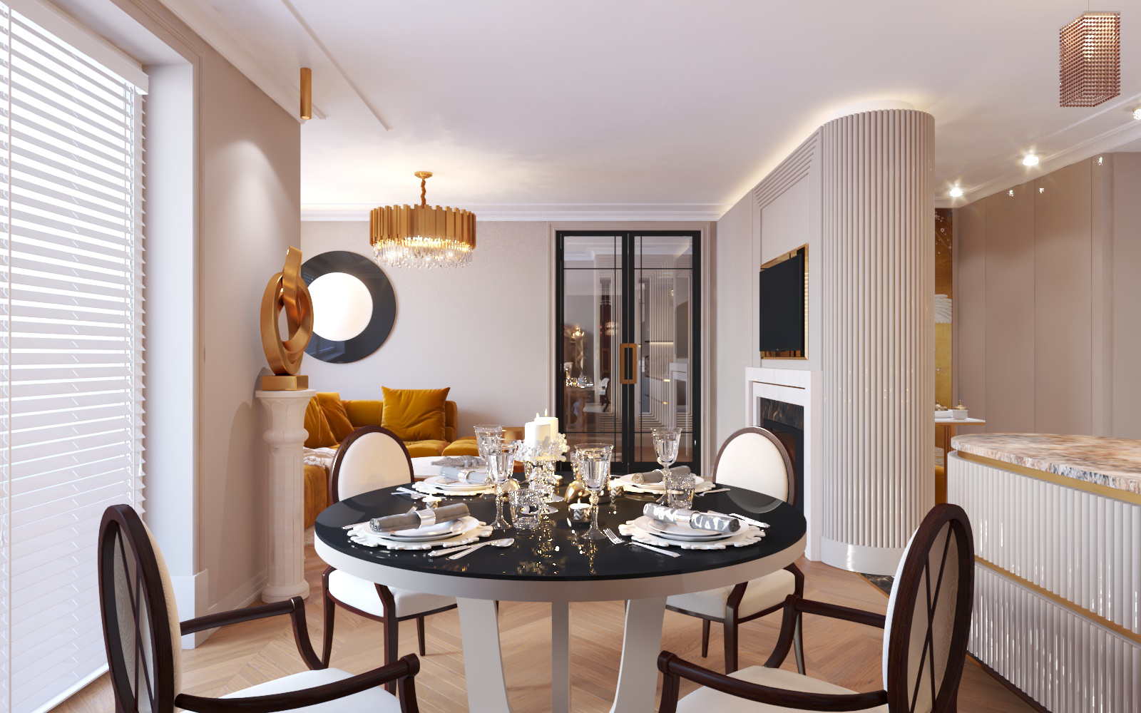 Przepięknie prezentuje się kuchnia, która swoim designem nawiązuje do estetyki art déco. Oryginalny wzór zaokrąglonej wyspy, frezowane wykończenie i wysokiej jakości materiały składają się na przepiękny efekt. Co więcej, eleganckim uzupełnieniem są złote listwy. Całość w połączeniu z sztukaterią i ozdobnym oświetleniem jest niesamowita.