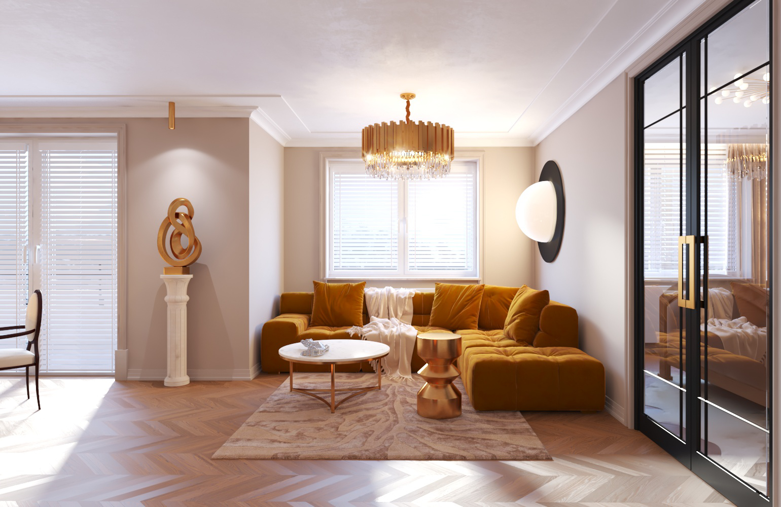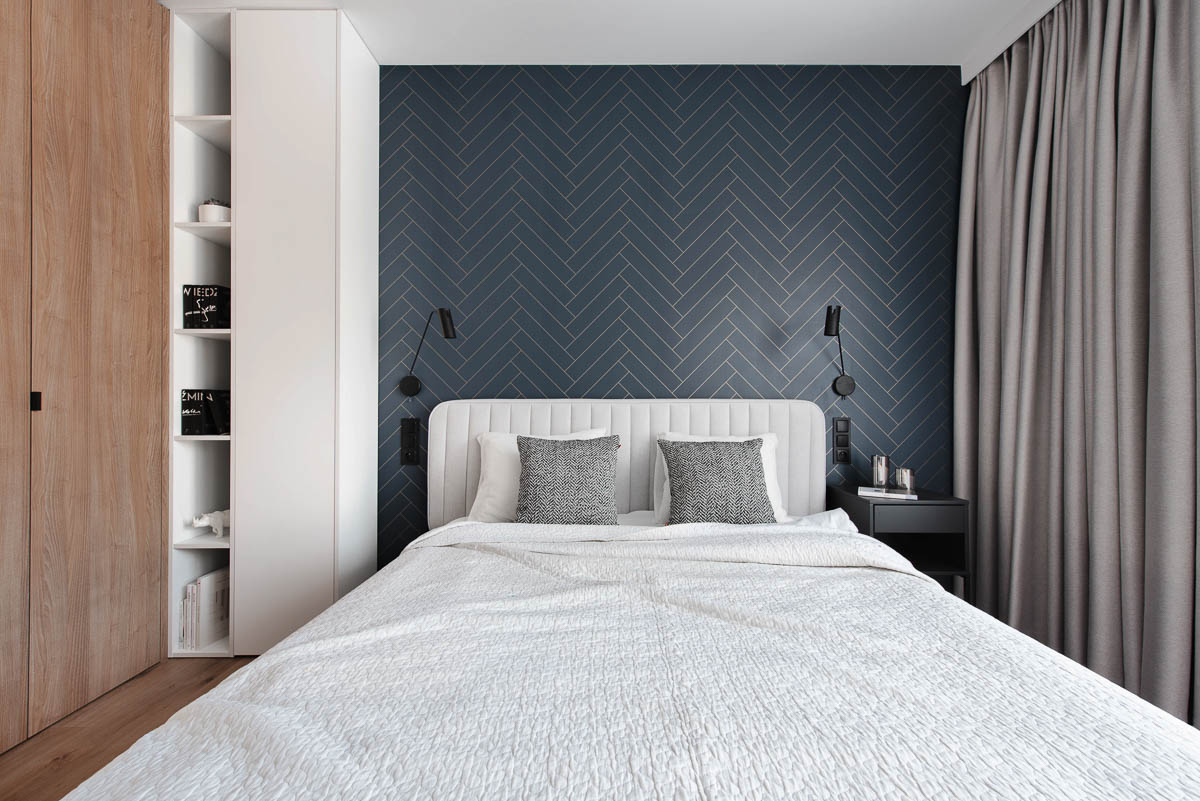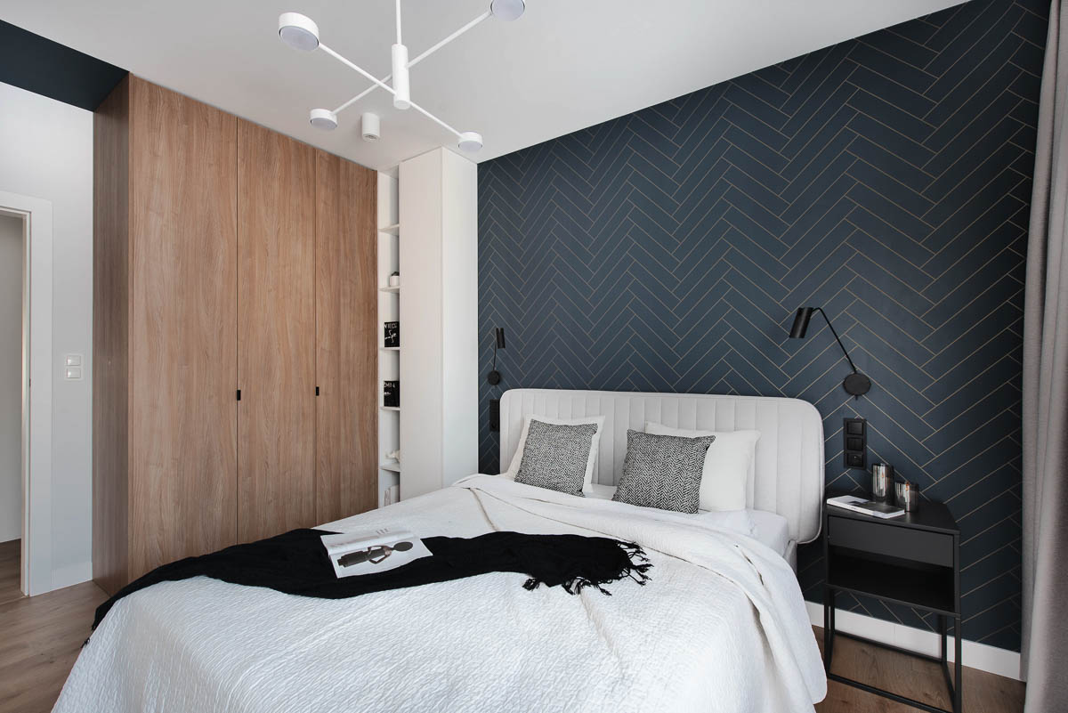 Projekt mieszkania stanowi połączenie kontrastowych kolorów, eleganckich dekoracji i naturalnych materiałów. Sztukateria oraz błysk dodatków i designerskiego oświetlenia, co jest tożsame z stylem glamour. Co ciekawe, we wnętrzu spotykamy podłogę w jodełkę o stonowanym odcieniu czy wzorzyste płytki w kuchni i łazience, co nadaje pomieszczeniom klasycznego charakteru. Co ciekawe, na szczególną uwagę zasługuje połączenie kolorów zabudowy kuchennej z złotą armaturą. Dlatego ciemnogranatowe odcienie powtarzają się w innych pomieszczeniach, jak obicie łóżka w sypialni czy biuro do pracy zdalnej. Zastosowanie takich kolorów ożywia mieszkanie, sprawiając, że staje się bardziej nowoczesne i nietuzinkowe.