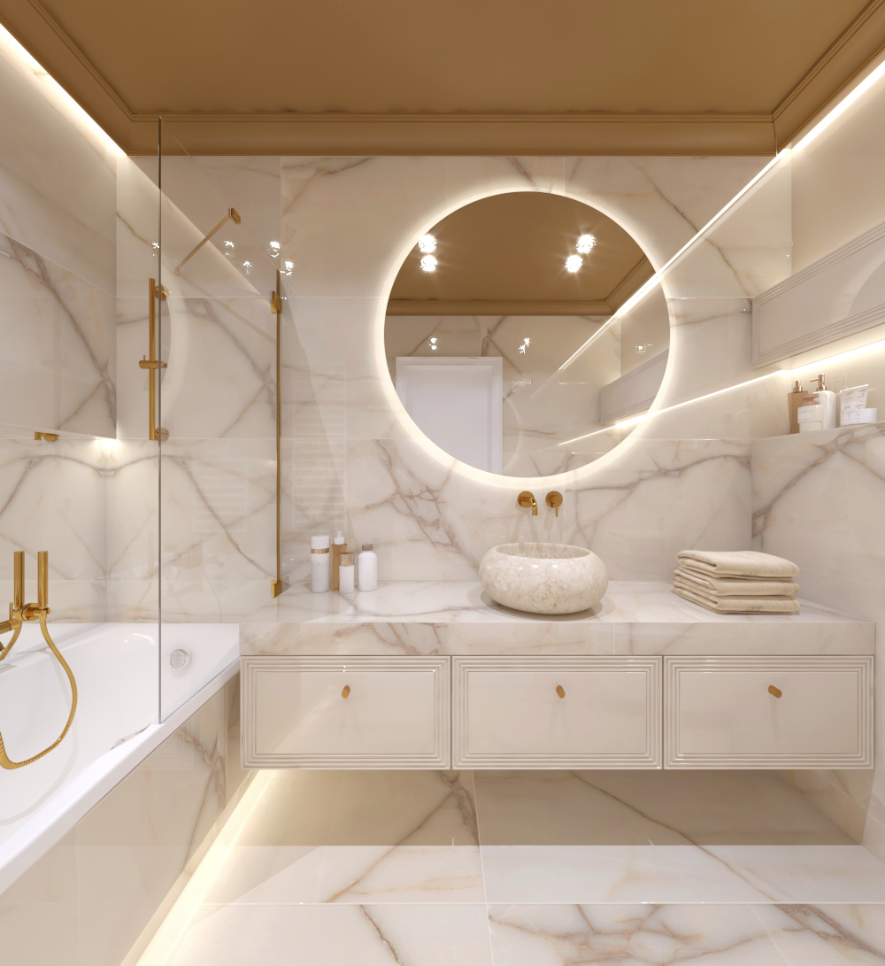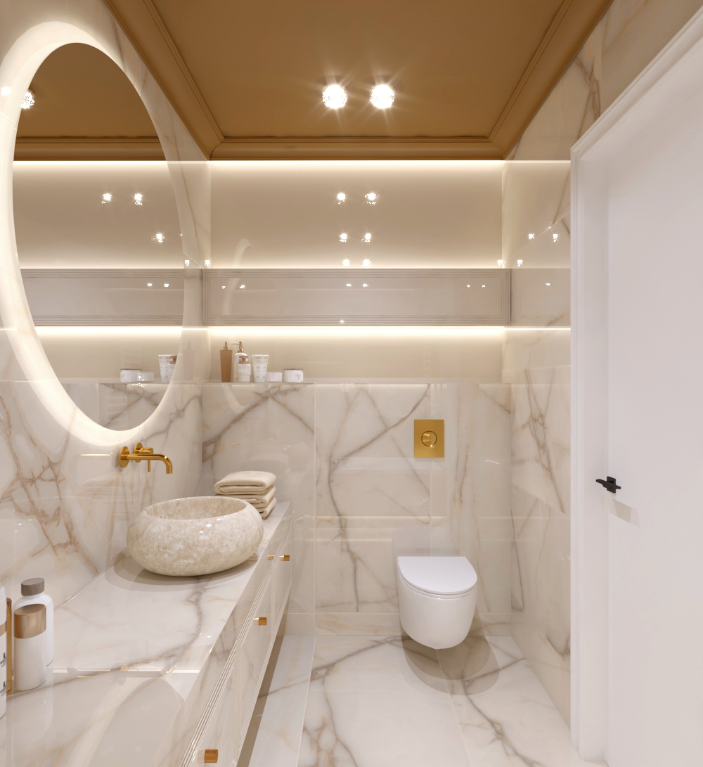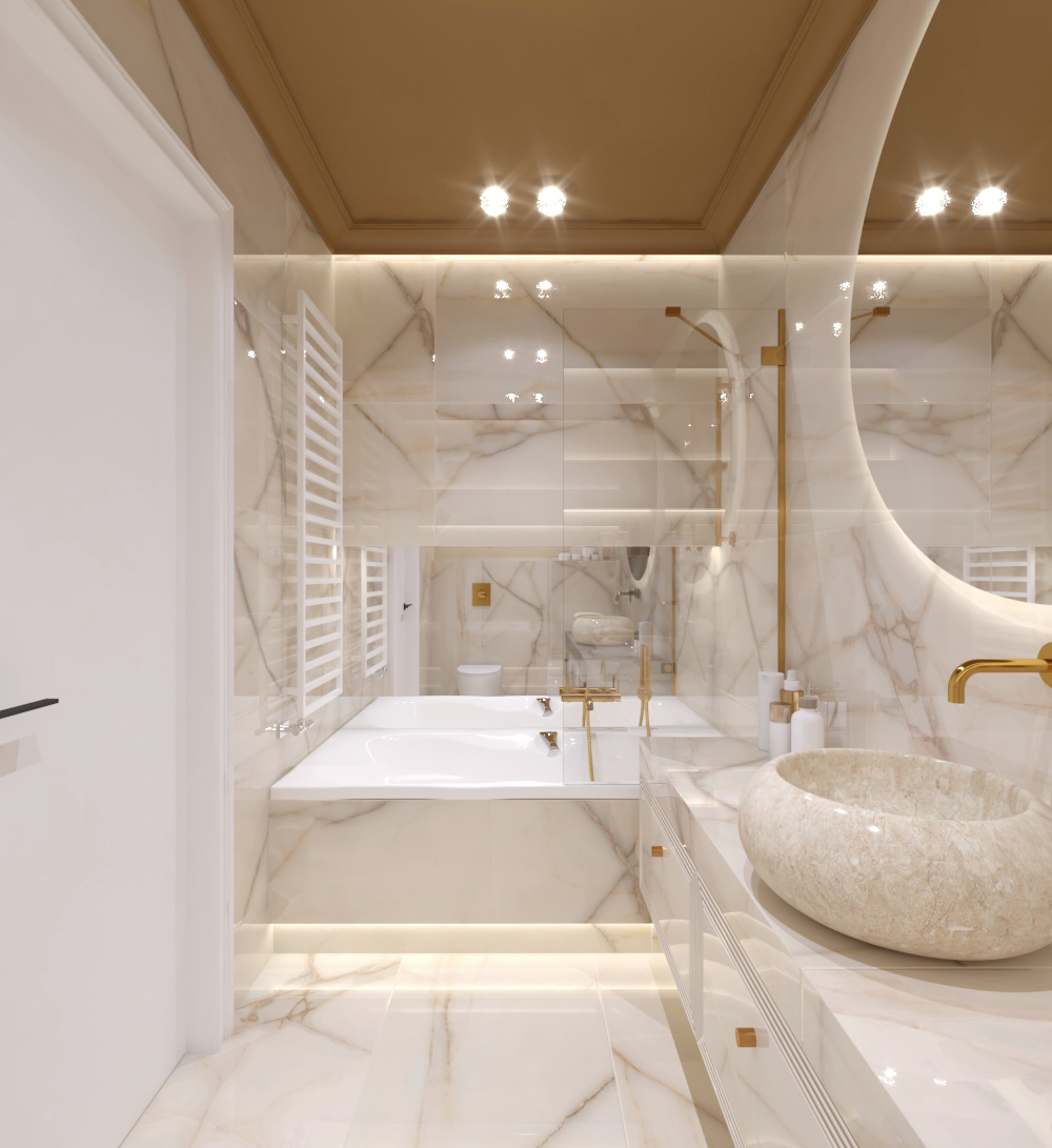 Oświetlenie, designerskie meble, obrazy a nawet rzeźby- to wszystko składa się na to piękne wnętrze. Dlatego właśnie nasz standard „wchodzisz i mieszkasz” jest najbardziej kompletną usługą pod klucz do wykańczania wnętrz mieszkań. Każde oddane mieszkanie jest wyjątkowe, ponieważ zostało zaprojektowane zgodnie z indywidualnymi oczekiwaniami naszych klientów. Co więcej, niesamowicie prezentuje się łazienka. Złote dodatki, zabudowa meblowa wykonywana na wymiar z podświetleniem LED oraz wielkoformatowe płytki o marmurowym wzorze. To wszystko sprawia, że łazienka wygląda pięknie i elegancko.