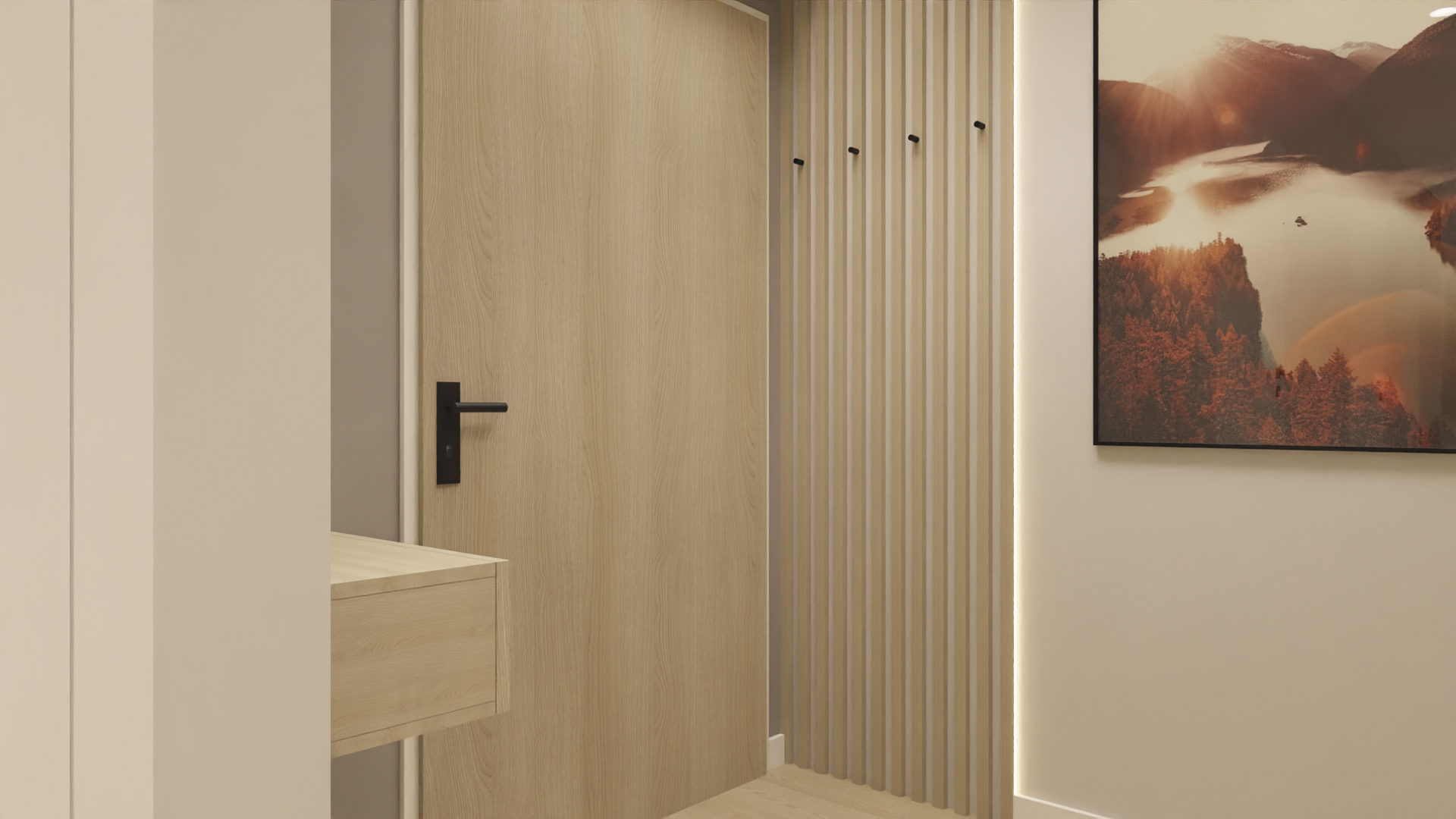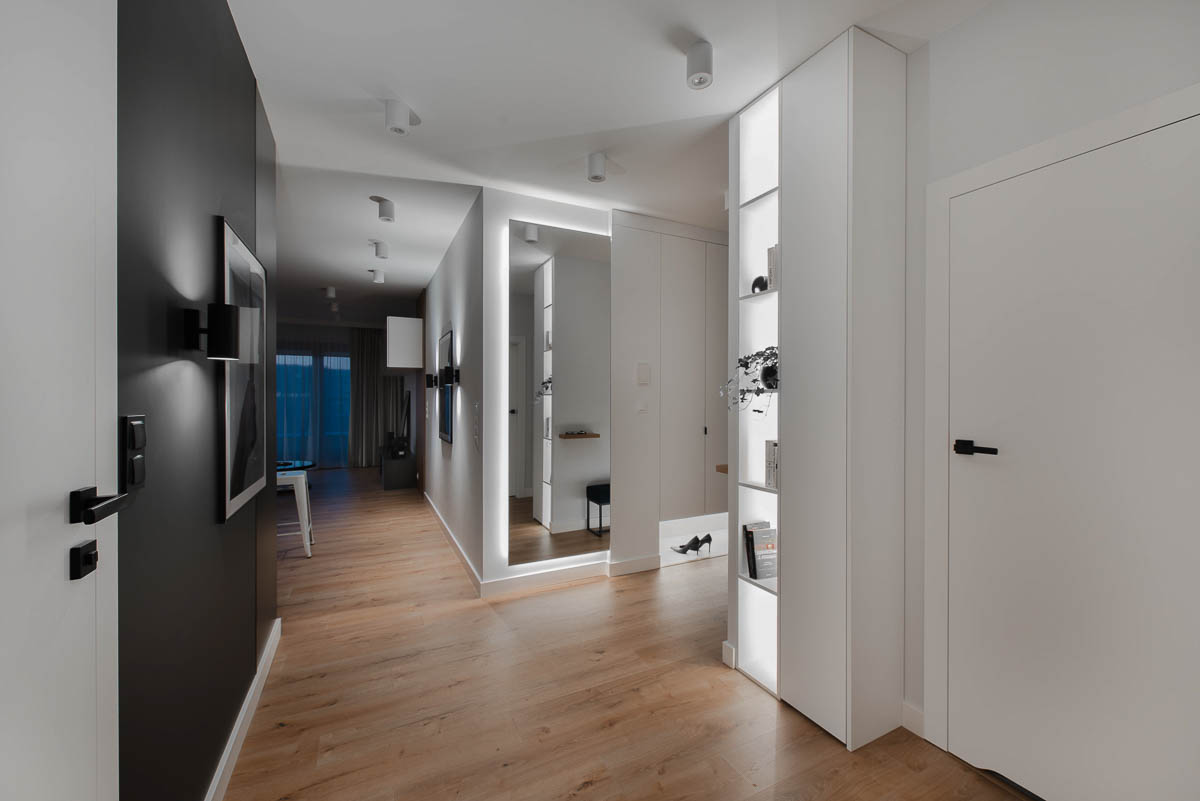 W przedpokoju zapewniono szafy do przechowywania ubrań, drobne dekoracje ścienne jak również miejsce na zawieszenie codziennych płaszczy i kurtek. Haki wkomponowano w ozdobne lamele ścienne z LEDowym podświetleniem.