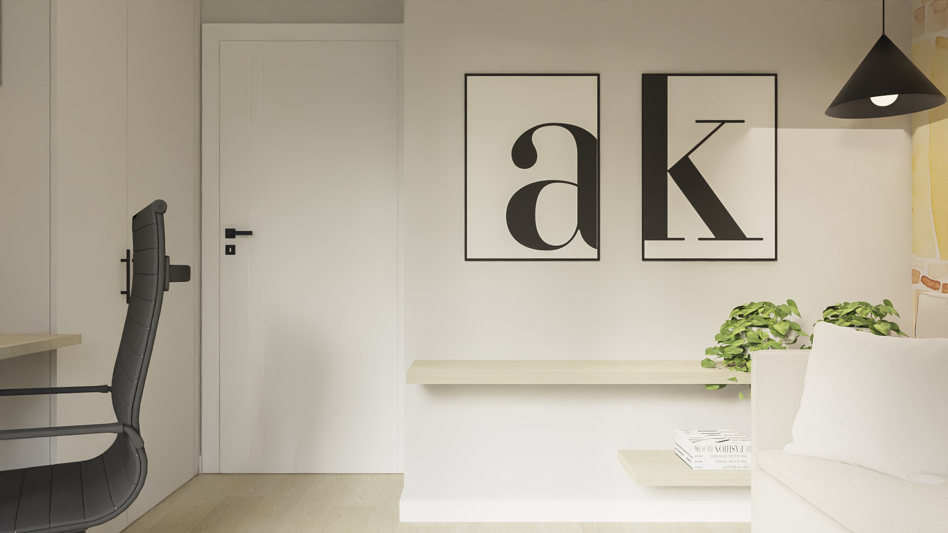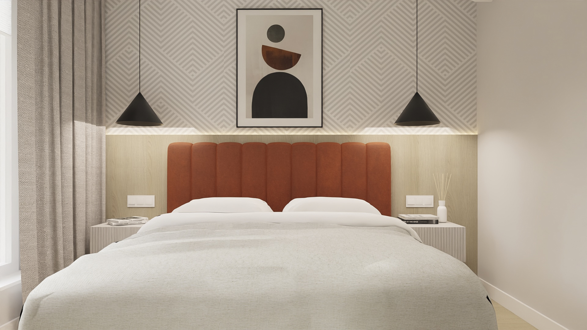 W sypialni oraz gabinecie silnie odczuwalne są inspiracje estetyką bauhaus. Dlatego ciepłe kolory budują spójną całość z geometrią i ponadczasowym minimalizmem. Wszystkie elementy wykończenia wraz z pełnym wyposażeniem zostały zaprojektowane, dostarczone i zmontowane przez firmę SaniWell. Co więcej, również meble na wymiar wykonywane są w ramach usługi “wchodzisz i mieszkasz”. Dlatego usługa pod klucz “wchodzisz i mieszkasz” jest najbardziej spersonalizowaną i kompletną opcją na wykończenie mieszkania.