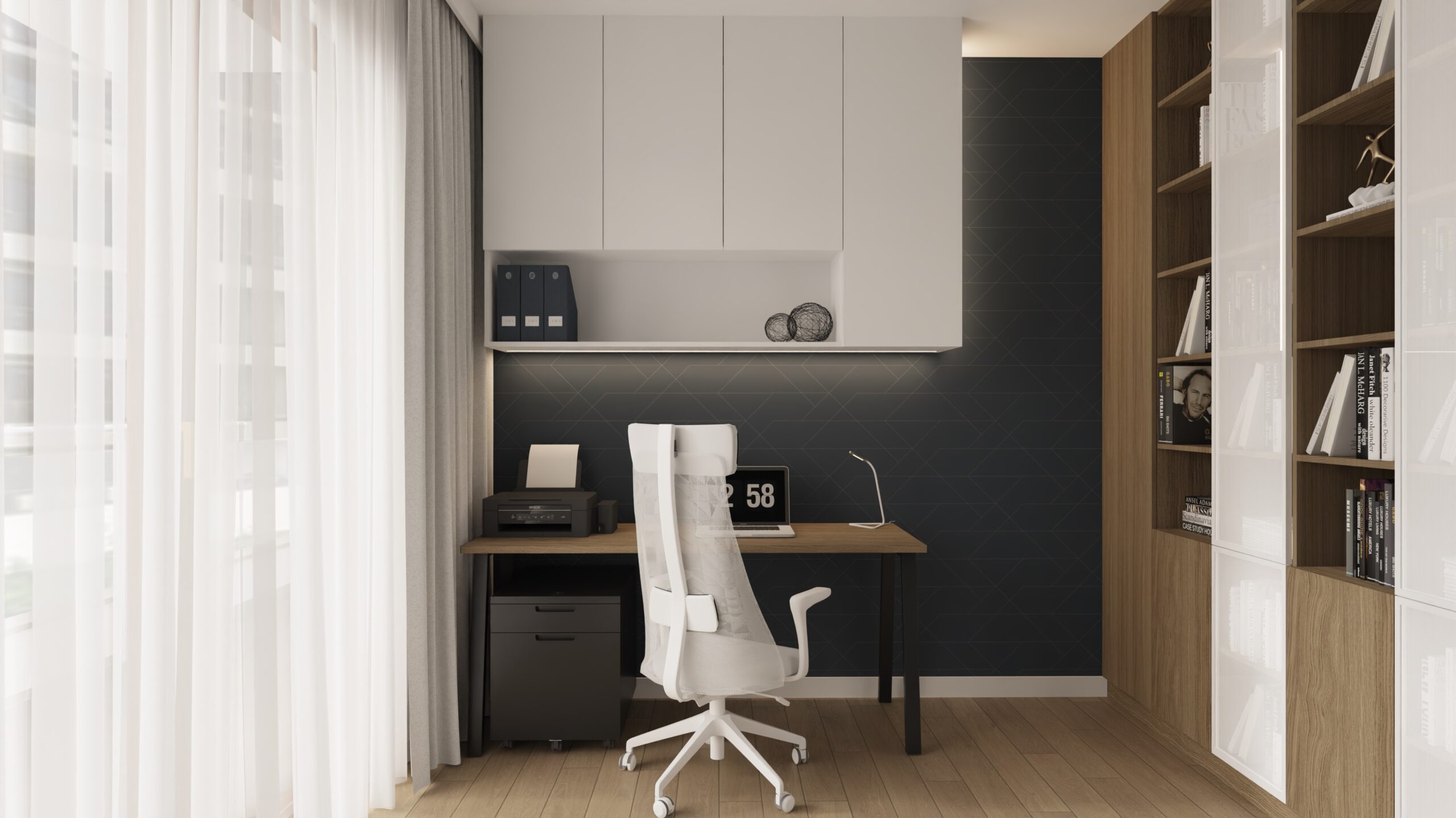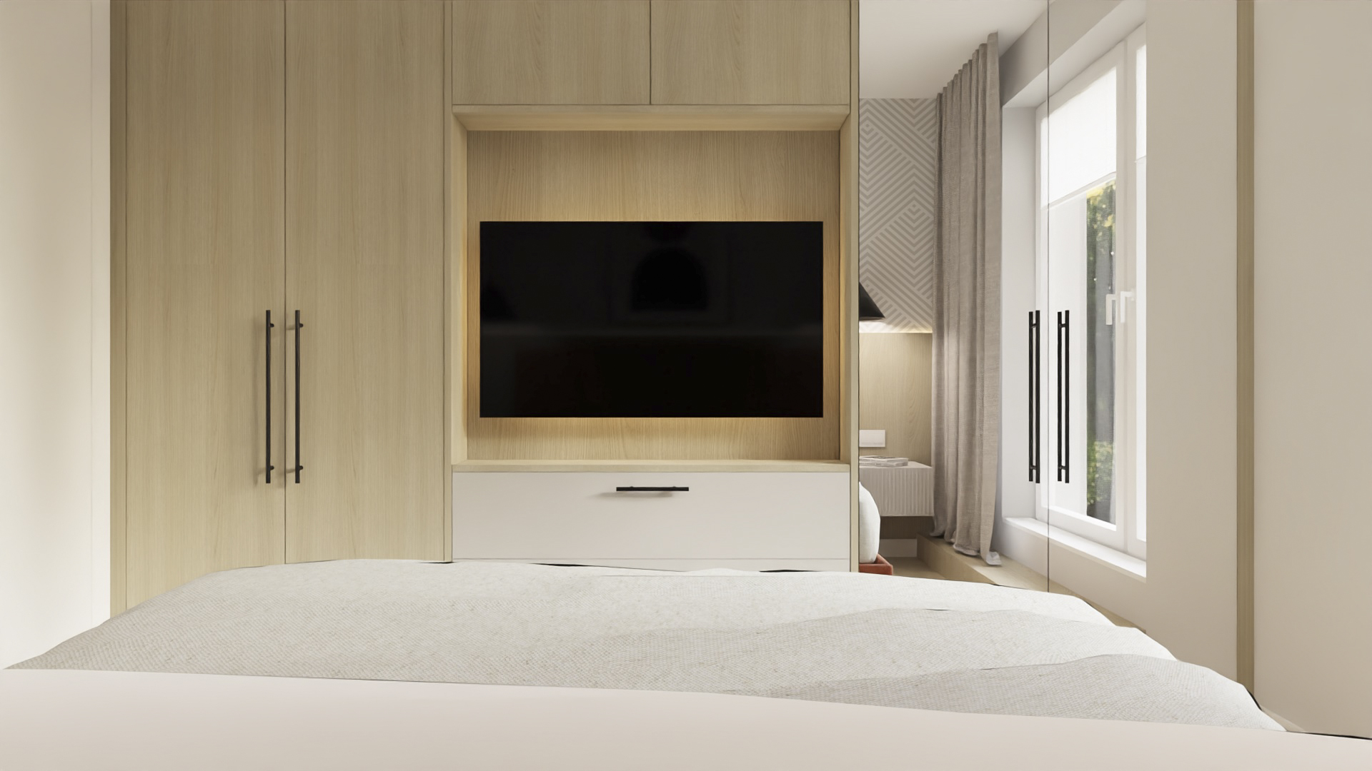 W gabinecie zapewniono wygodne miejsce do pracy zdalnej i wypoczynku przy ulubionej książce. Natomiast w sypialni telewizor wkomponowano w zabudowę, przez co urządzenie udało się wpasować estetycznie w przestrzeń pomieszczenia.