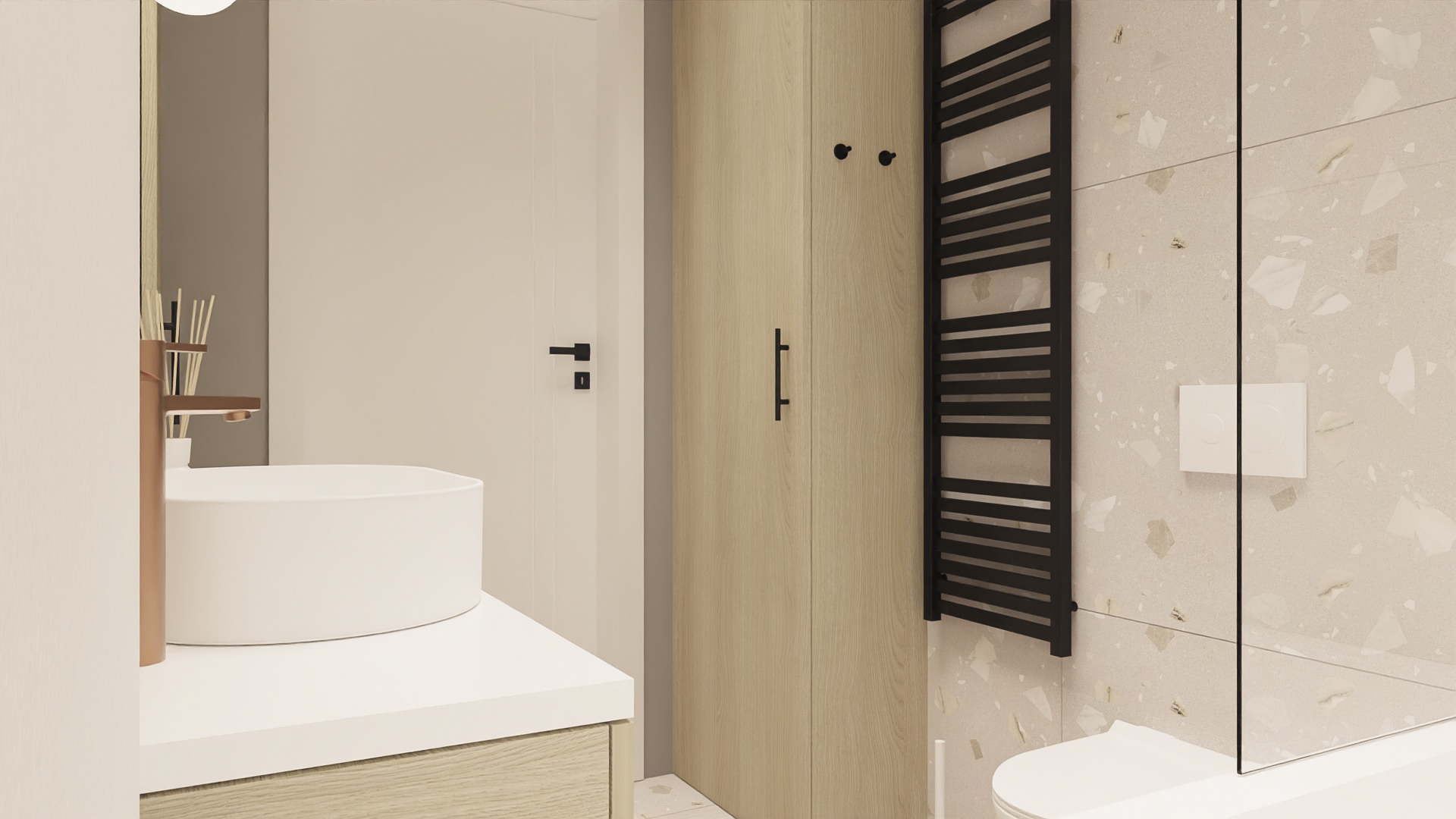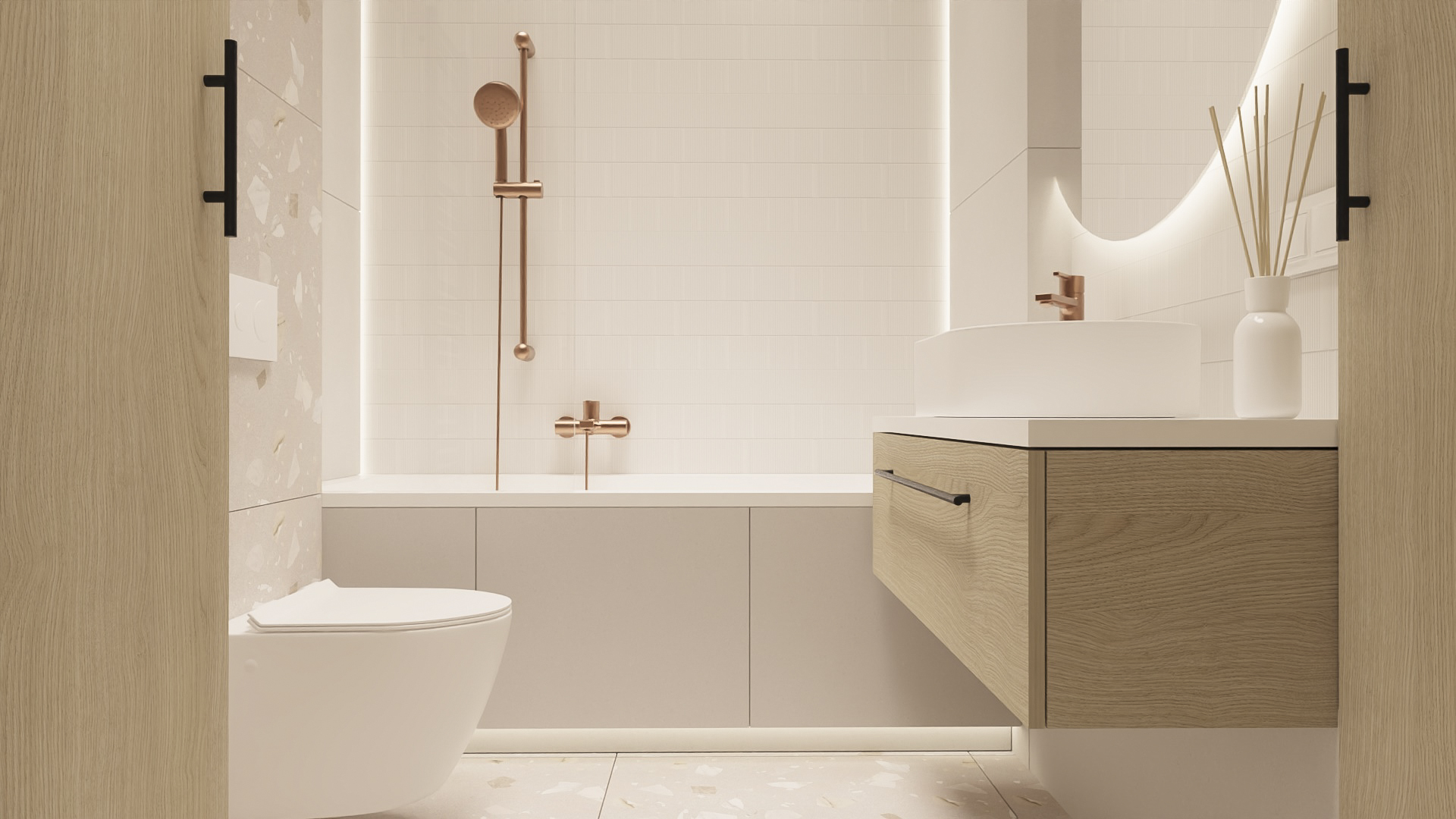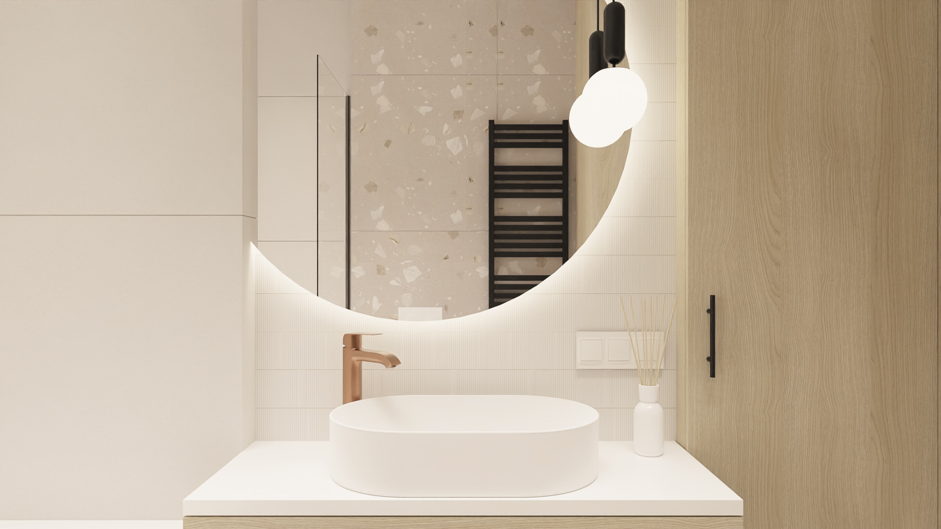 W łazience i WC mamy połączenie jasnych odcieni z kontrastami. Czarne i miedziane dodatki fantastycznie prezentują się w beżowych odcieniach i subtelnym podświetleniu. Tutaj również mamy obecne meble o drewnianym odcieniu, co nadaje spójności z pozostałymi pomieszczeniami.