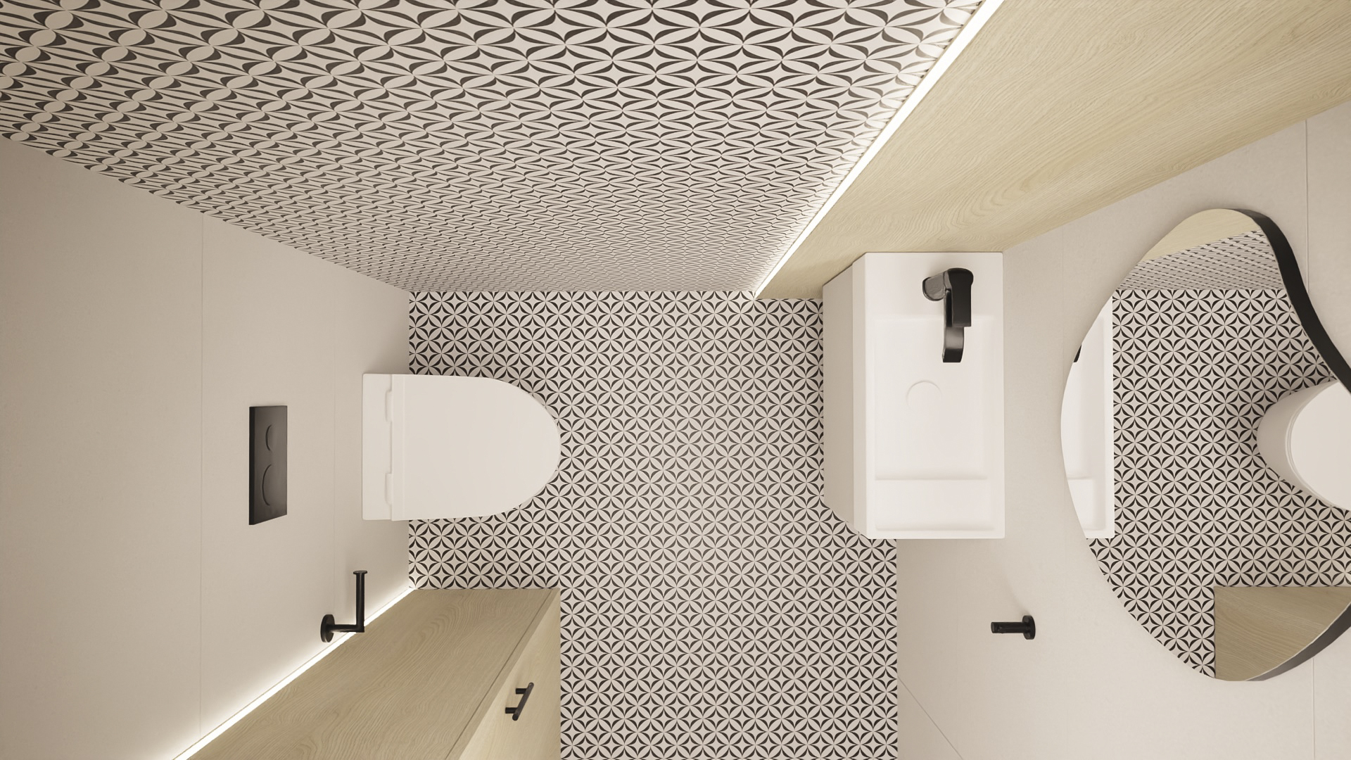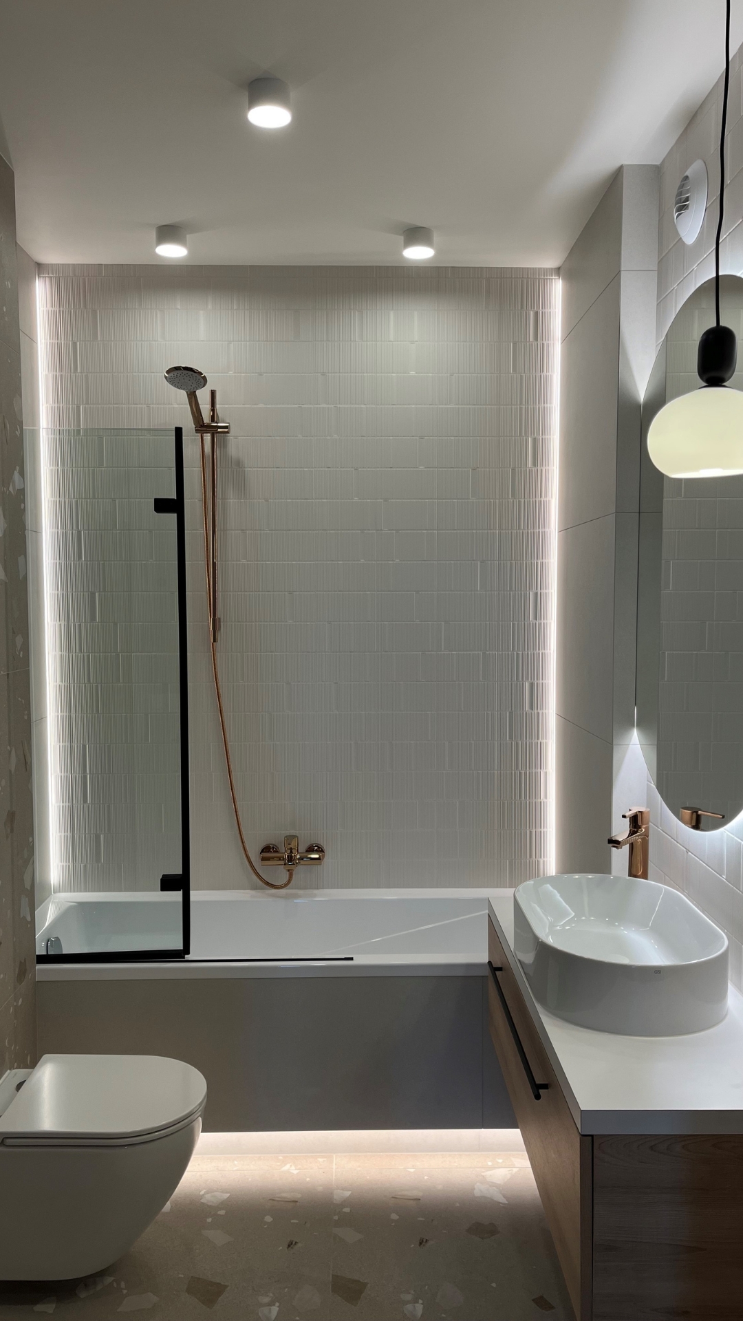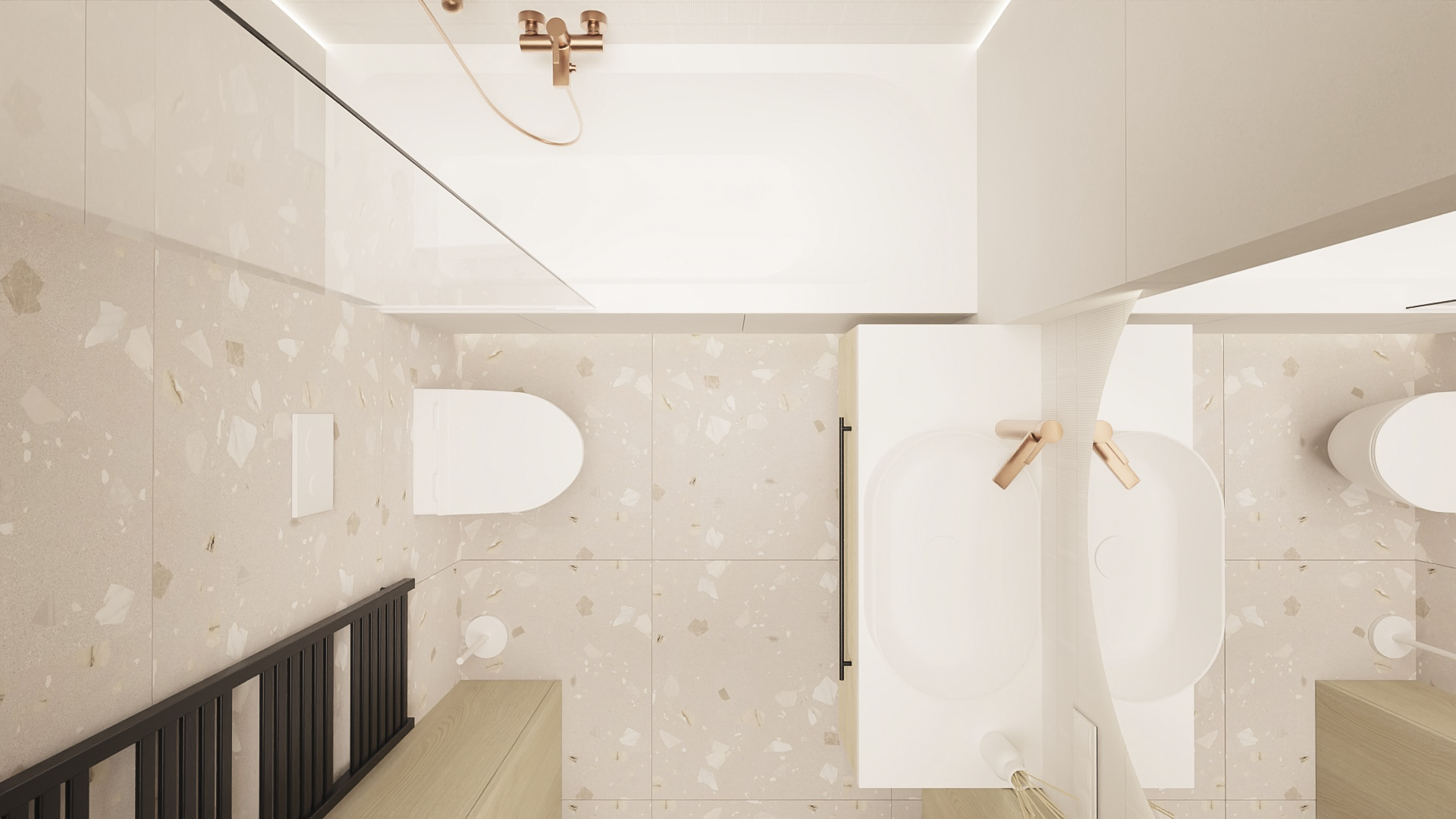 W łazience i WC mamy połączenie jasnych odcieni z kontrastami. Czarne i miedziane dodatki fantastycznie prezentują się w beżowych odcieniach i subtelnym podświetleniu. Tutaj również mamy obecne meble o drewnianym odcieniu, co nadaje spójności z pozostałymi pomieszczeniami.
