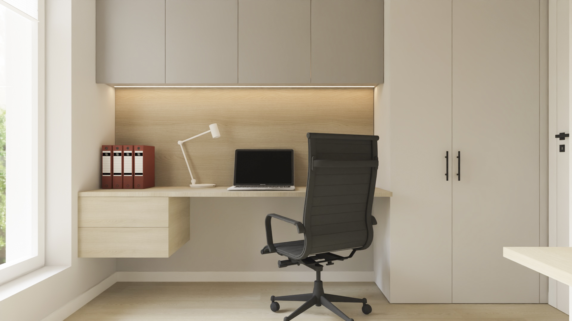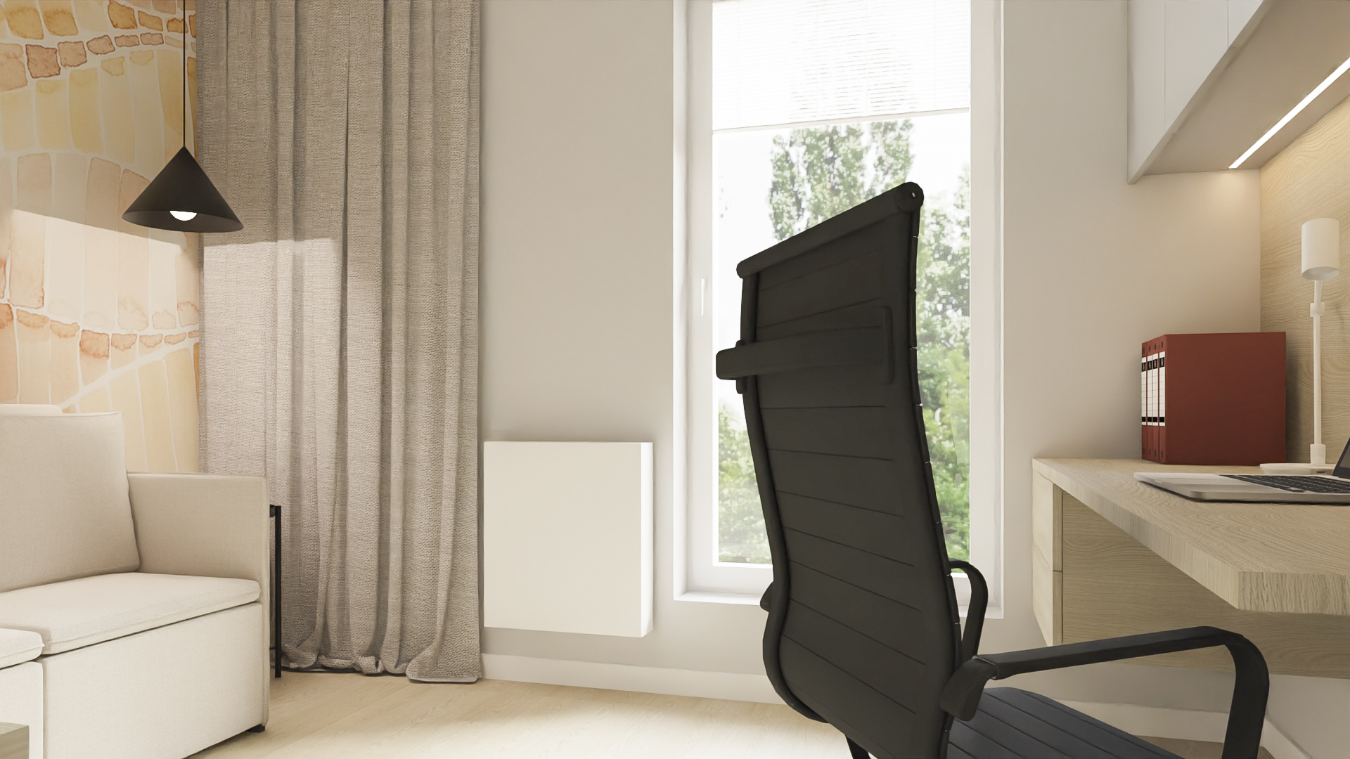 Z kolei gabinet został zaprojektowany z myślą o pracy zdalnej, oferując komfortowe warunki do wykonywania zawodowych obowiązków.