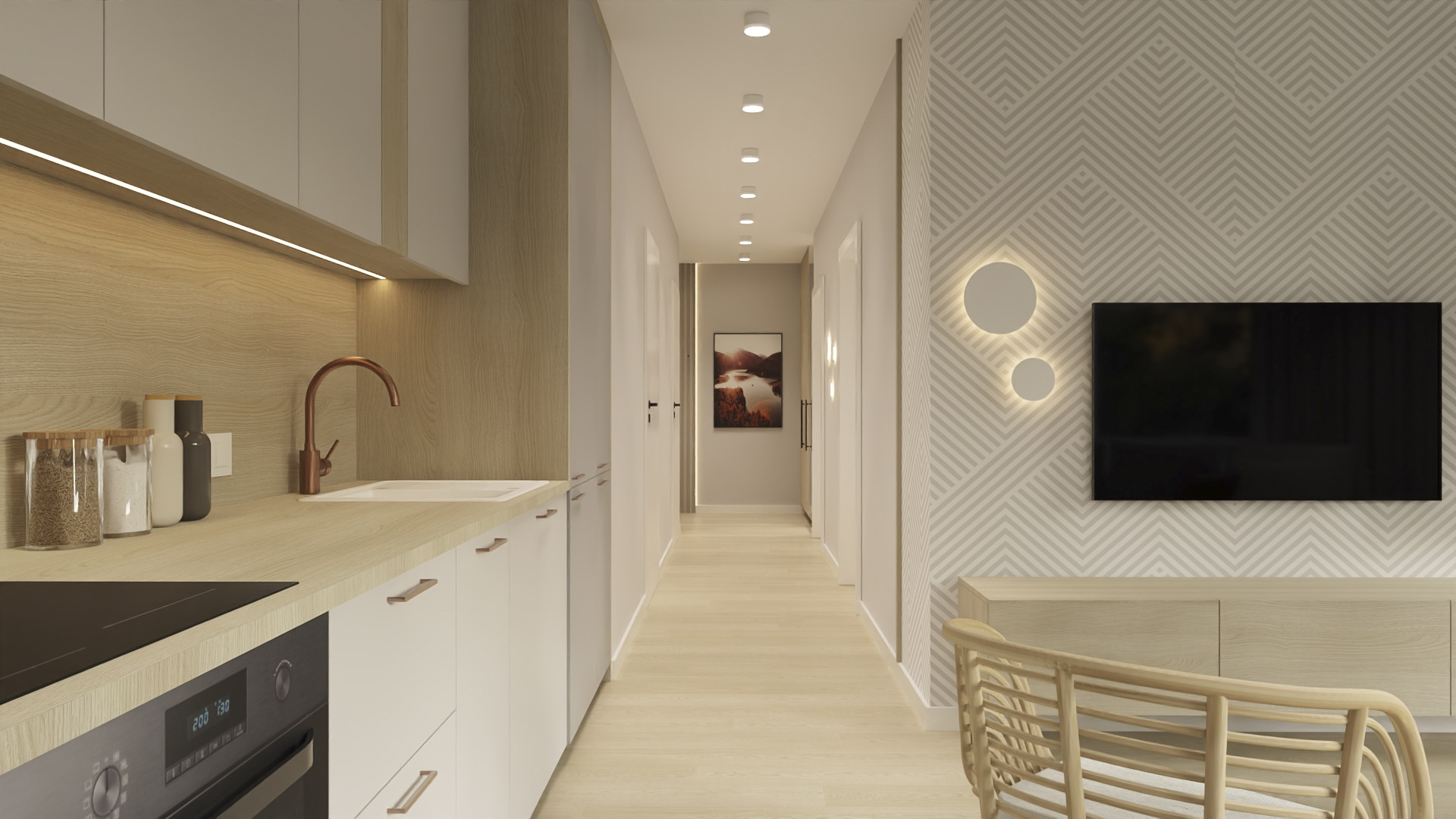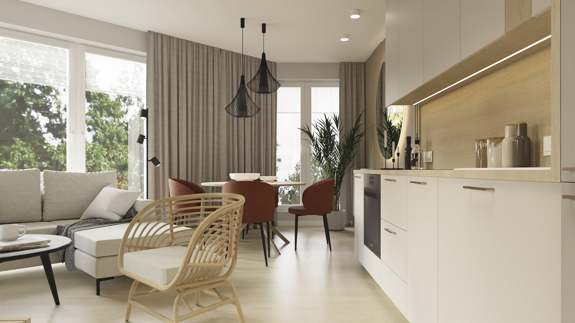 W naszej najnowszej inwestycji mieszkanie zaprojektowano zgodnie z wizją i potrzebami klientów: wnętrze w stylu modern-retro z akcentami boho, tworząc ciepłą, naturalną atmosferę idealną do życia. Poniżej przedstawiamy wizualizacje wykańczanego pod klucz mieszkania.