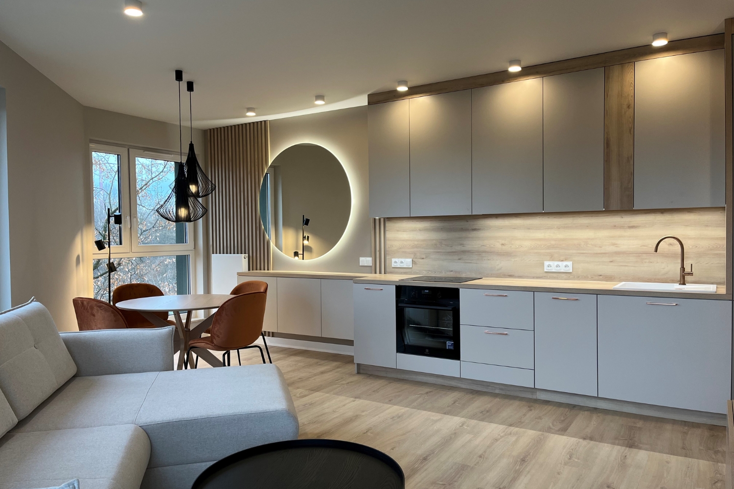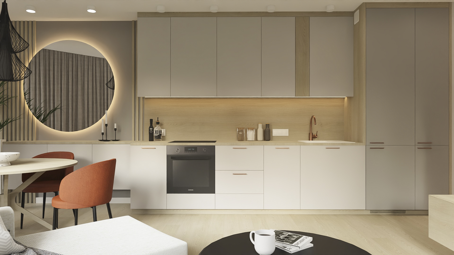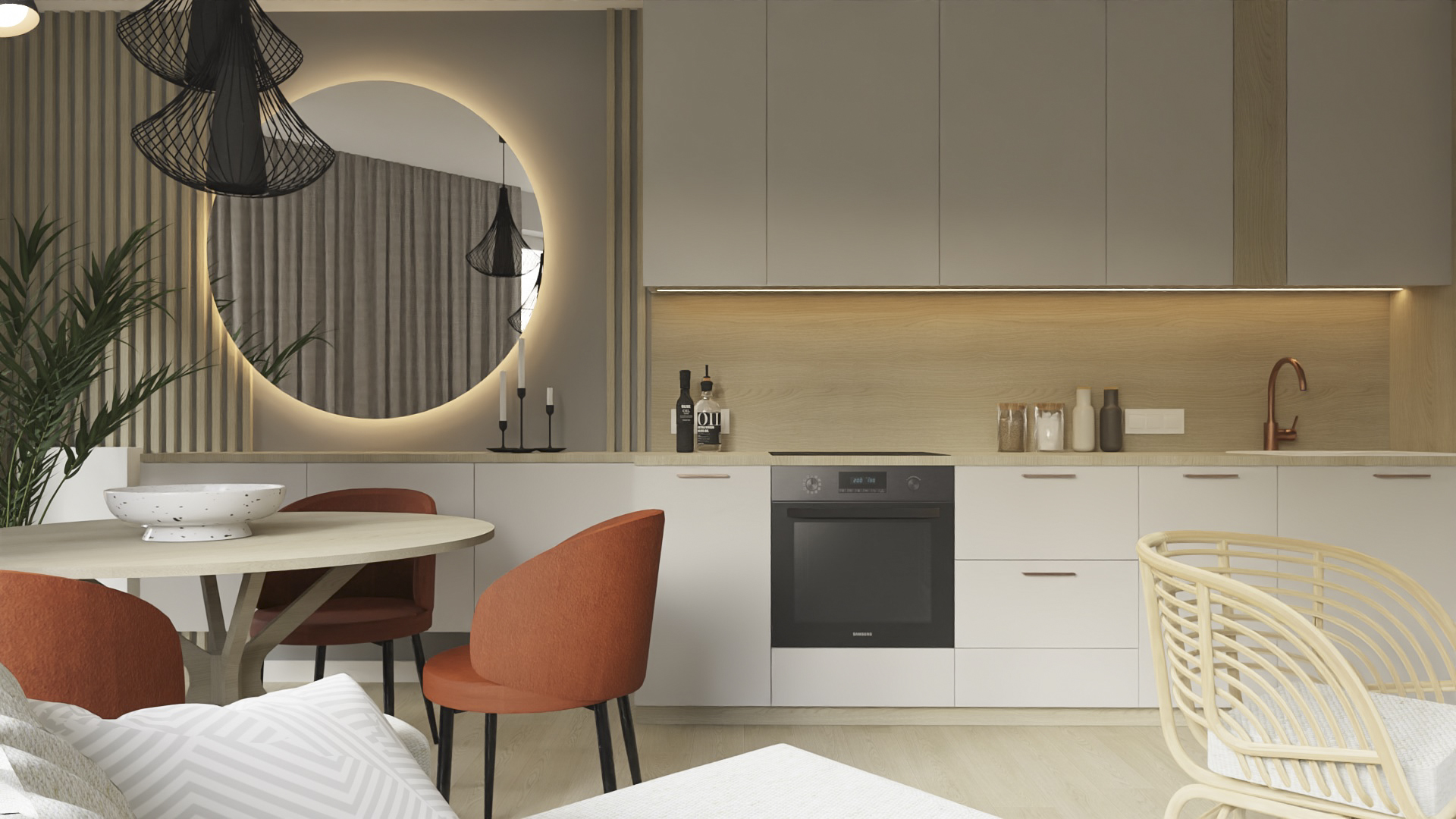 Przestronny salon z aneksem kuchennym to miejsce spotkań i wspólnych posiłków. Meble na nóżkach dodają lekkości przestrzeni, a jasne odcienie i drewniane wykończenie kuchni to nawiązanie do nurtu mid-century. Co więcej, pięknie prezentuje się lustrzana dekoracja z podświetleniem uzupełniona o lamele ścienne. Jest to oryginalne uzupełnienie przestrzeni salonu.