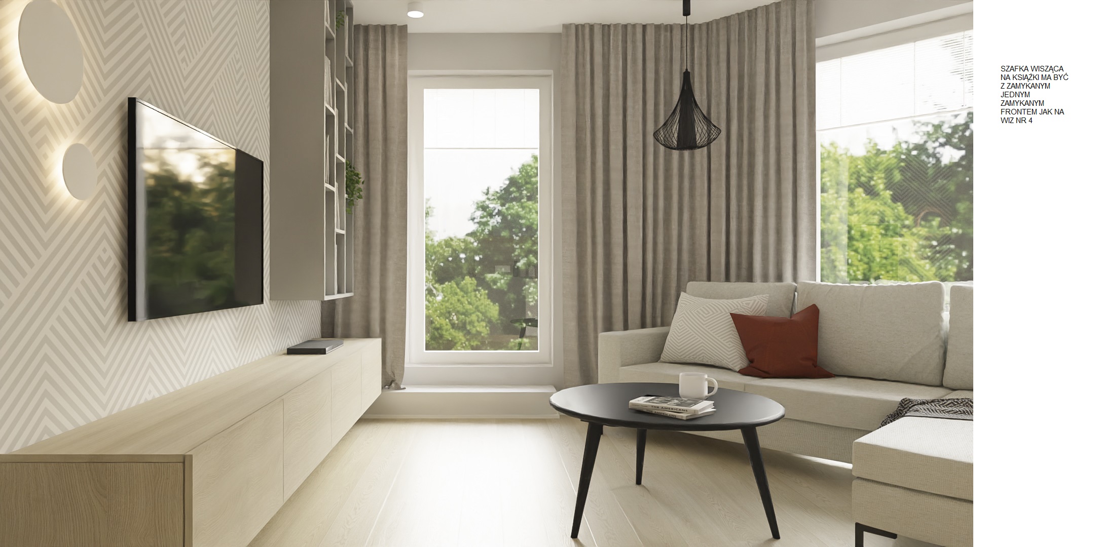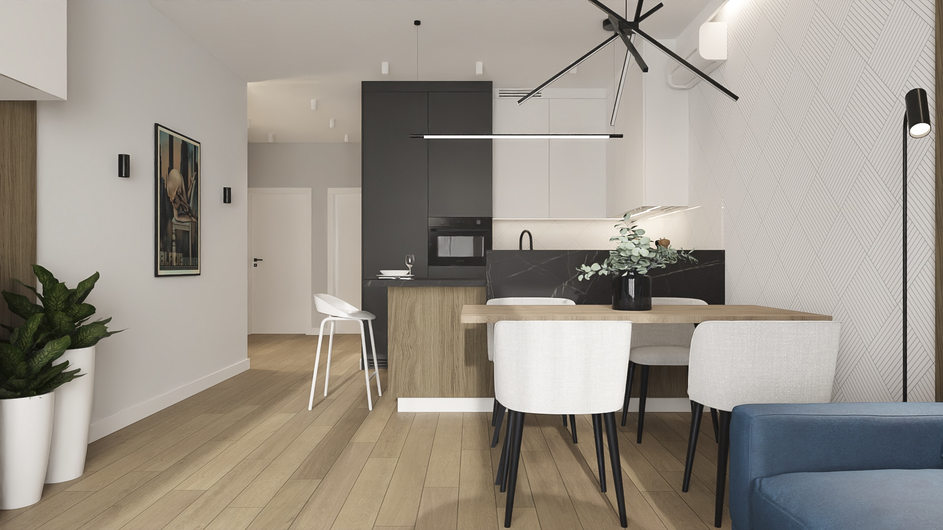 Powyżej przedstawiamy wizualizacje wykańczanego mieszkania w inwestycji Galicyjska Park dewelopera Develia. Jest to mieszkanie zaprojektowane i wykończone w standardzie “wchodzisz i mieszkasz”