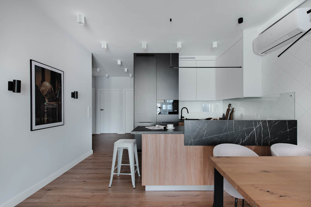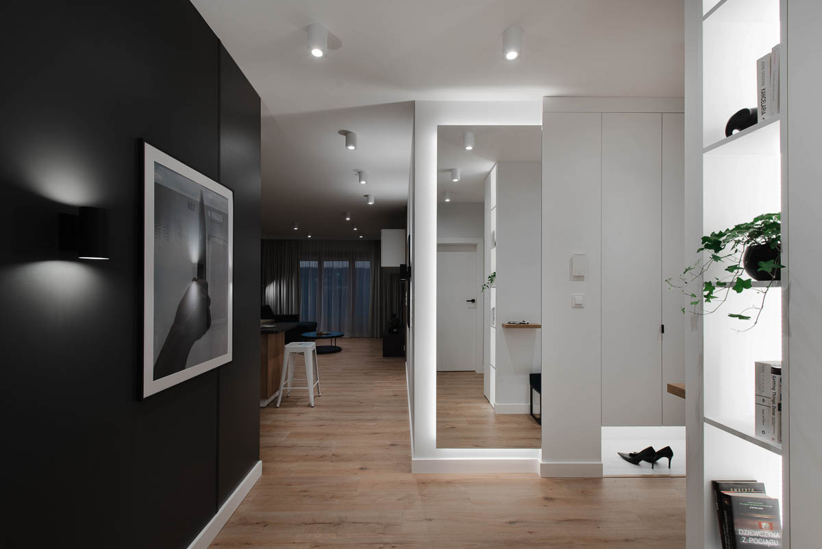 Wnętrze zlokalizowanego w inwestycji Galicyjska Park dewelopera Develia mieszkania zostało zaaranżowane w motywie głębokiej czerni. Dlatego oprócz dekoracji i drobnych dodatków w kolorze czarnym, takich jak klamki, akcesoria łazienkowe, kratki wentylacyjne czy maskownice do zasłon, to klientowi zależało na pomalowaniu sufitów na czarno. Wszystkie meble zaprojektowane i wykonane na wymiar w ciemnych odcieniach, a zastosowane oświetlenie dyskretnie podkreśla zastosowane materiały i faktury. Cudownie przełamującym, a zarazem akcentującym przewodnim motyw mieszkania jest drobny dodatek w postaci jasnej pufki w przedpokoju. Jest to ruchomy mebel ułatwiający codzienne szykowanie się do wyjścia. Co więcej, warto również zwrócić uwagę na efektywne wykorzystanie przestrzeni pod domowe biuro.