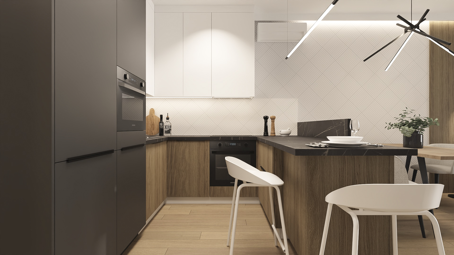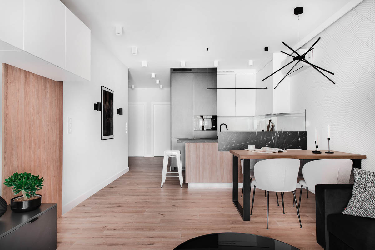 W prezentowanym apartamencie dominują ciemniejsze odcienie drewna, które idealnie komponują się z kontrastującą grą bieli i czerni, tworząc elegancką, ale jednocześnie ponadczasową aranżację wnętrza. To gustowne połączenie kolorów nadaje przestrzeni nowoczesny, ale przytulny charakter, który będzie cieszył oko przez wiele lat. Wystrój wnętrza został zaprojektowany z myślą o praktycznym, codziennym użytkowaniu, ale również o estetyce, która zachwyca.