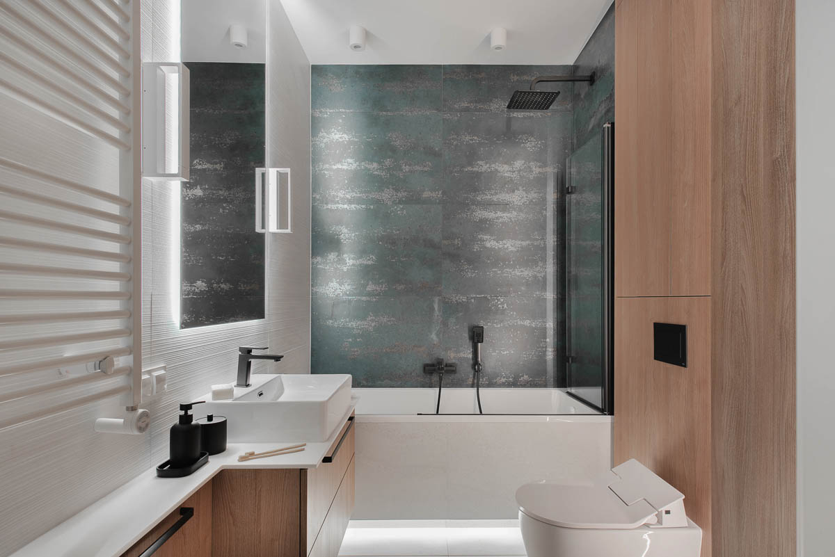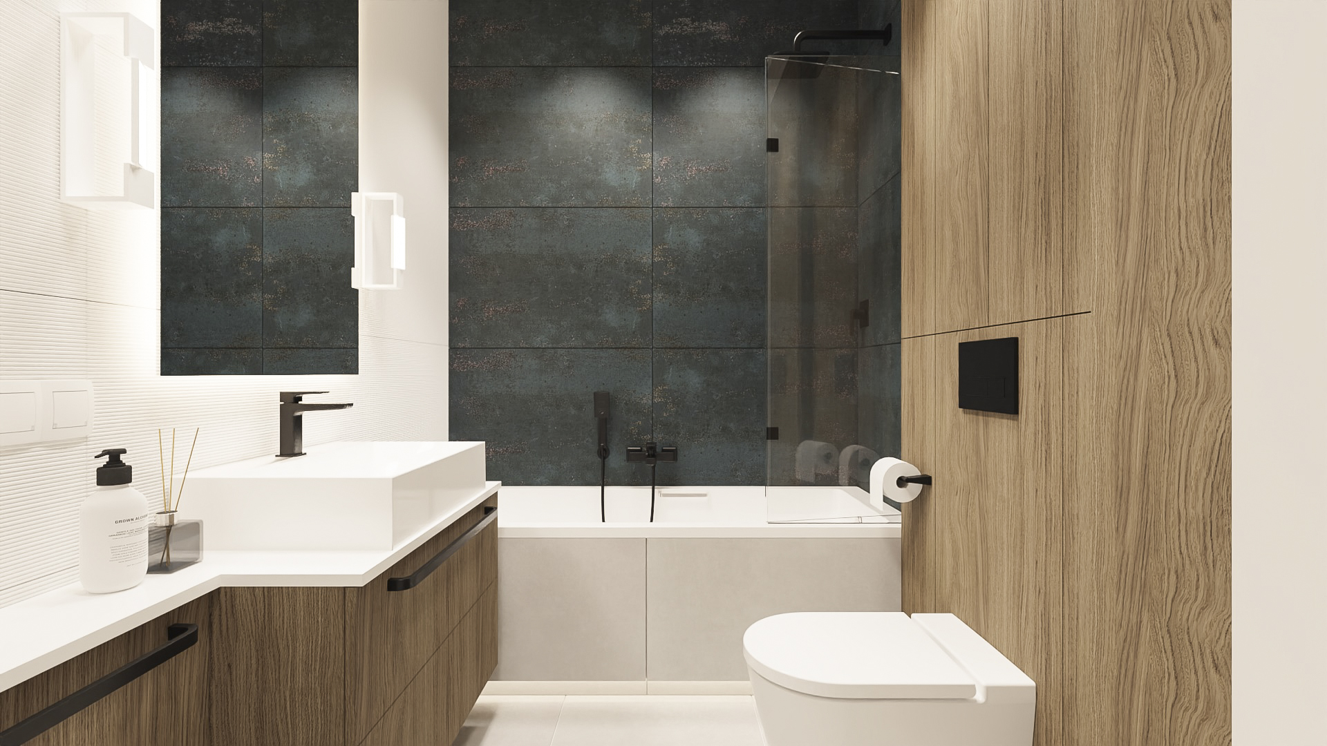 W projektowanym i wykańczanym mieszkaniu przewidziano dwie łazienki. Zgodnie z gustami klienta, stanowią one całkowite przeciwieństwa i wyróżniają się nie tylko wyposażeniem, ale również motywem przewodnim. W jednej znalazła się wolnostojąca wanna, dwie nablatowe umywalki, a całość skomponowano w jasnych i szarych tonacjach z uzupełnieniem drewnopodobnych płytek. Natomiast drugą łazienkę budują ciemne kolory. Niezwykle elegancko prezentuje się połączenie płytek o oryginalnym wzorze z wolnostojącą umywalką, a pomieszczenie wyposażono w ściankę walk-in z odpływem liniowym.