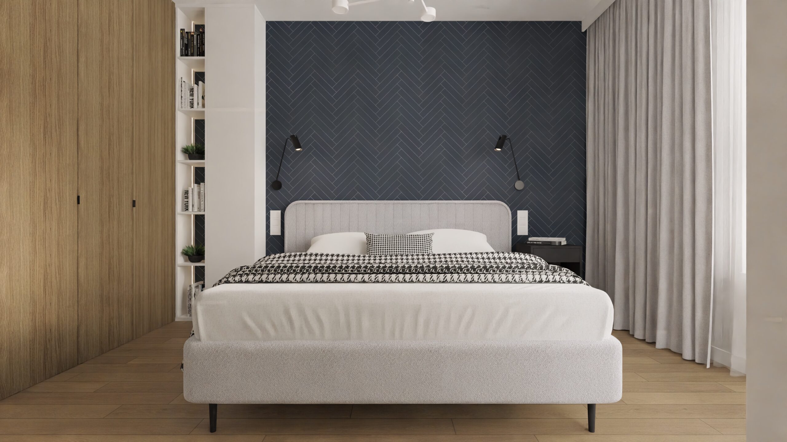 W sypialni zastosowano ciemny motyw na ścianach, co wprowadza spokojną i relaksującą atmosferę, idealną do wypoczynku po długim dniu.