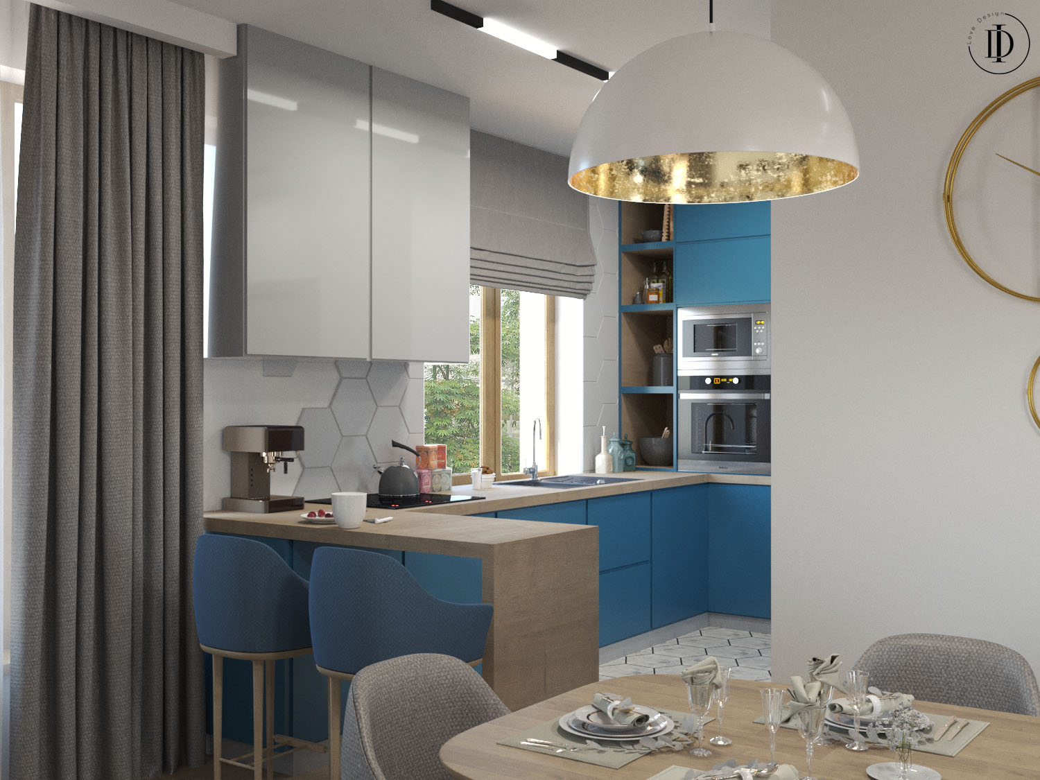 Zabudowa aneksu kuchennego została drobiazgowo opracowana, aby zmaksymalizować dostępną przestrzeń użytkową. Długi na trzy metry blat został zakończony narożnikiem przy oknie, który jest dodatkową przestrzenią roboczą. Dodatkowo, wysoki stół świetnie sprawdzi się w roli domowego biura. Na szczególną uwagę zasługuje dizajnerskie oświetlenie nadające przestrzeni kuchennej nowoczesnego wymiaru.