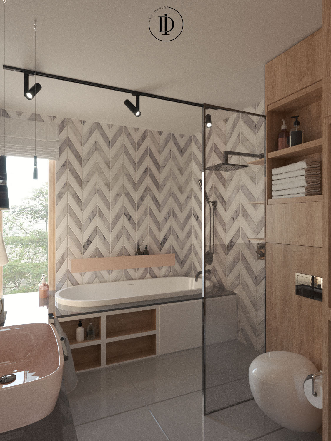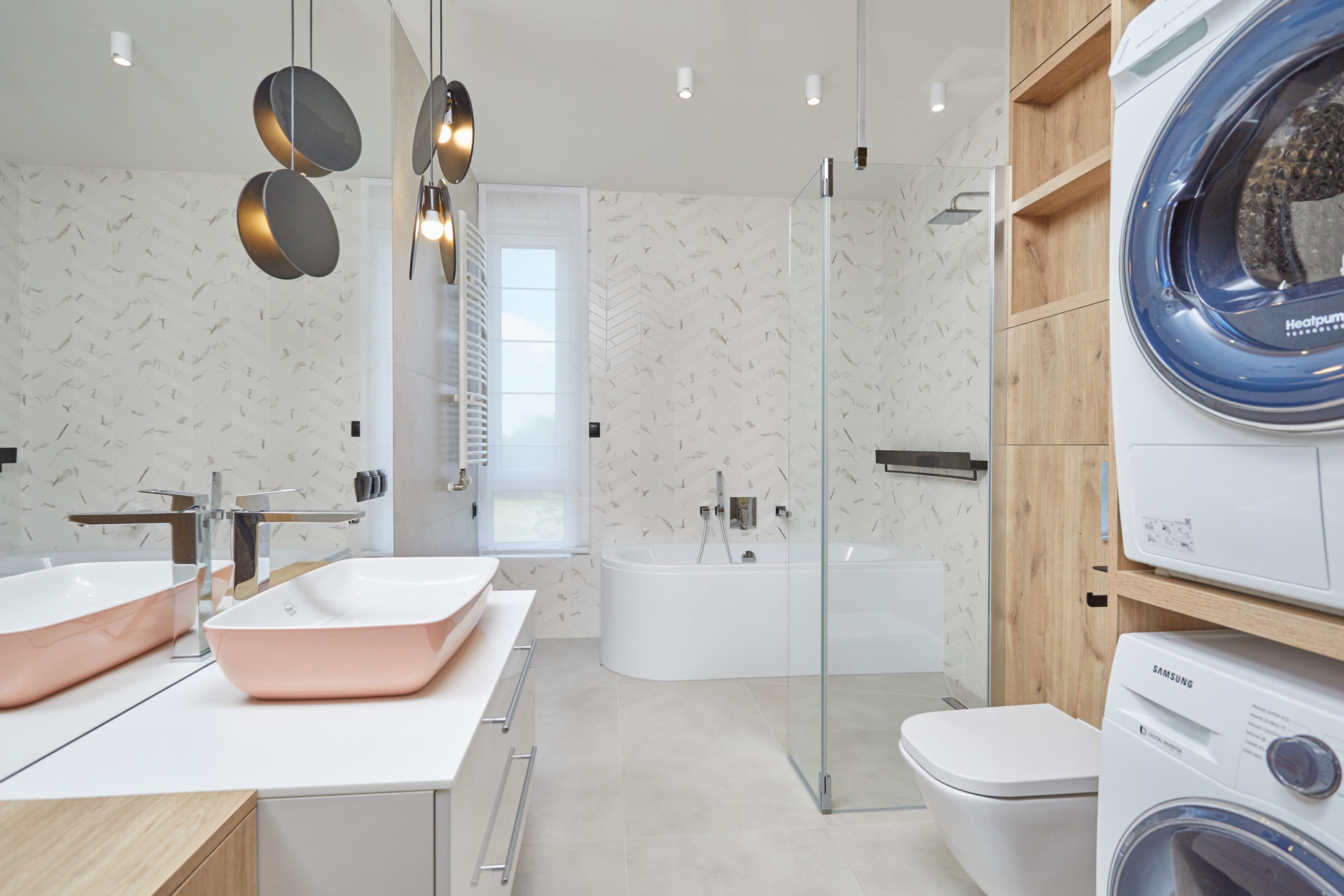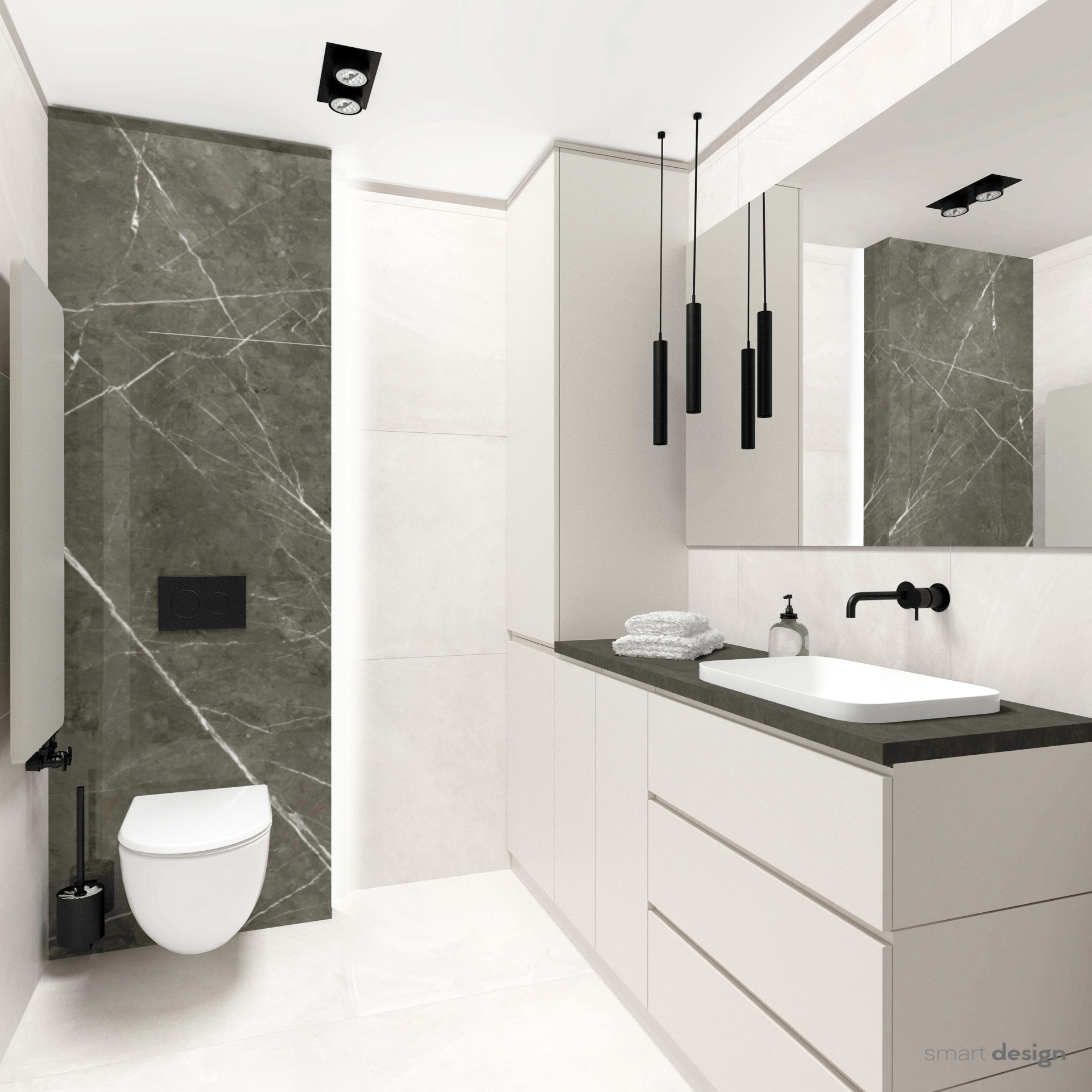 Płytki o marmurowym wzorze fantastycznie prezentuje się w połączeniu z geometrycznymi kształtami o drewnopodobnej barwie. Dlatego efekt finalny zaprojektowanej i wykończonej łazienki jest cudowny. To wnętrze eleganckie, ale i minimalistyczne. Zaprojektowanie i wykończenie łazienki w uwzględnieniem gustów i potrzeb naszych klientów jest elementem usługi pod klucz “wchodzisz i mieszkasz”