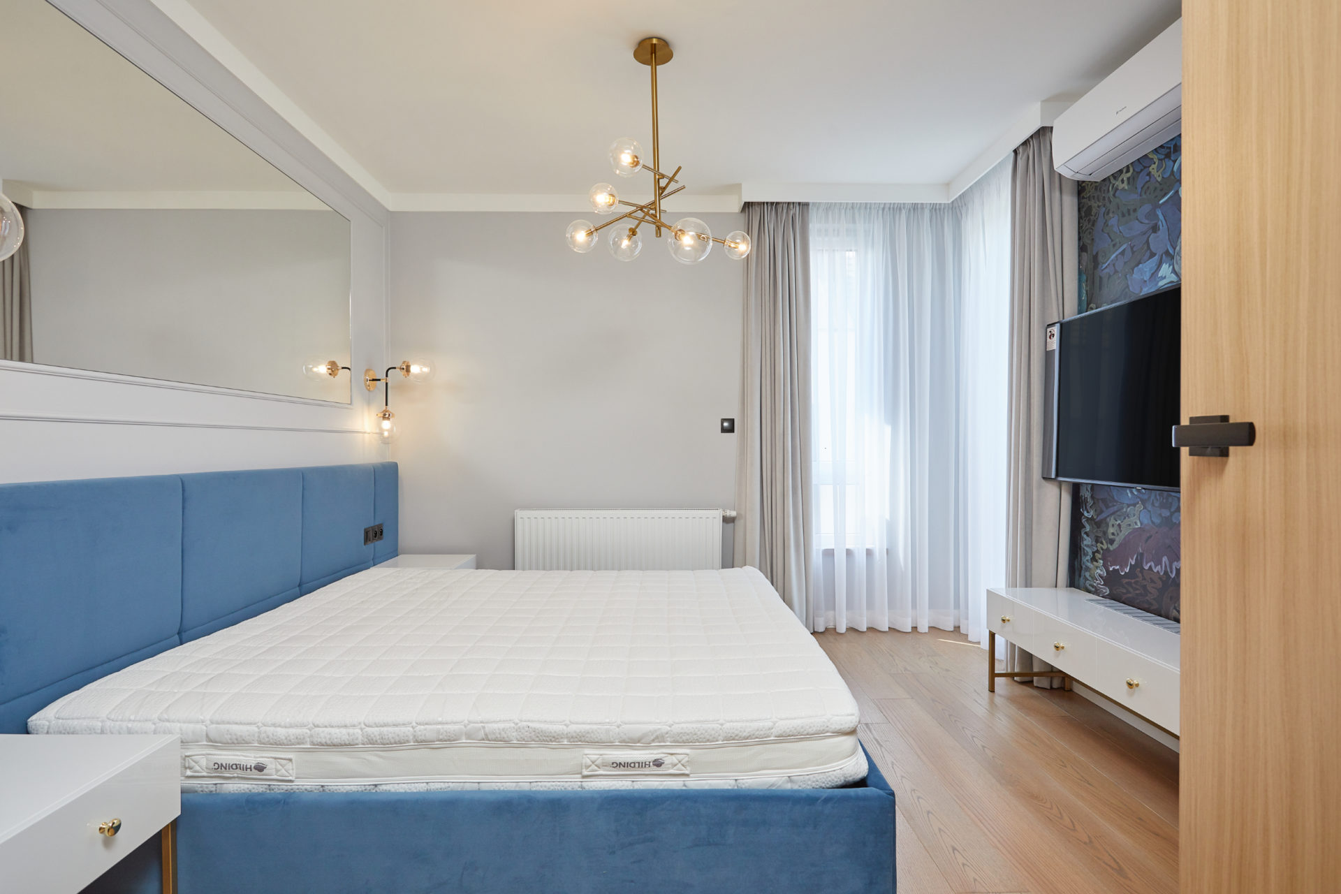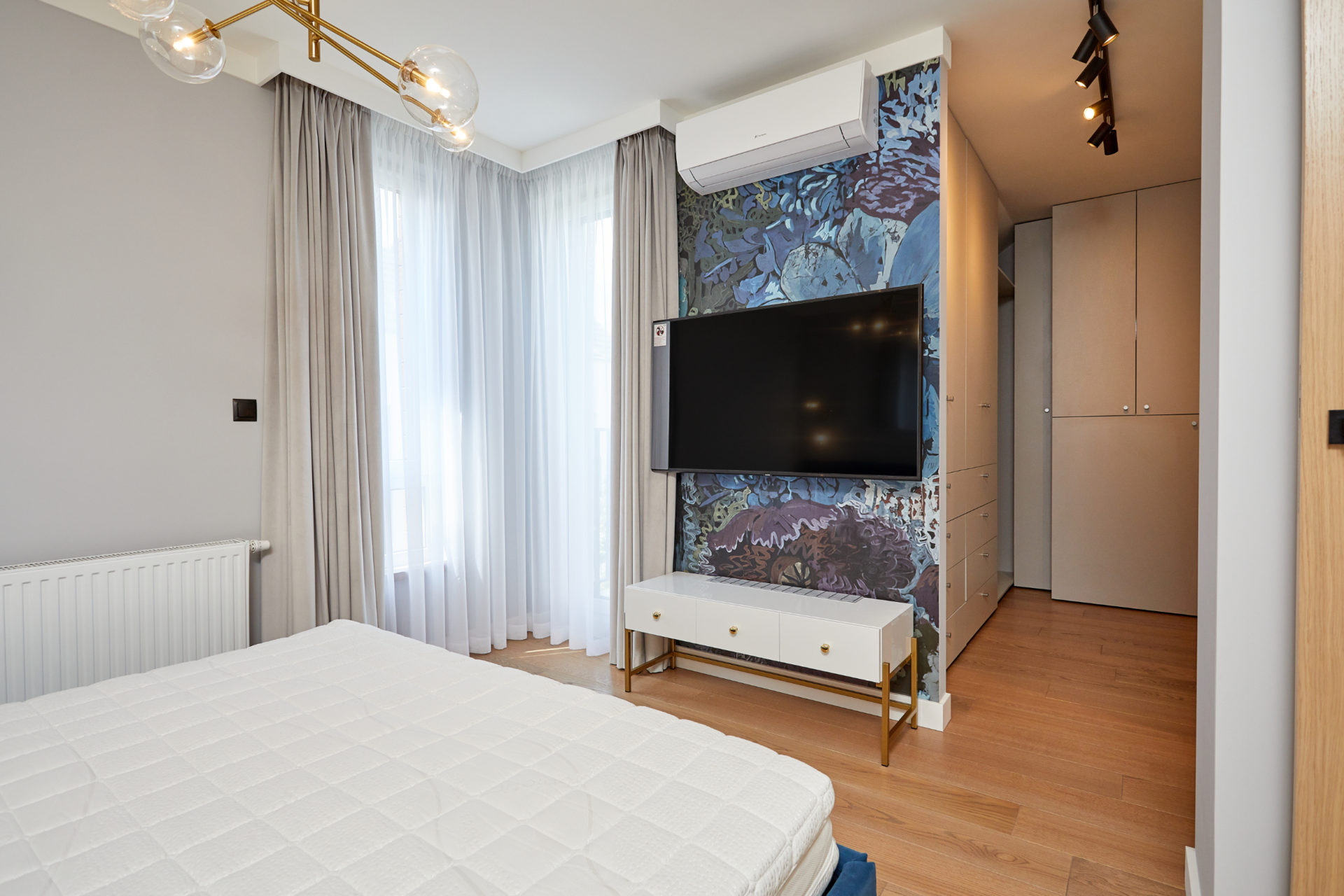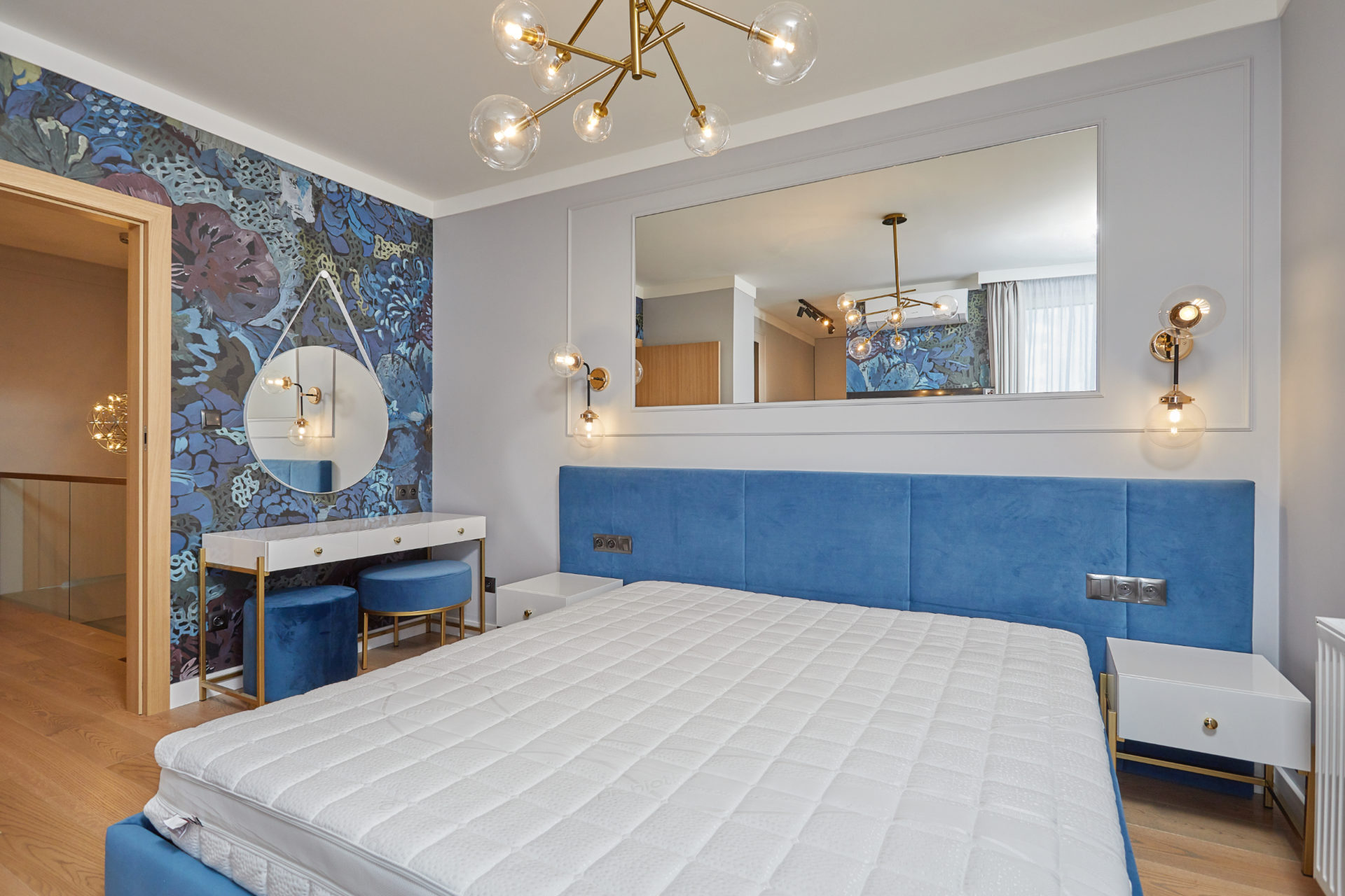 Prace nad realizacją tego apartamentu trwały 4 miesiące. Warto było czekać! Założeniem było zaprojektowanie i zrealizowanie mieszkania w wysokim standardzie, wykorzystując produkty najlepszych światowych marek. Lakierowane meble, specjalnie skonstruowane łóżko, wysokiej klasy sprzęty AGD, w tym oryginalny model klimatyzatora LG Artcool Gallery nadały temu wnętrzu elegancji i prestiżu. Dodatkowo jasna łazienka, zdobiona złotą mozaiką. Piękne lustro łazienkowe wykonał jeden z najlepszych krakowskich projektantów jako pojedynczy, autorki egzemplarz. Armatura łazienkowa znanych marek: Villeroy&Boch, Huppe oraz Hansgrohe Axor. Są to produkty, które zachwycają wysoką klasą i jakością.