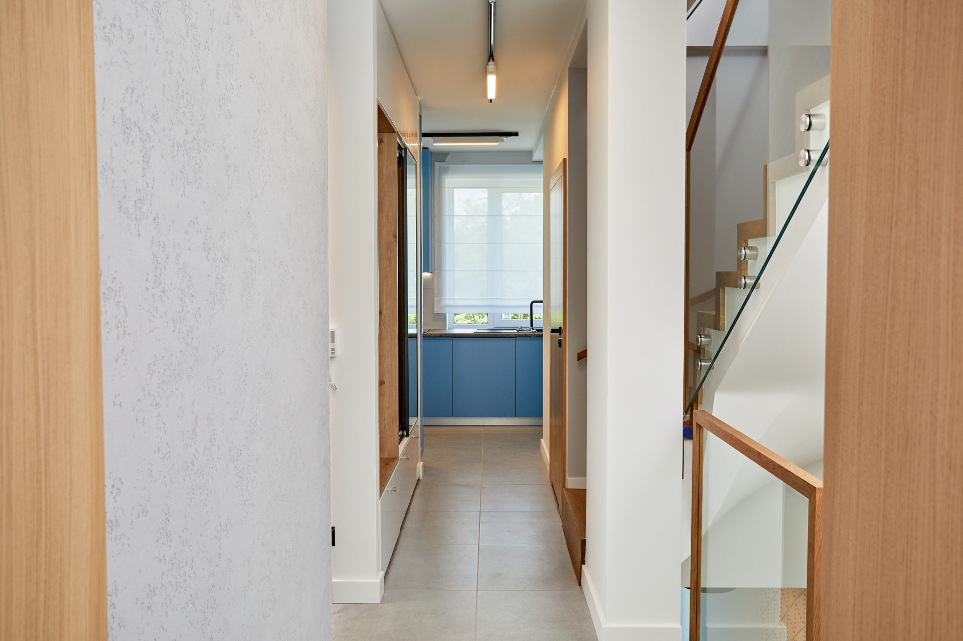 W hallu zastosowano oświetlenie chowane w sufit oraz pojemną szafę wykonywaną na wymiar zgodnie z projektem. Co więcej, zastosowanie przeszkleń, chowanego oświetlenia i lekkich lameli dekoracyjnych miało na celu optyczne zwiększenie przedpokoju.