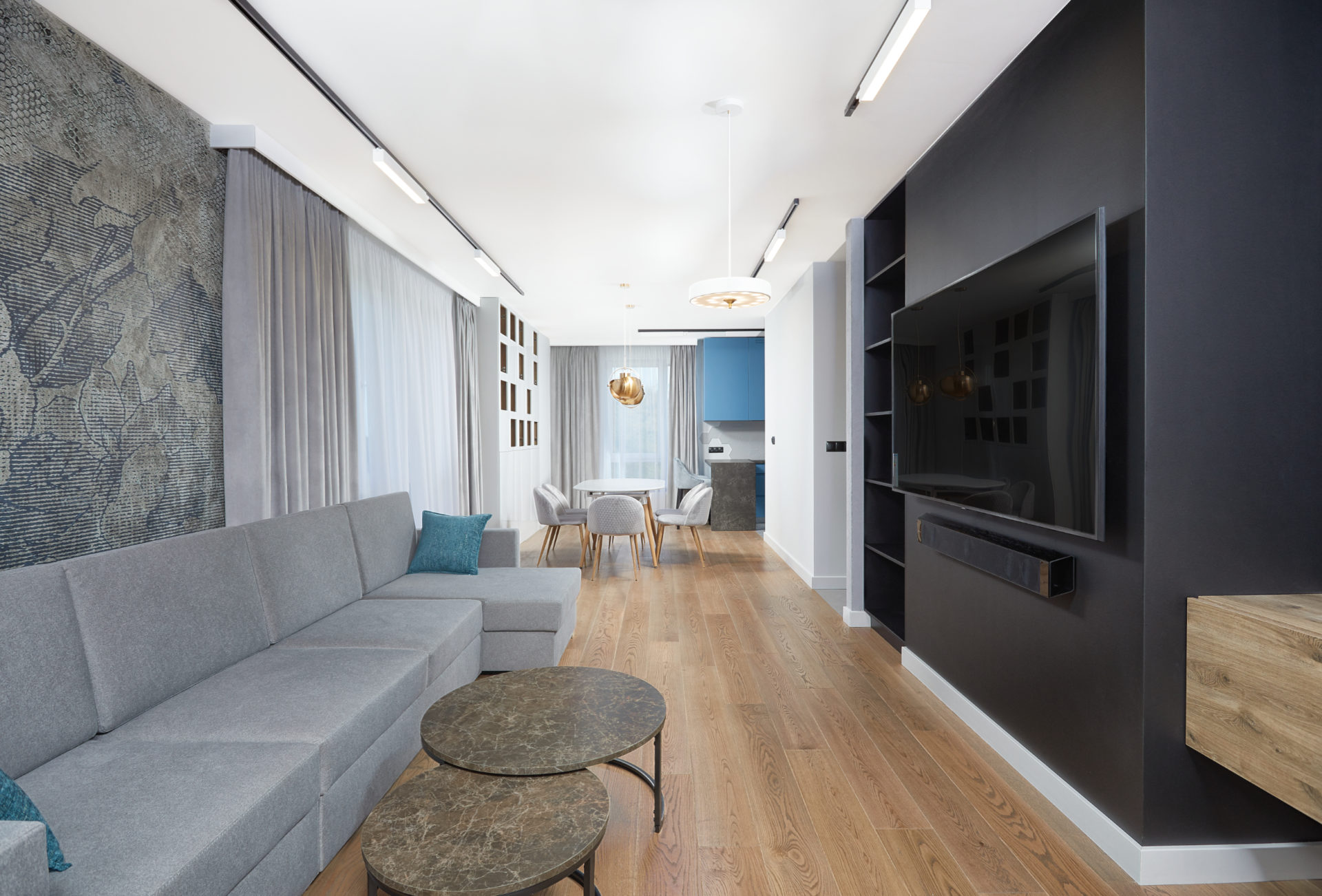 W prezentowanym mieszkaniu zastosowaliśmy wielkoformatowe spieki kwarcowe, specjalna winylową podłogę na podłożu korkowym, wypalany grafitowy blat, meble w okleinie naturalnej i lakierze. Klimatyzację, chowane w sufit oświetlenie i ogrzewanie wnętrza spięliśmy w jeden spójny system inteligentnego domu sterowany przez firmę Grenton. Wszystkie zastosowane rozwiązania sprawiają, że mieszkanie należy do najefektywniejszych i zarazem najdroższych, jakie wykonywaliśmy.