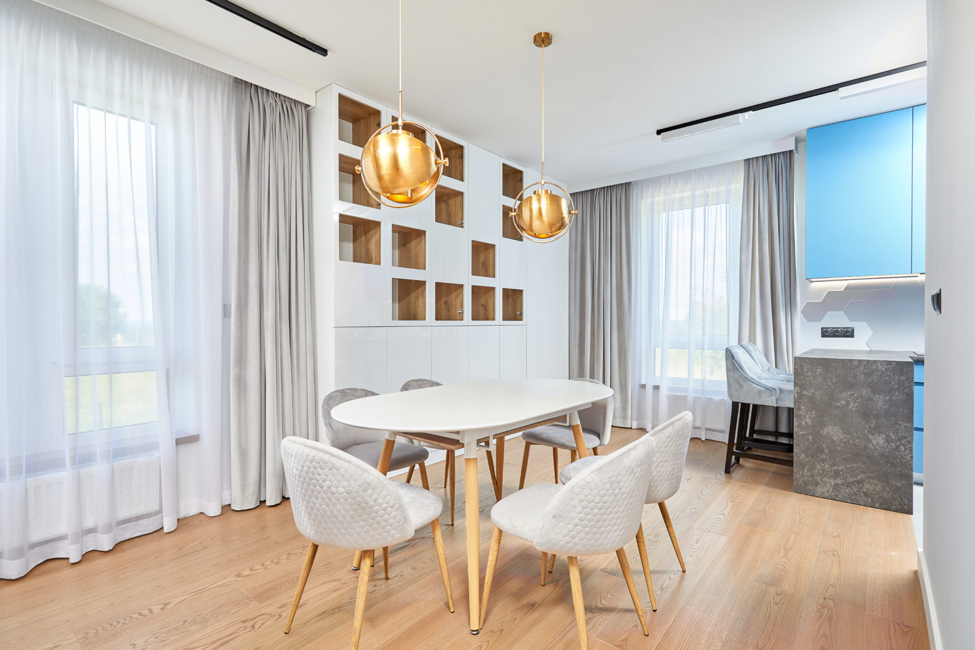 Klasyczne połączenie szarości z drewnem w wykończonym pod klucz mieszkaniu prezentuje się fantastycznie. Designerski zegar ścienny ciekawie łączy się z fototapetą w leśnym motywie. Pięknie prezentuje się oświetlenie nad jadalnianym stołem, które nadaje całemu wnętrzu elegancji.