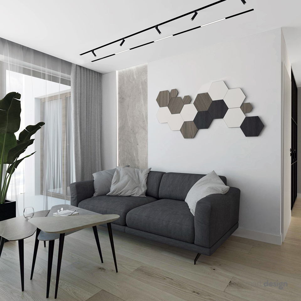 Mieszkanie o metrażu 46,5 m2 składa się z salonu z aneksem kuchennym, osobnej sypialni, ustawnego hallu i łazienki. Przedstawione na wizualizacjach wnętrza zostały zaprojektowane i wykończone „pod klucz” z myślą o komforcie użytkowników, uwzględniając autorskie projekty mebli i minimalistyczne gusta klienta.