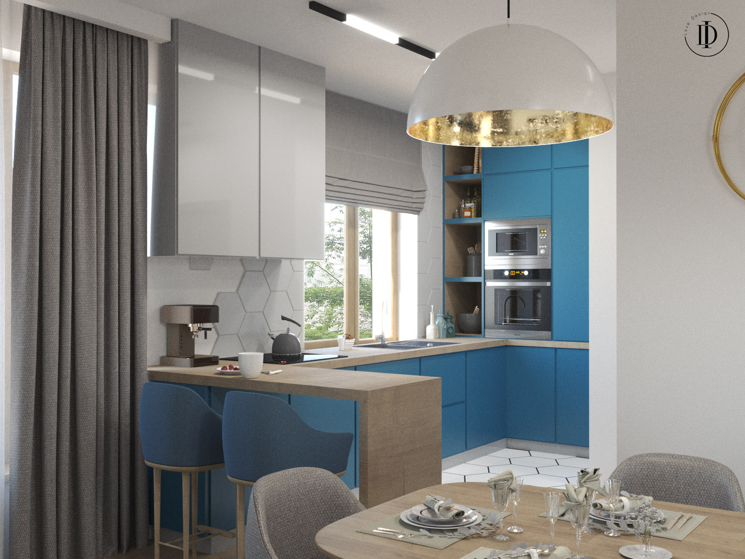 Zaprojektowane i wykończone pod klucz mieszkanie łączy nowoczesność z nutą eklektyzmu. Motywem przewodnim jest drewno i szarość, które zaakcentowano turkusowymi elementami wystroju. Stonowana i ciepła paleta kolorystyczna sprawia, że zaprojektowane wnętrze jest przytulne i stylowe. Zastosowanie przeszkolonych drzwi pomiędzy hallem a gabinetem zapewnia dostęp do światła dziennego wewnętrznej części mieszkania i optycznie zwiększa przestrzeń przedpokoju. Co więcej, industrialne drzwi doskonale się wpasowują się w elegancką formę drewna i szarości, nadając wnętrzu harmonii i powagi.