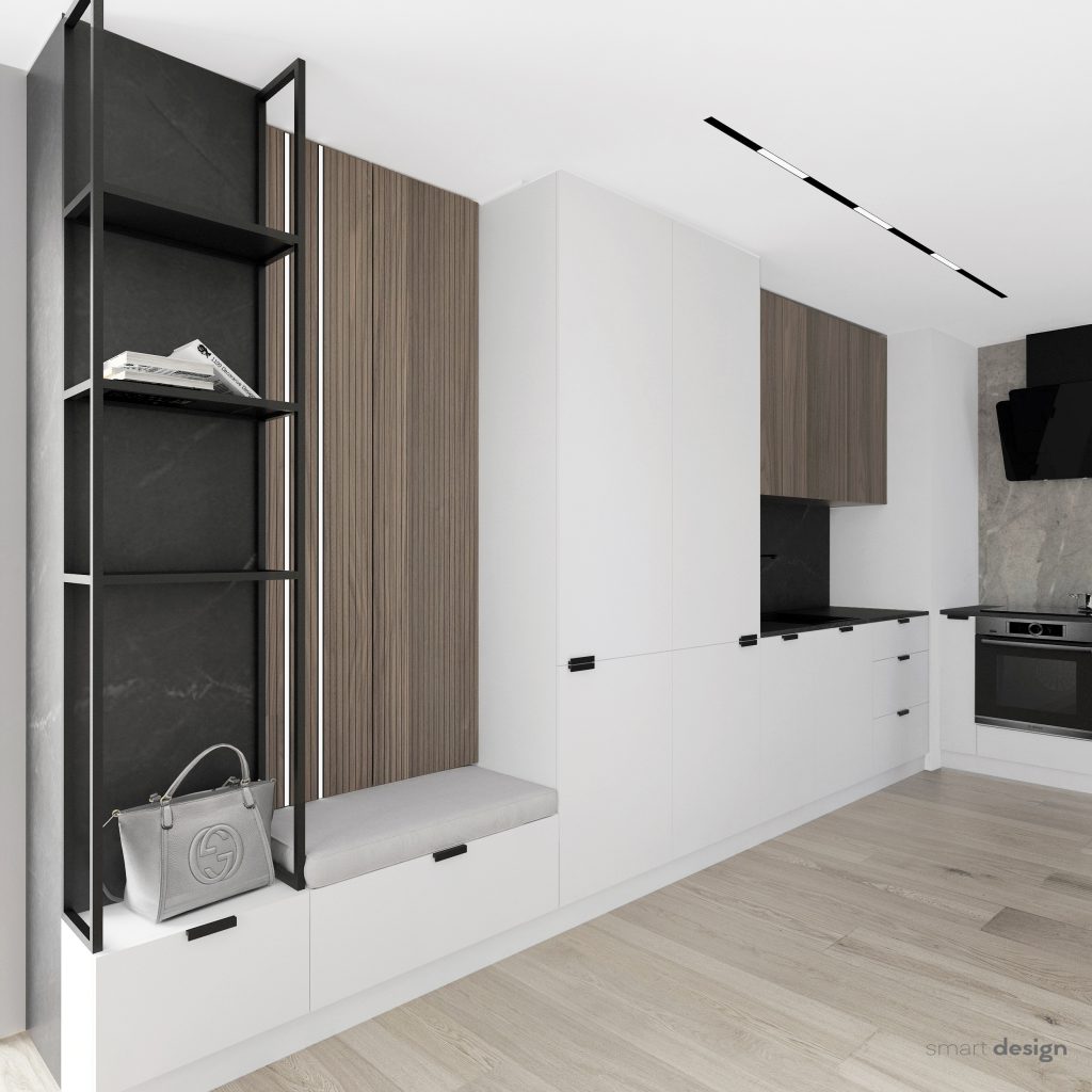 Beside apartments, we created the entrance hall to the building. A very interesting combination of natural wood veneers, specially patinated copper made by an artist designer, and graphite basalt. The effect is complemented by well-chosen lighting which reflects well in a glass wall made of Lacobel glass. An interior that pleases the eye.