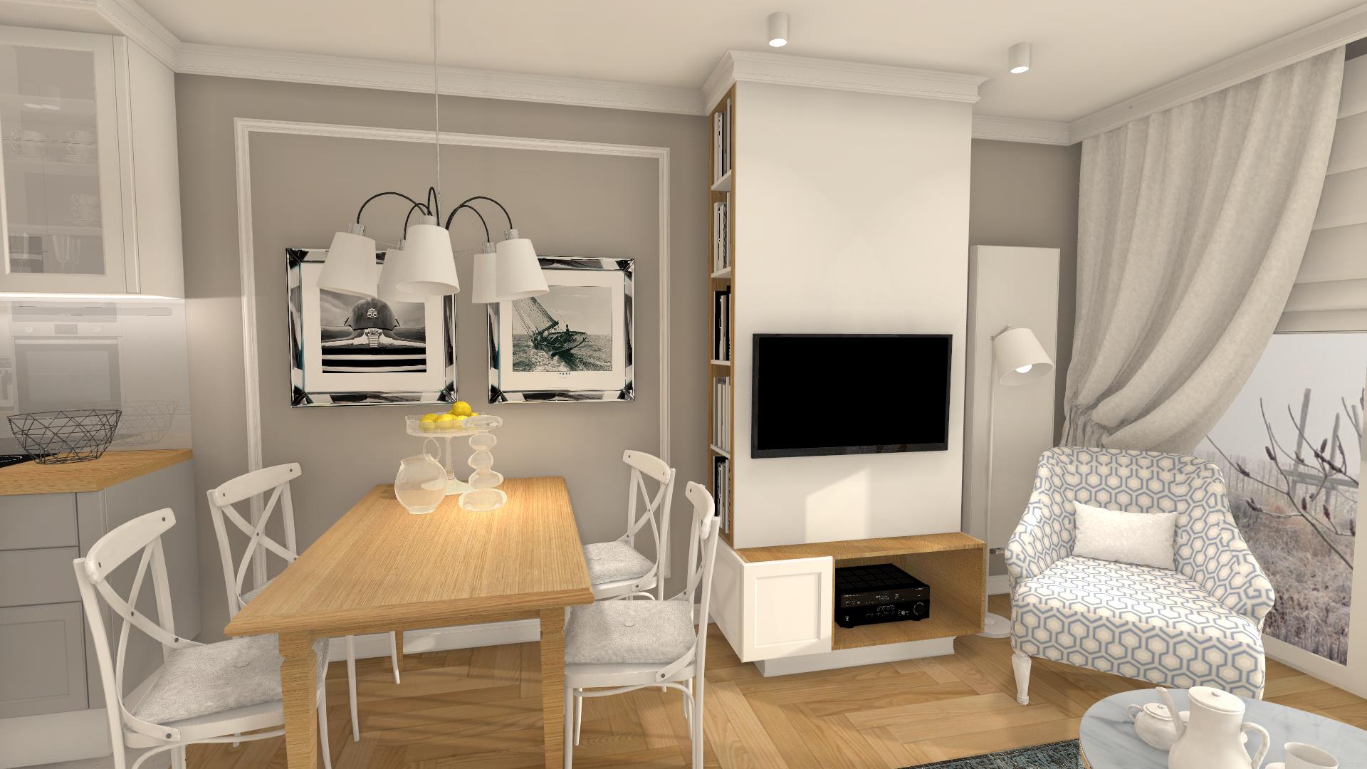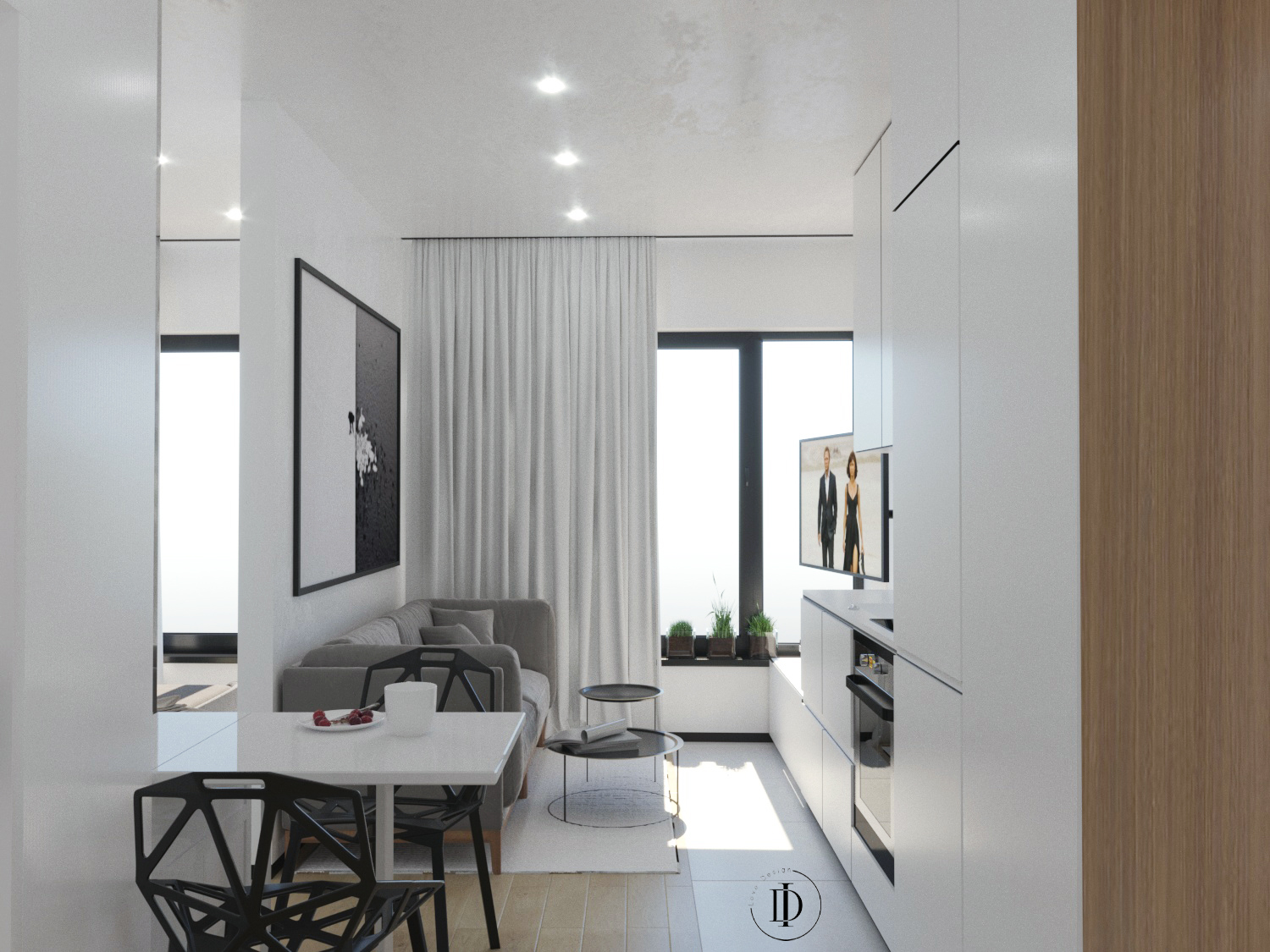 The apartment is for rent, made middle-class standard. The final effect is amazing. The living room with a kitchenette has been perfectly designed. The bookcase with a space for home theater turned is original spacesaving solution.