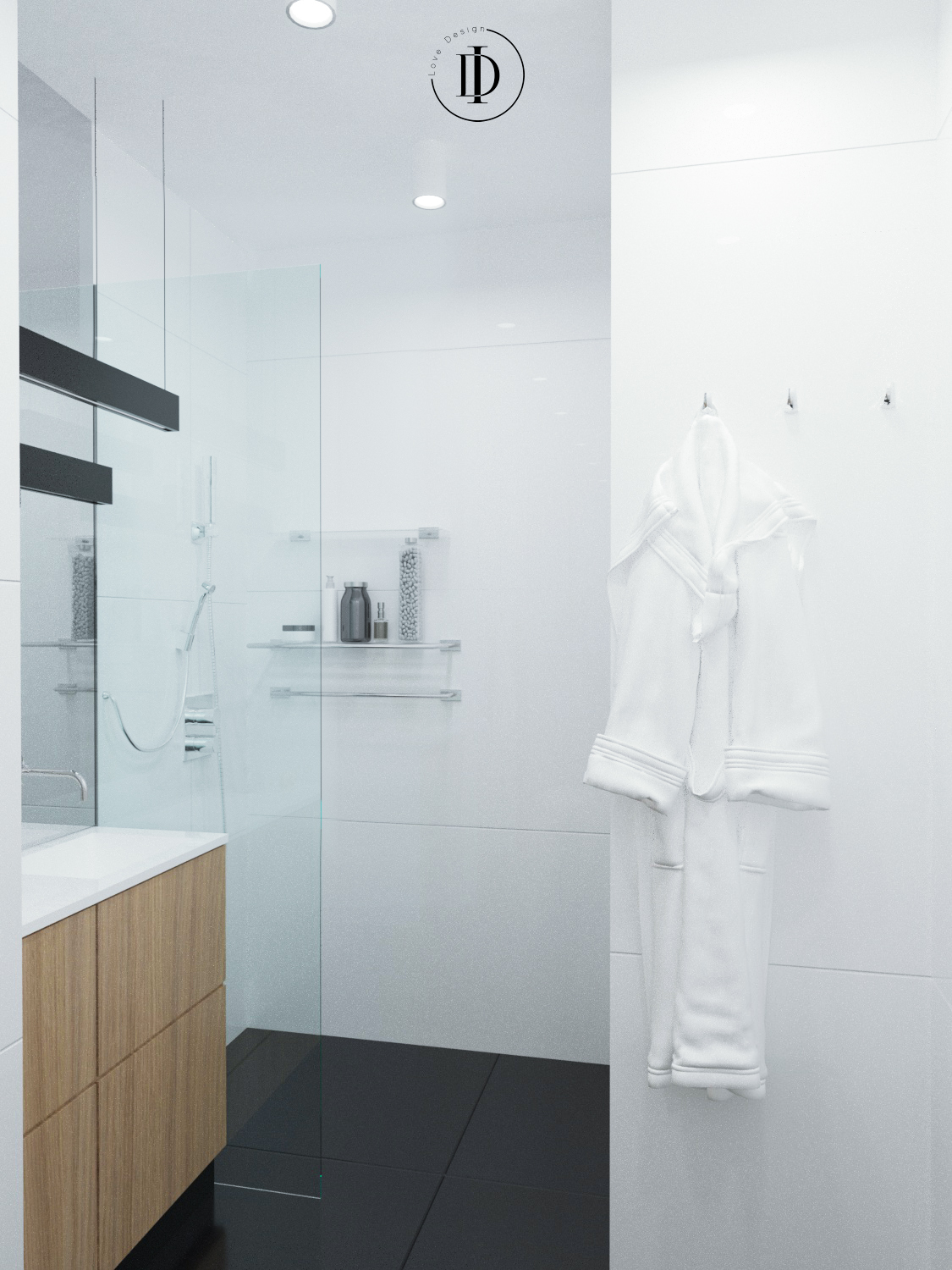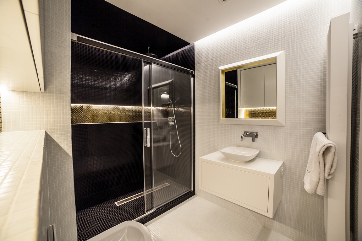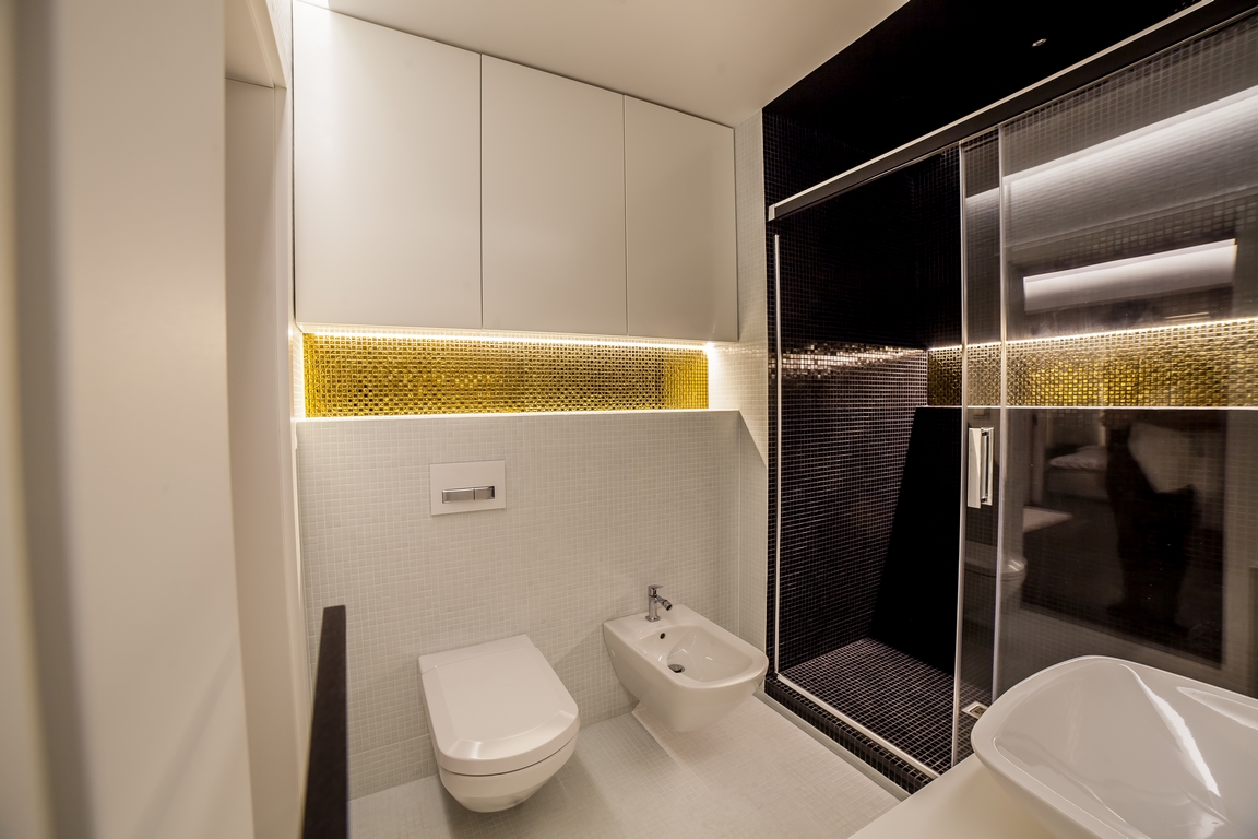 In the show apartment, we used only branded items: Villeroy&Boch bathroom ceramics, Apavisa floor tiles, Axor Hansgrohe faucets, Vasco radiators, Huppe shower