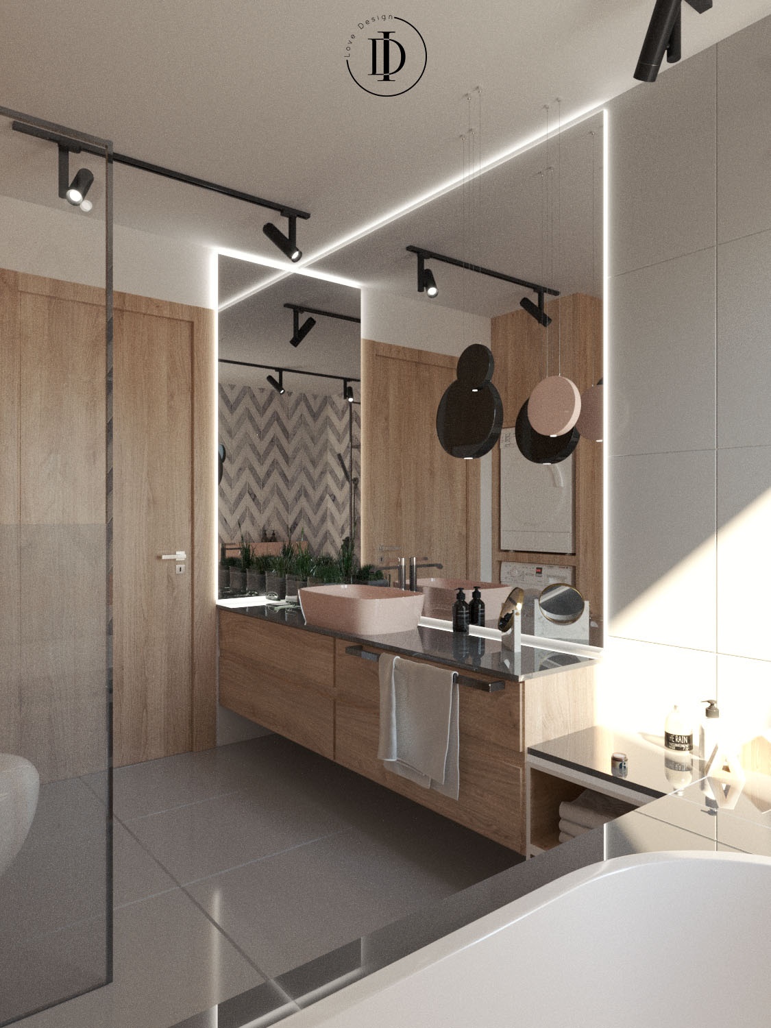 In the bathroom and toilet we have a combination of light shades with contrasts. Black and copper accessories look fantastic in beige shades and subtle backlighting. Here, too, we have furniture with a wooden shade, which gives consistency with other rooms.