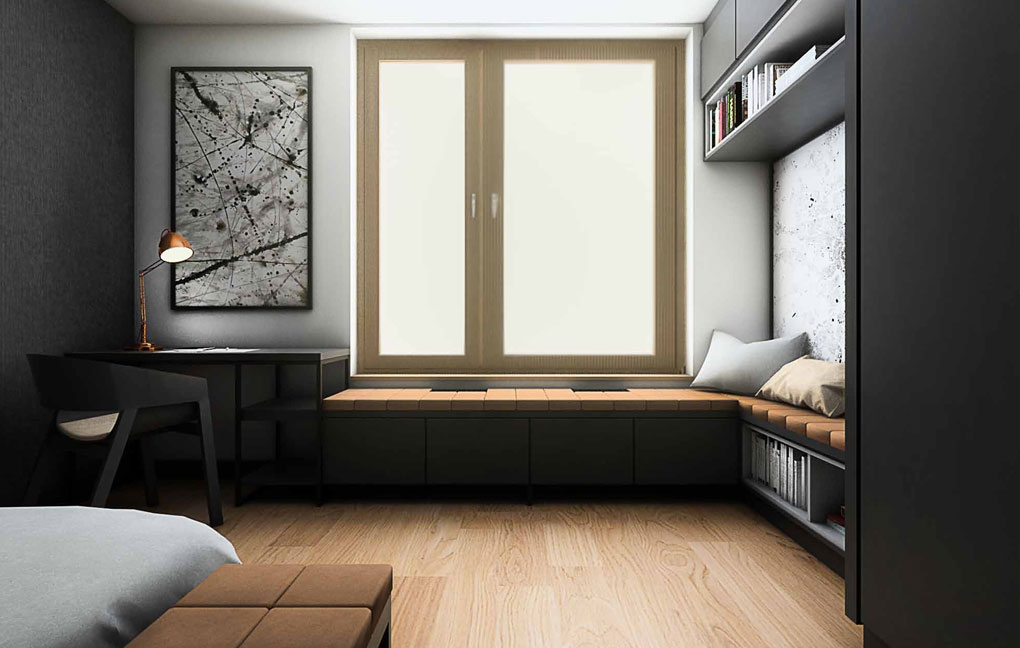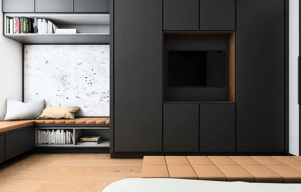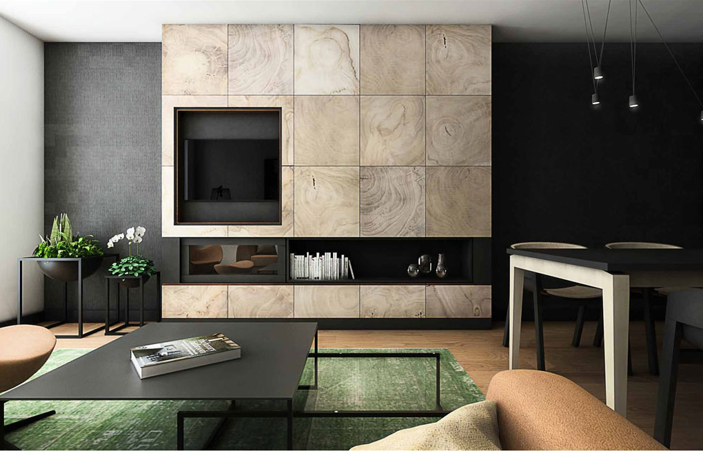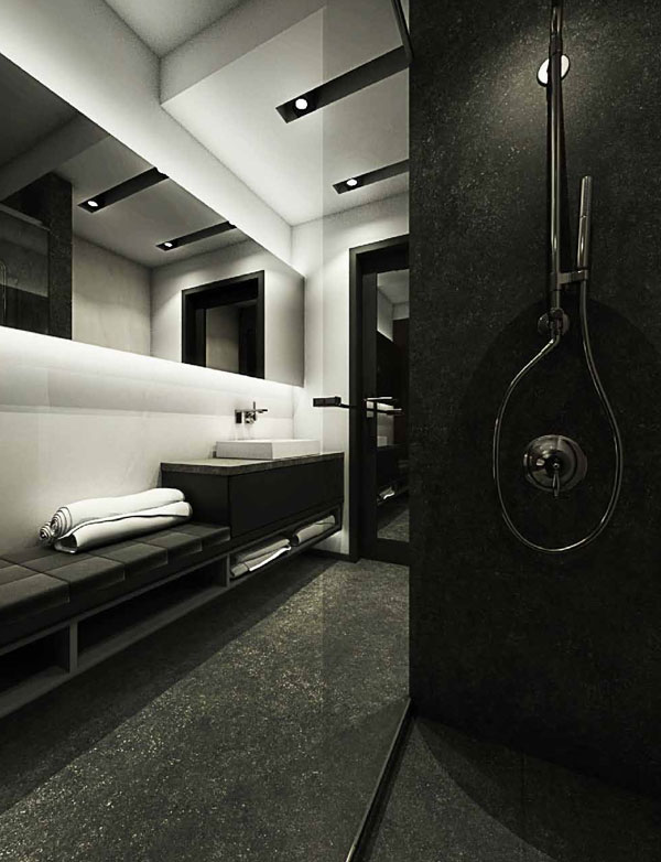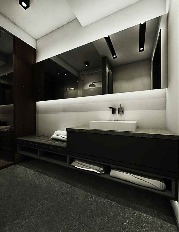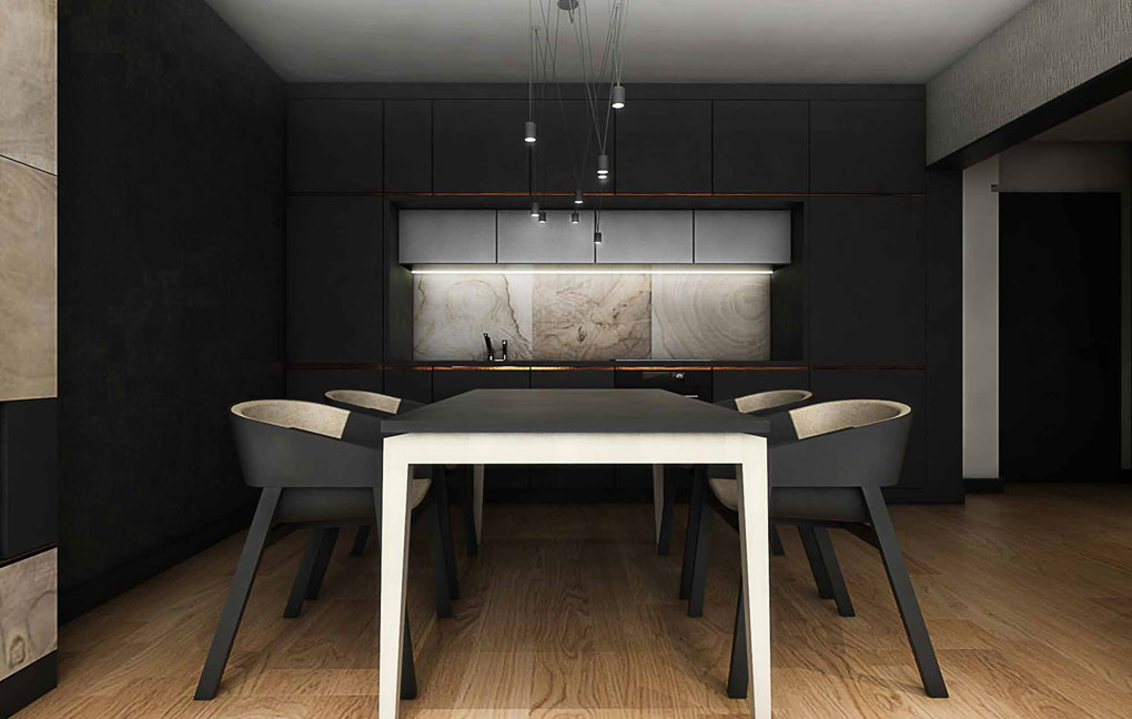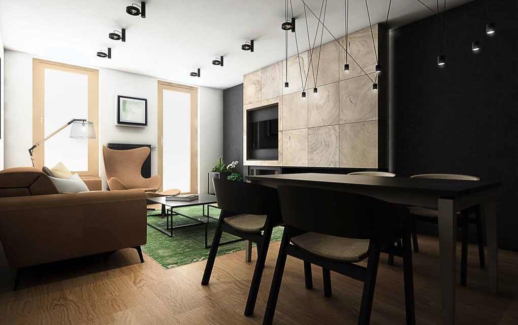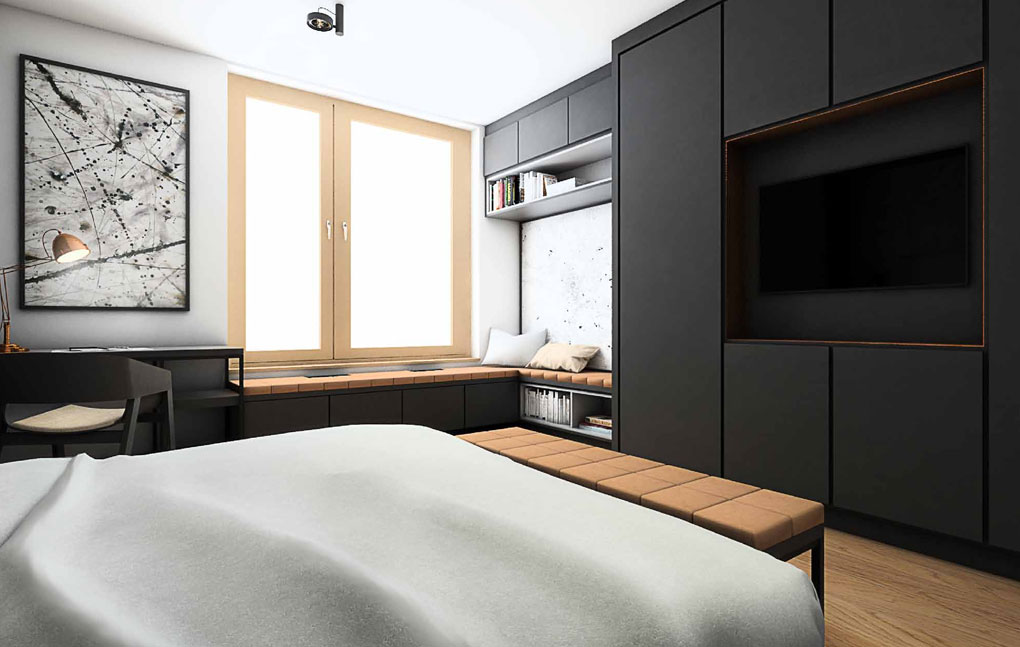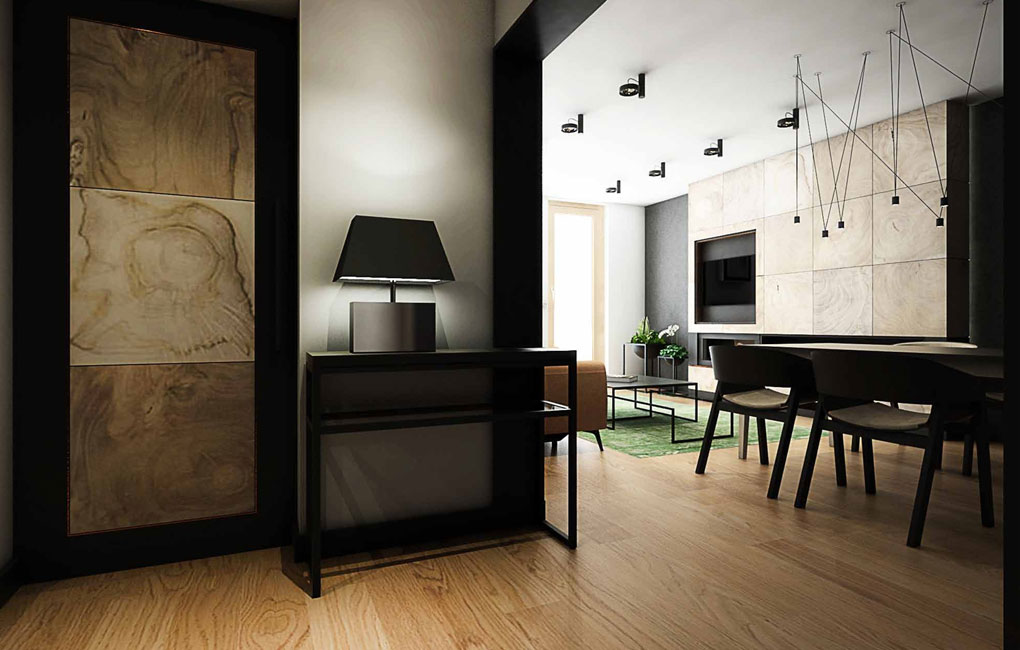 Apartment on ul. Masarska is certainly one of the valuable and even prestigious product. The branded products used in this interior determine the price of furnishing a flat. Starting from a wooden floor, high-class wall paint, large-format Florim ceramic tiles, Villeroy & Boch sanitary ceramics, LG ArtCool Galery air conditioning, through custom-made furniture, partially upholstered with leather and covered with Italian shawl, to the obscenely expensive Vibia lamp, Egg Chair or chairs and the TON table. In addition, an infrared sauna will be installed at the disposal of the household after a hard day’s work.