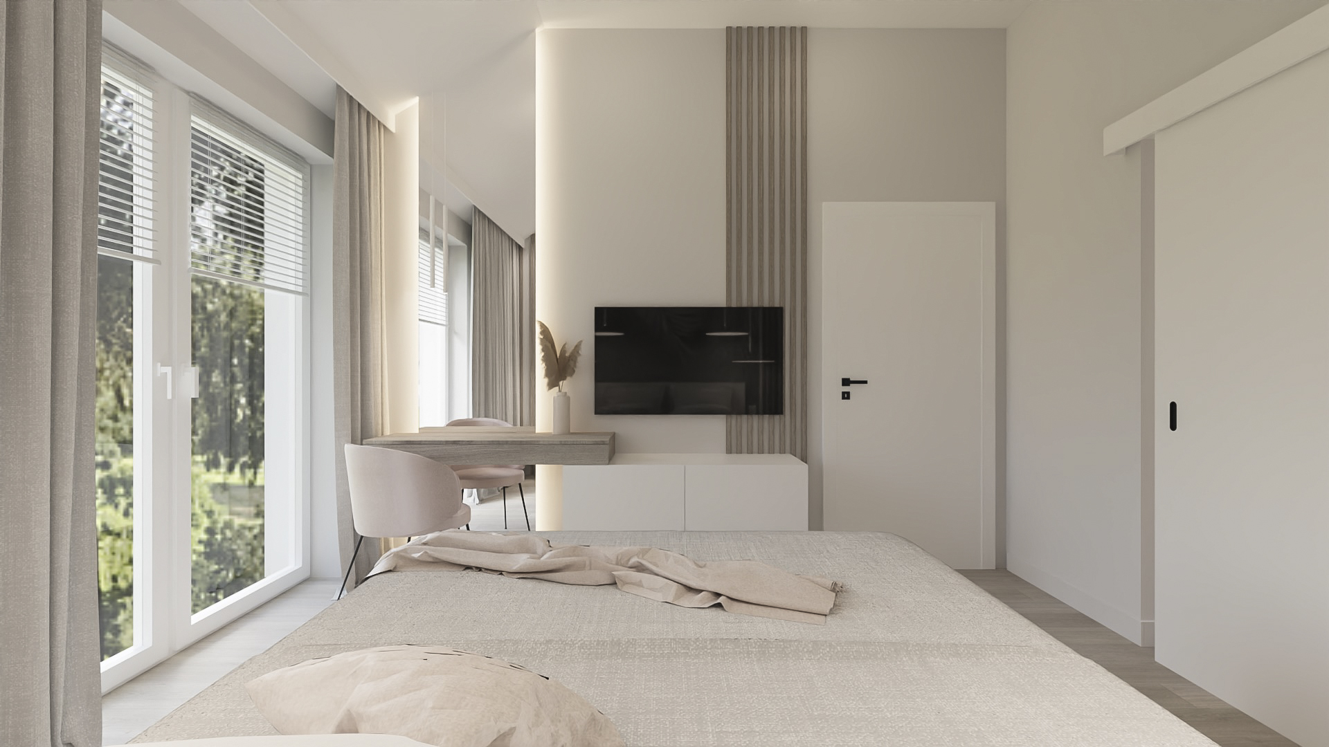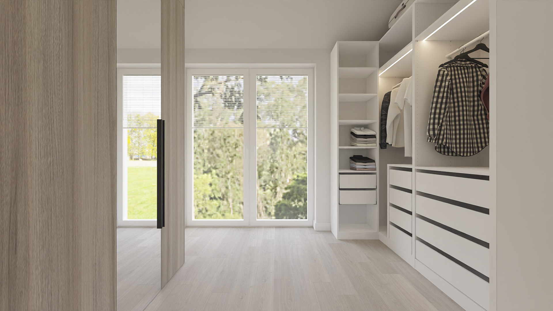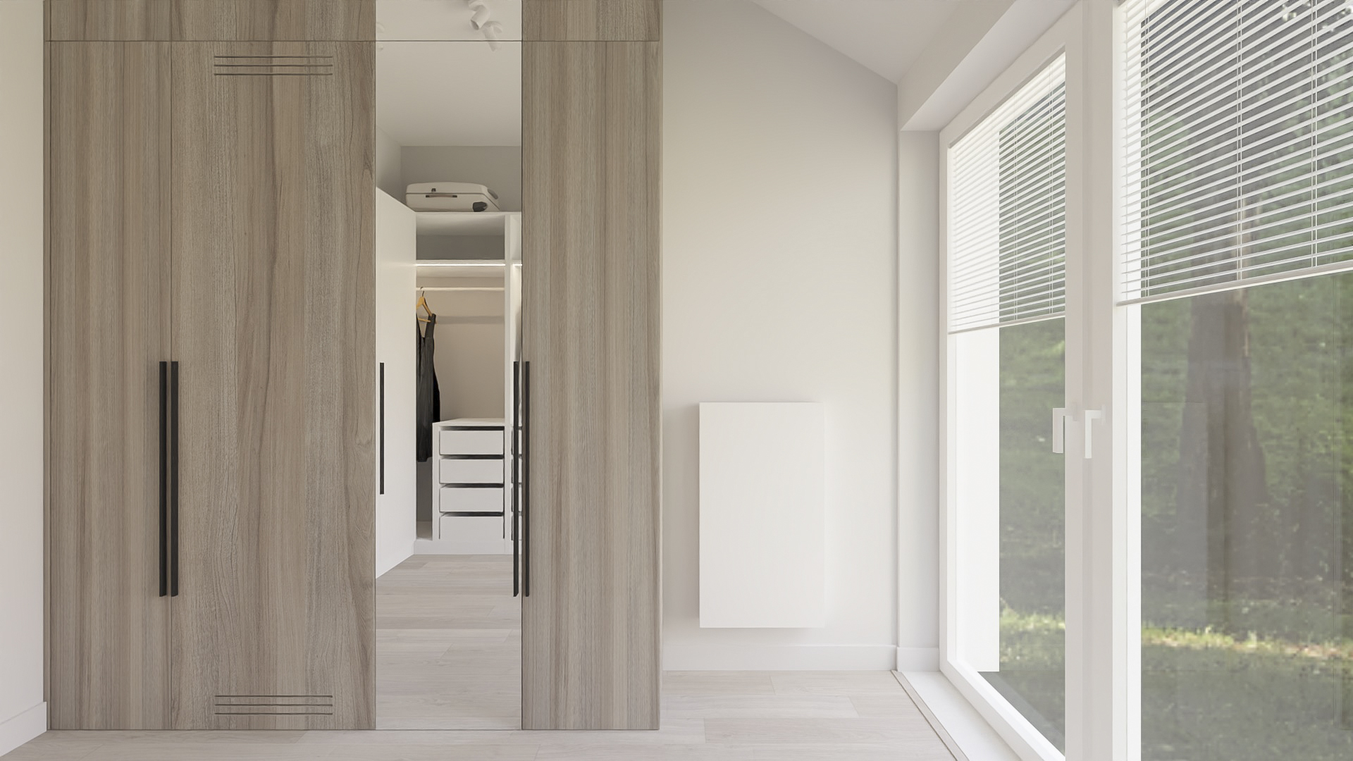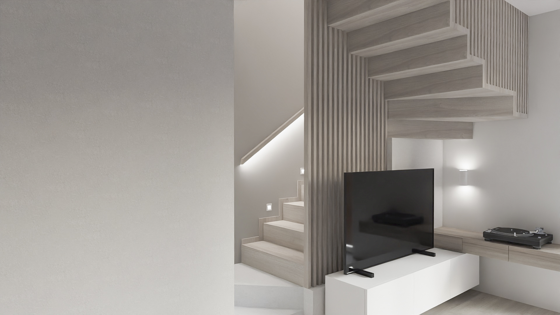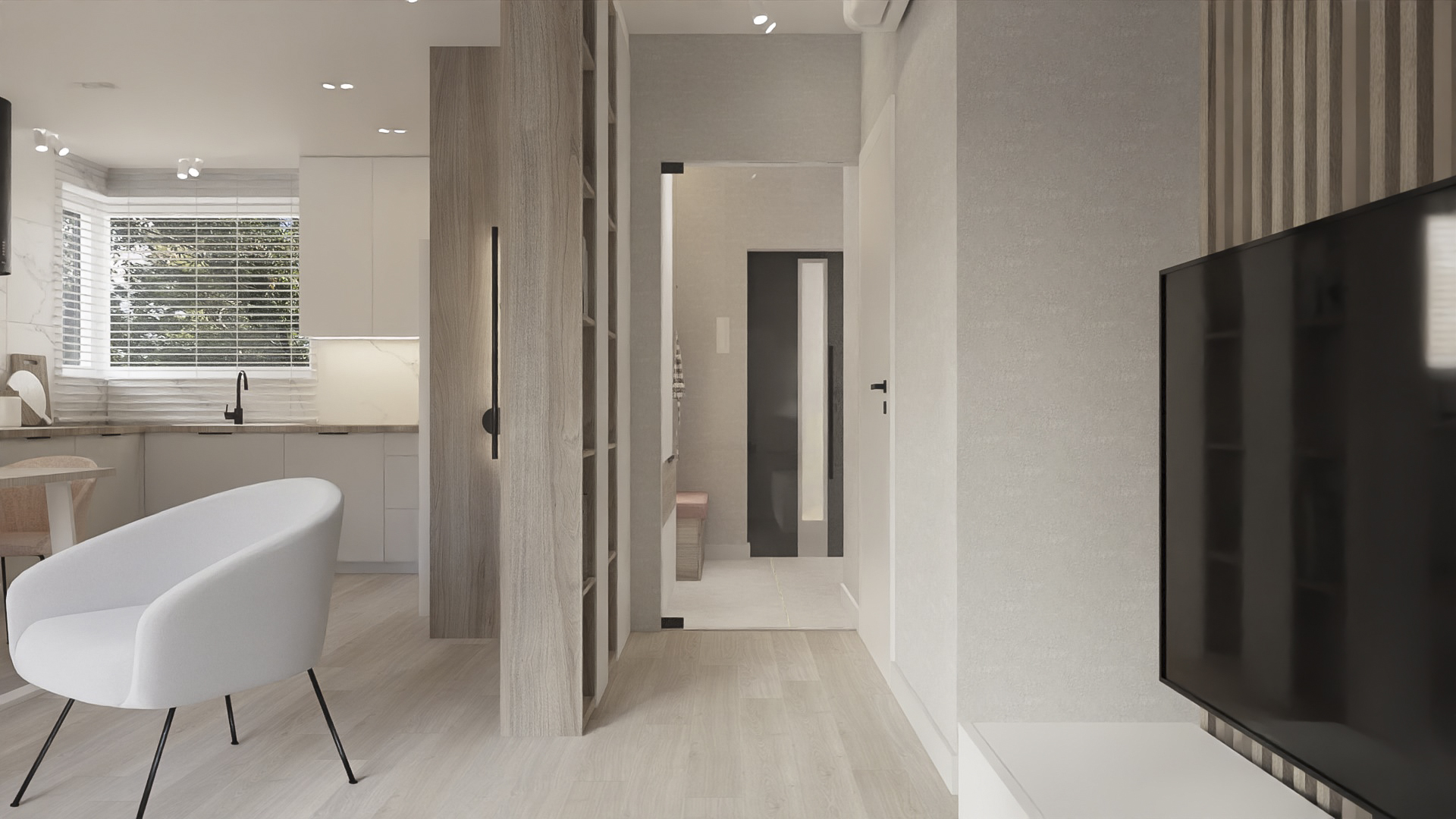 The kitchen has space for devices such as a thermomix, and the bedroom has space for a dressing table with a mirror and a TV. However, in the hall there is a seat and glass to make it easier to get ready to go out every day. Bathrooms look minimalist yet ergonomic. They have the same style and differ in equipment, so fans of both bathtubs and showers will be satisfied. Particularly noteworthy is the spectacular staircase connecting the living room with the rooms upstairs. The lamella finish gives the structure an interesting and light character.