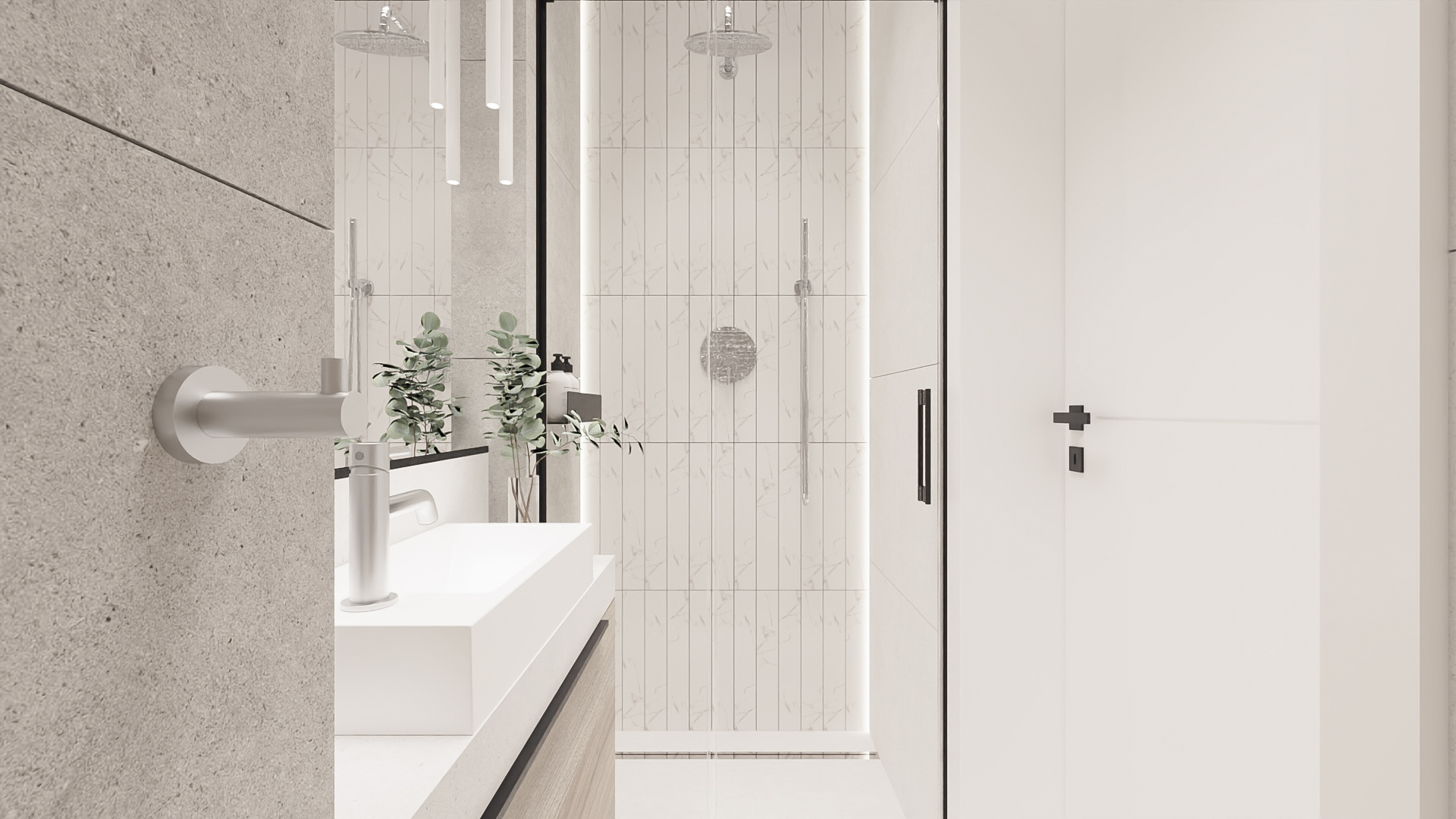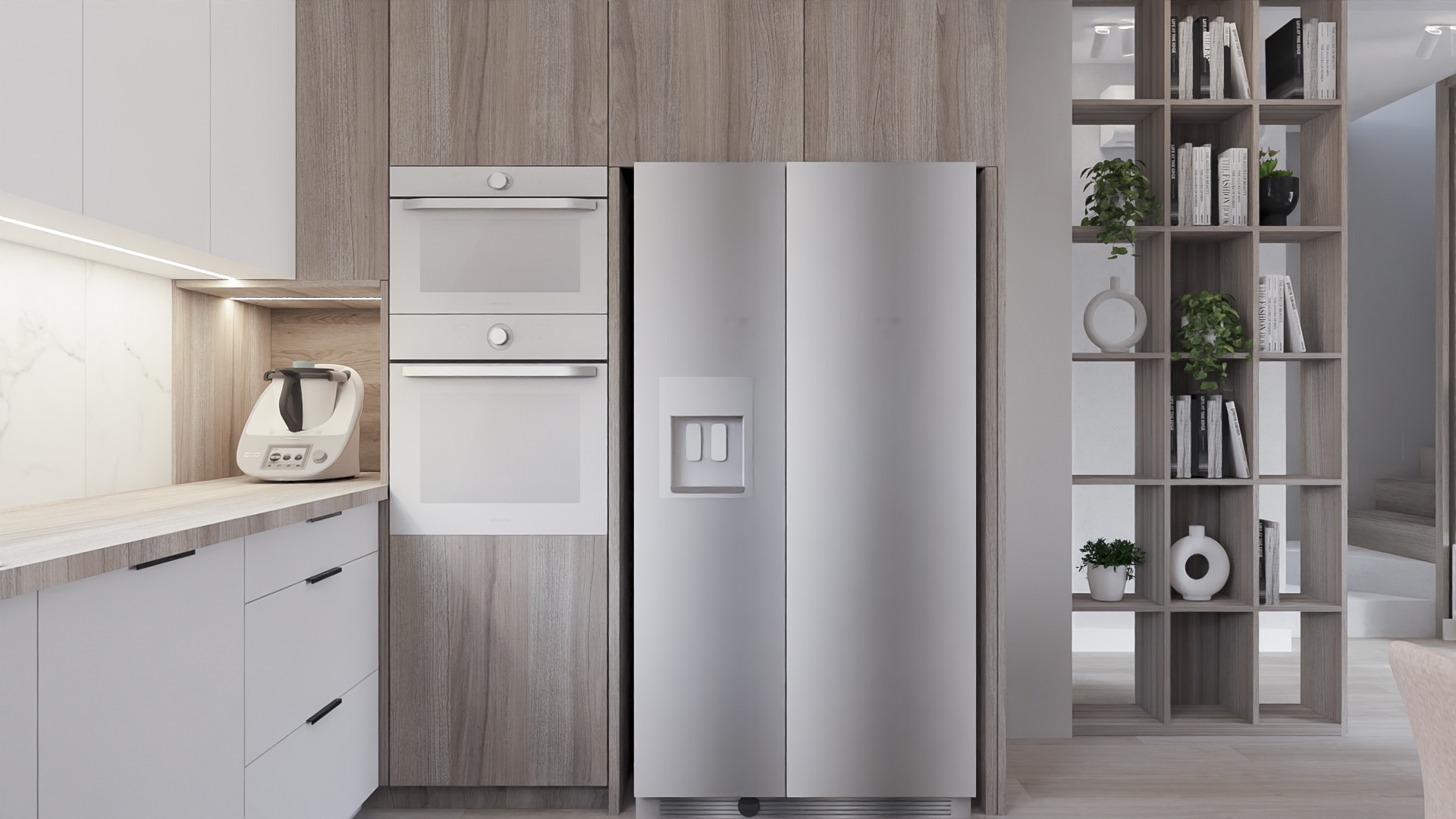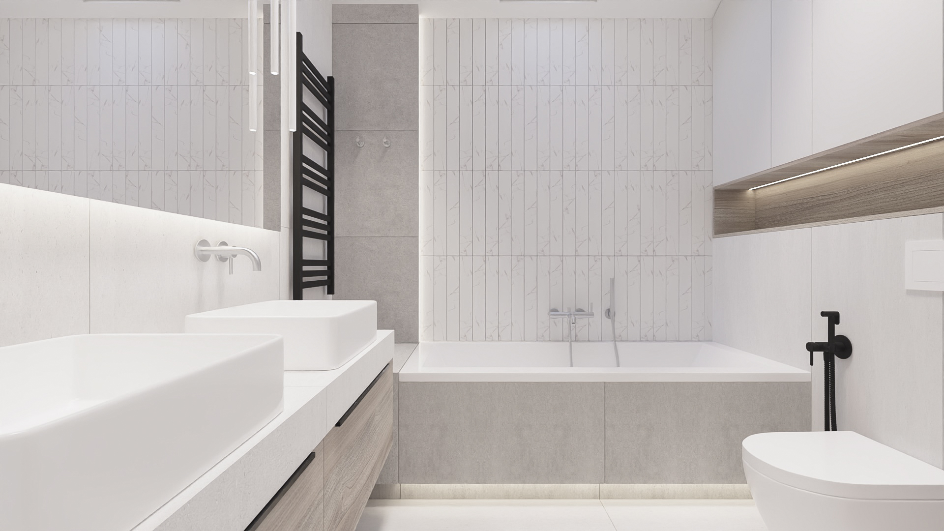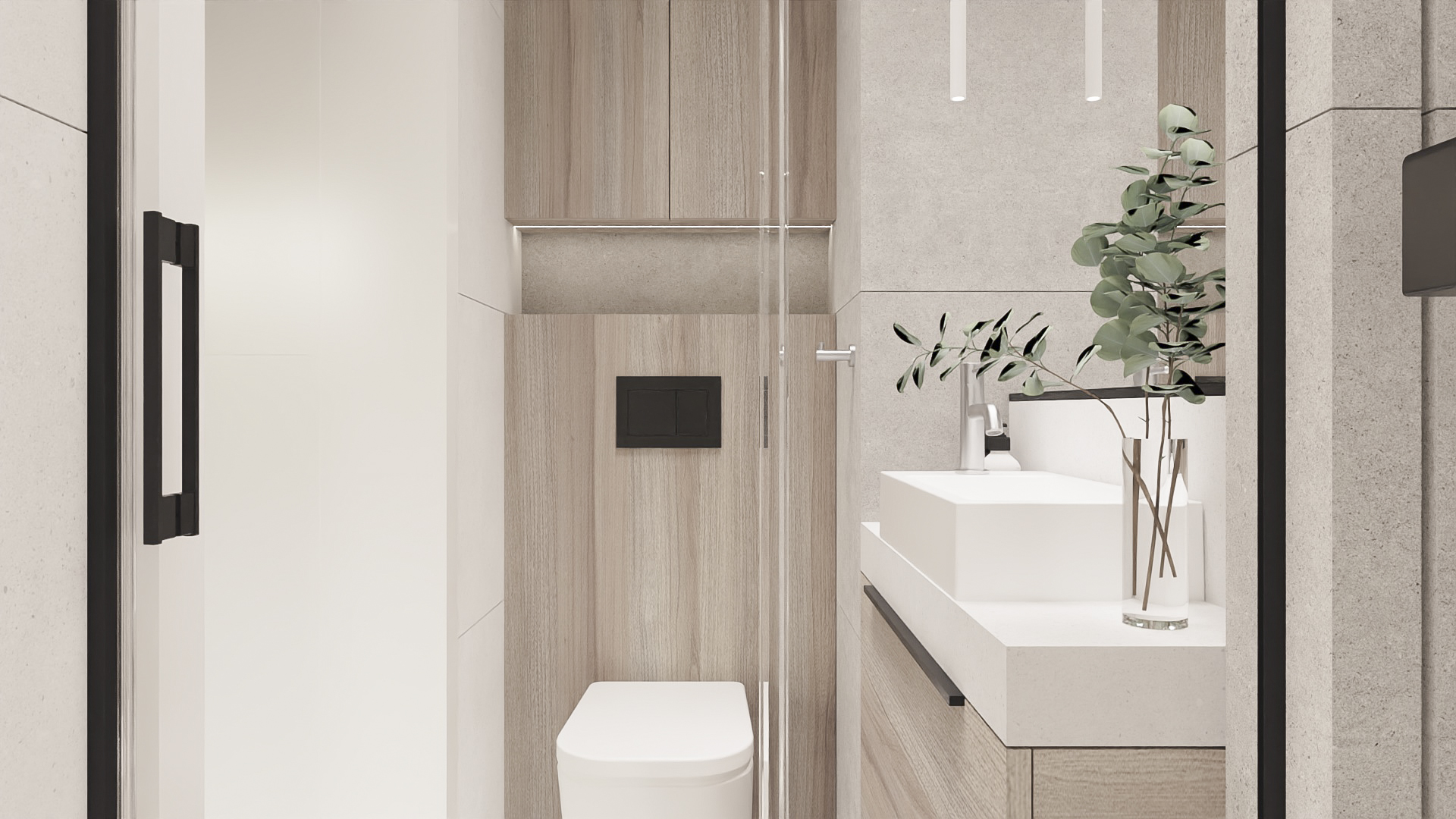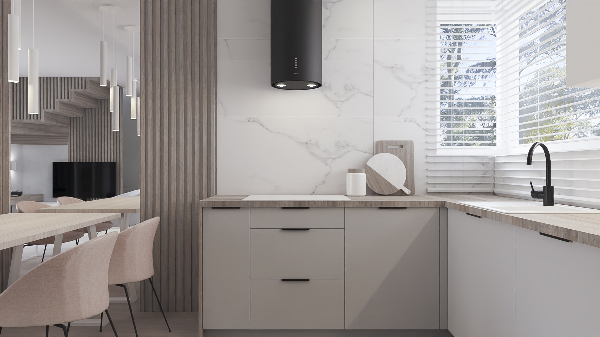 The kitchen has space for devices such as a thermomix, and the bedroom has space for a dressing table with a mirror and a TV. However, in the hall there is a seat and glass to make it easier to get ready to go out every day. Bathrooms look minimalist yet ergonomic. They have the same style and differ in equipment, so fans of both bathtubs and showers will be satisfied. Particularly noteworthy is the spectacular staircase connecting the living room with the rooms upstairs. The lamella finish gives the structure an interesting and light character.