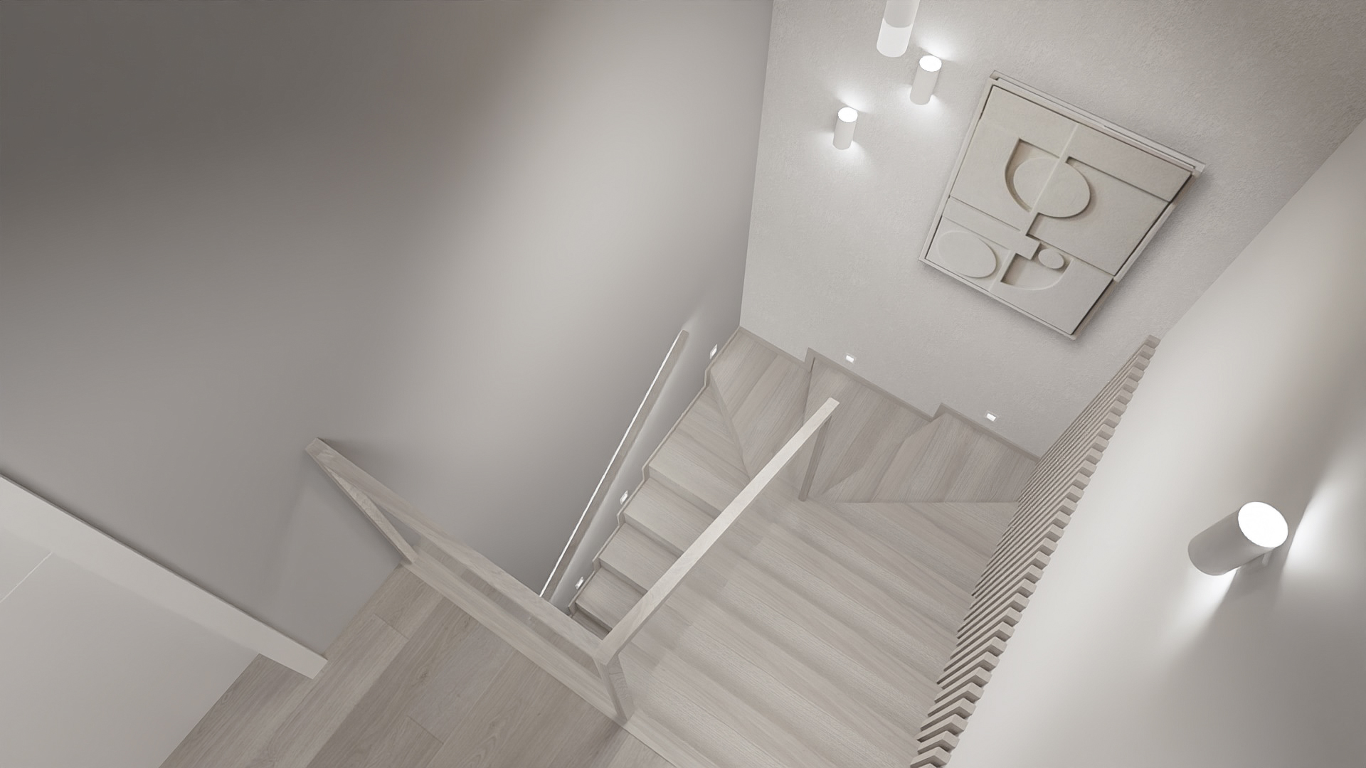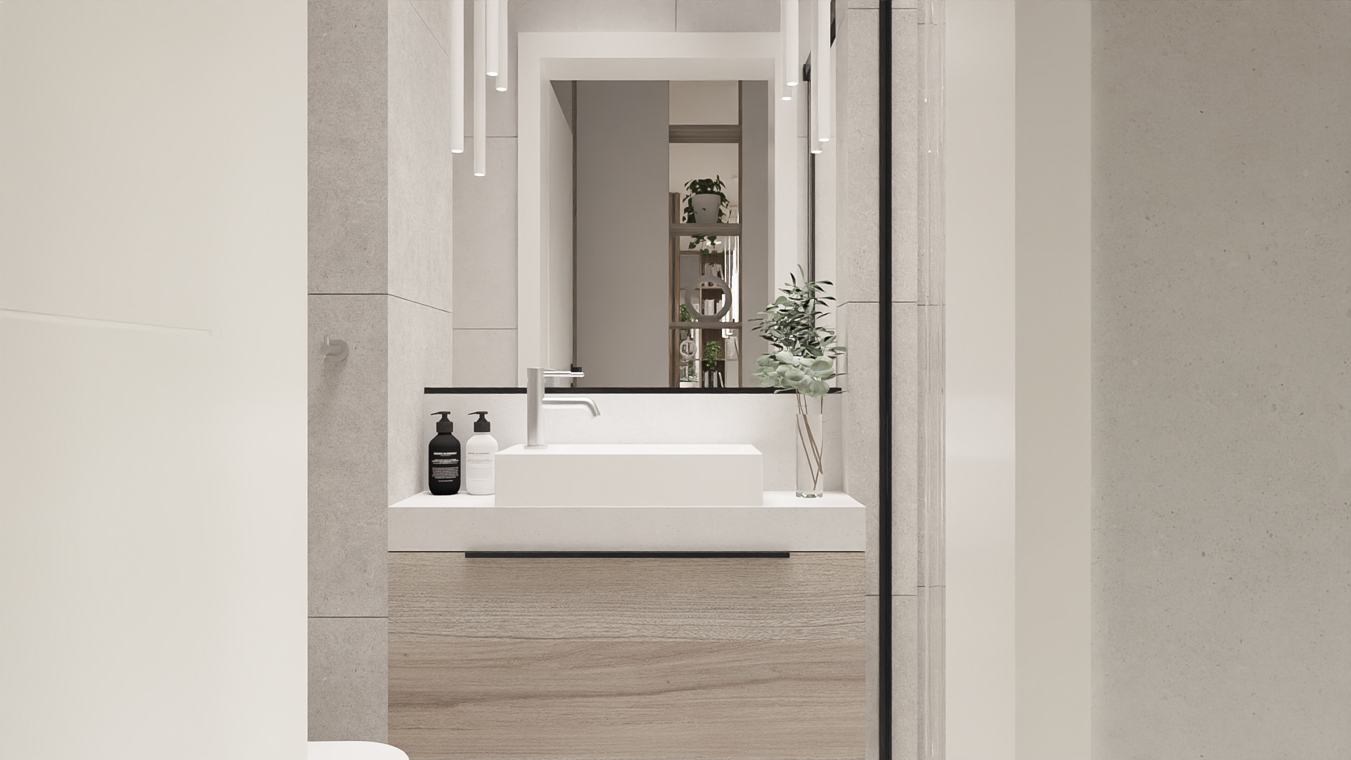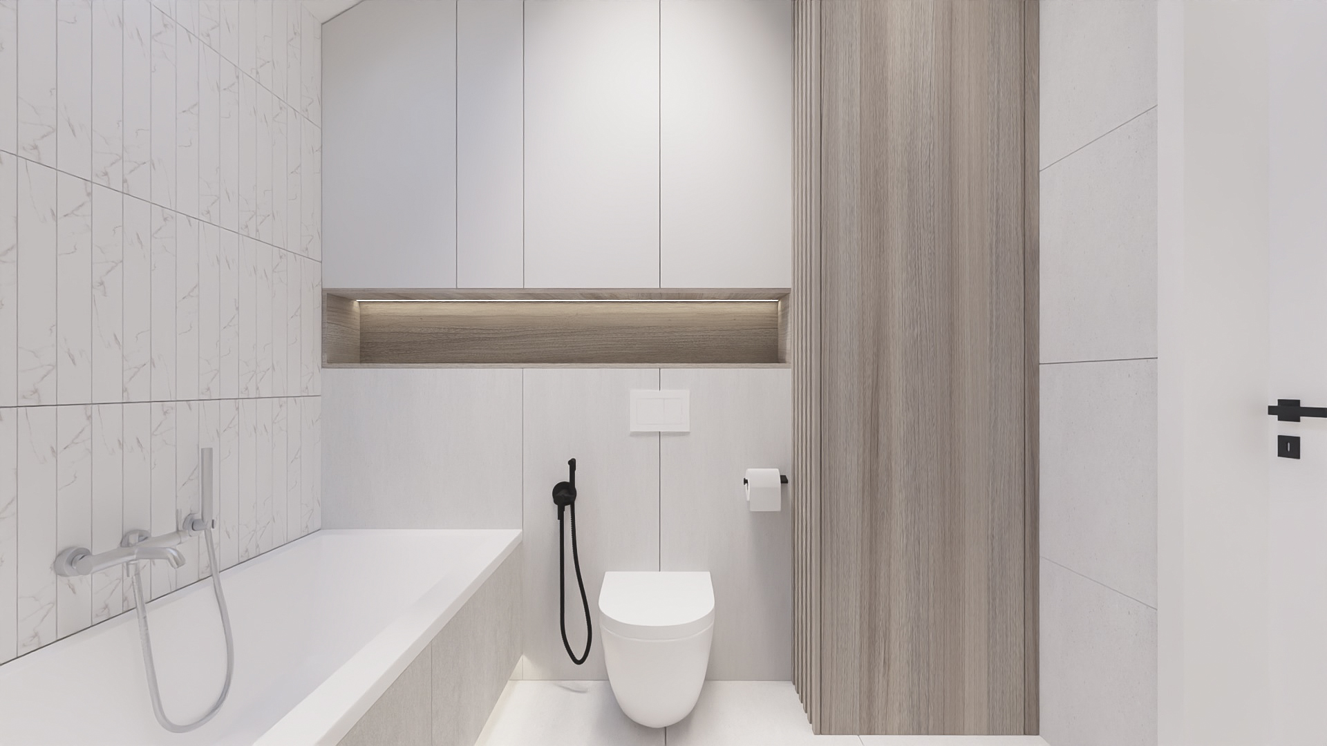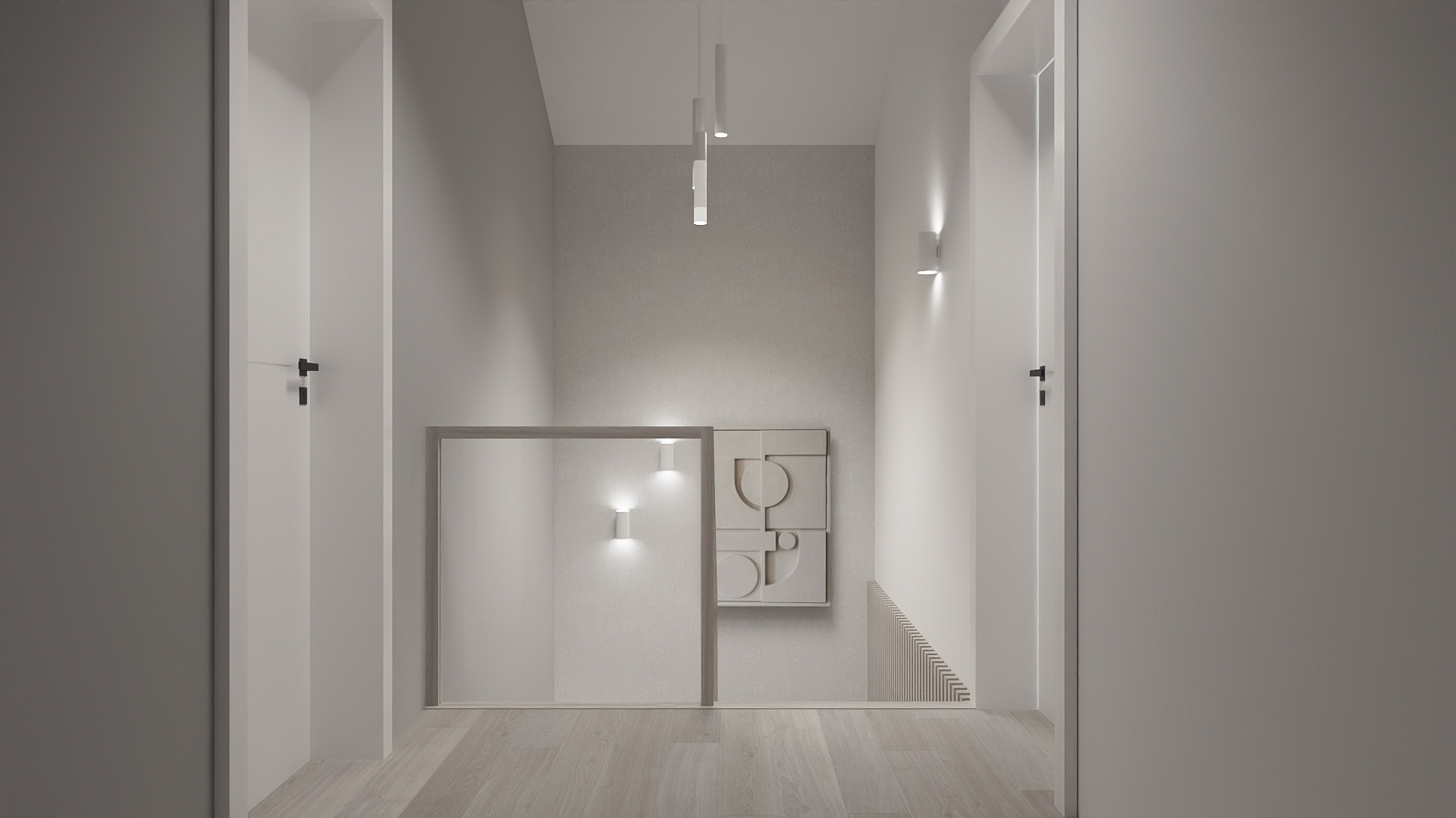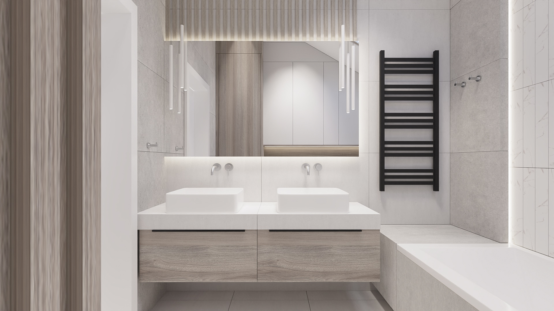 The kitchen has space for devices such as a thermomix, and the bedroom has space for a dressing table with a mirror and a TV. However, in the hall there is a seat and glass to make it easier to get ready to go out every day. Bathrooms look minimalist yet ergonomic. They have the same style and differ in equipment, so fans of both bathtubs and showers will be satisfied. Particularly noteworthy is the spectacular staircase connecting the living room with the rooms upstairs. The lamella finish gives the structure an interesting and light character.