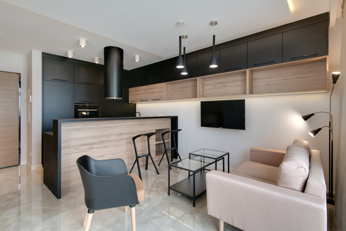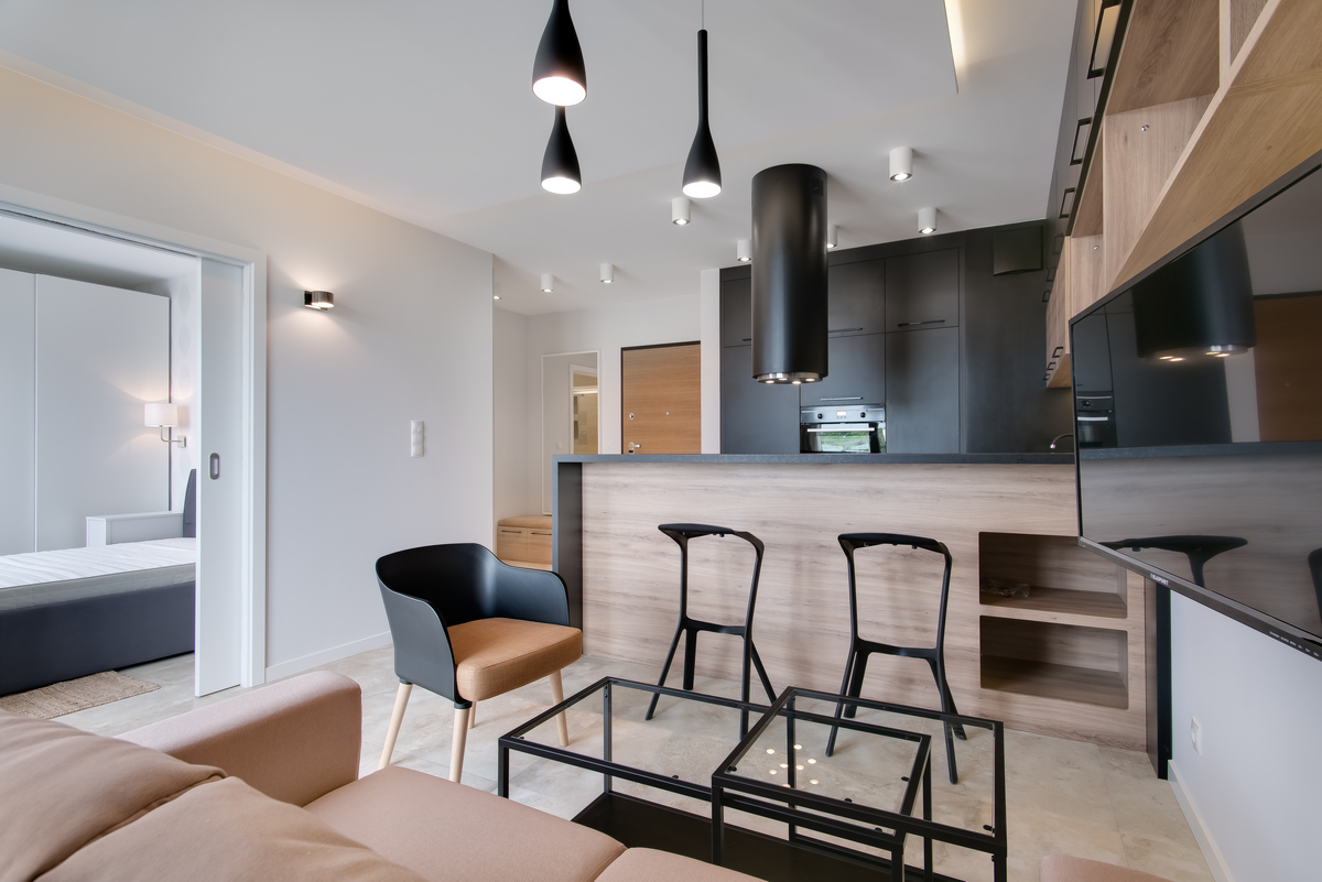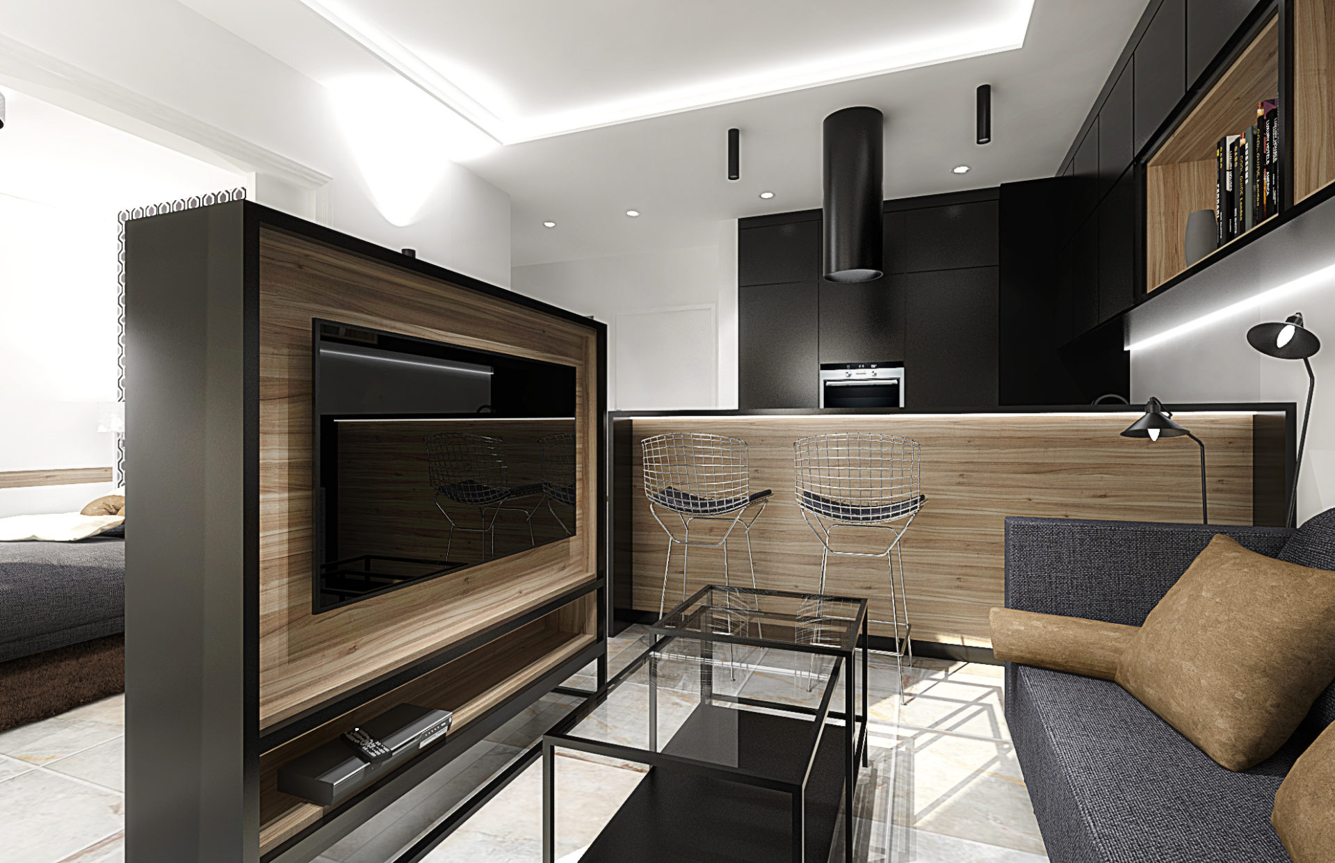 The apartment is for rent, made middle-class standard. The final effect is amazing. The living room with a kitchenette has been perfectly designed. The bookcase with a space for home theater turned is original spacesaving solution.