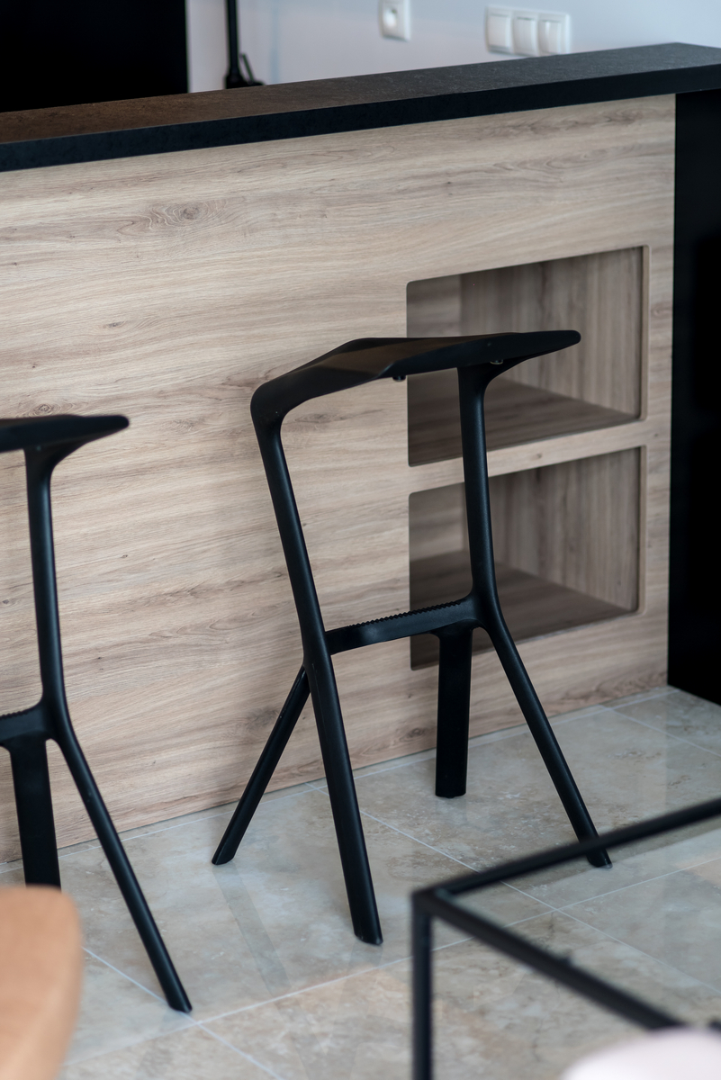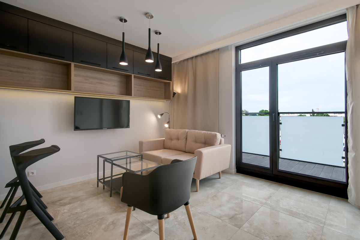 The apartments were intended for rent in advance. The investor, however, had certain quality expectations. We used mid-range materials: Tubądzin ceramic tiles, Kludi bathroom faucets, partly Ikea furniture and partly made-to-measure, Berker electrical equipment.