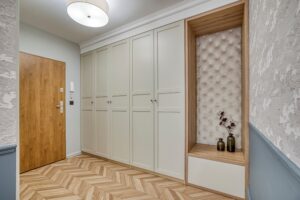 Obecne inwestycje deweloperskie zazwyczaj przewidują, choćby niewielką przestrzeń na szafę w przedpokoju. Najczęściej jednak, aby maksymalnie wykorzystać przestrzeń najlepiej jest taką wnękę zabudować szafą na wymiar. Wtedy przy pomocy architekta i stolarza w usłudze “wchodzisz i mieszkasz” taka szafa składać się będzie nie tylko z wygodnych dla nas półek i szuflad. Taka szafa może również mieć np.: lustrzane fronty, a to zwiększa odbiór przestrzeni. Dodatkowo lustrzane fronty są praktyczne podczas wyboru codziennego outfitu.