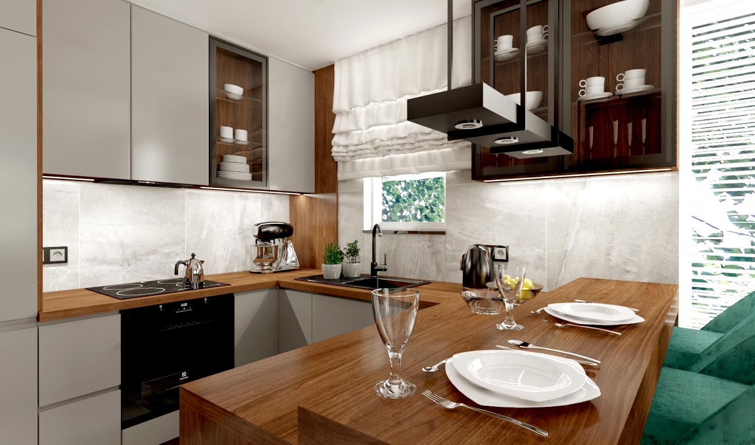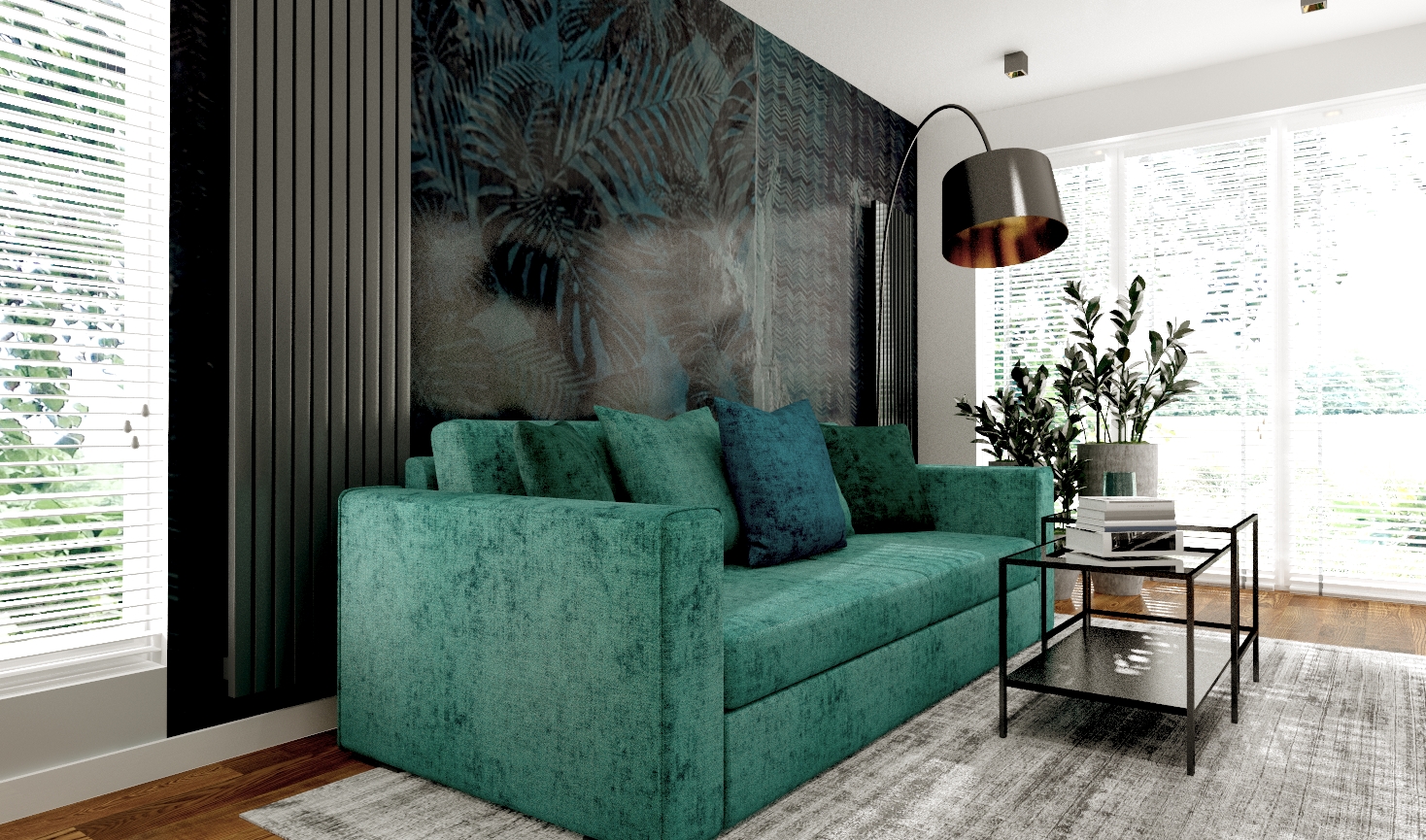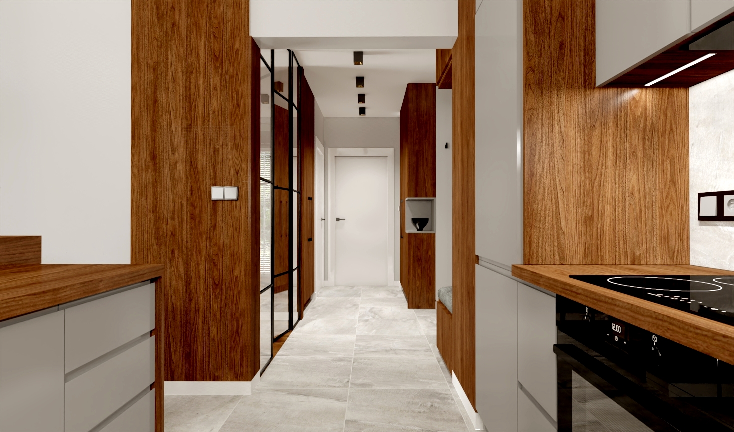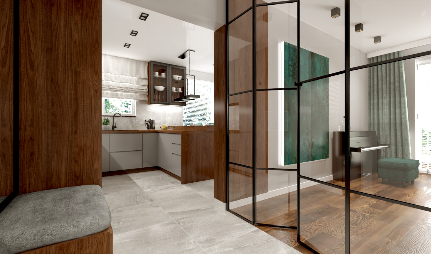Zaprojektowane i wykończone pod klucz mieszkanie łączy nowoczesność z nutą eklektyzmu. Motywem przewodnim jest drewno i szarość, które zaakcentowano turkusowymi elementami wystroju. Stonowana i ciepła paleta kolorystyczna sprawia, że zaprojektowane wnętrze jest przytulne i stylowe. Zastosowanie przeszkolonych drzwi pomiędzy hallem a gabinetem zapewnia dostęp do światła dziennego wewnętrznej części mieszkania i optycznie zwiększa przestrzeń przedpokoju. Co więcej, industrialne drzwi doskonale się wpasowują się w elegancką formę drewna i szarości, nadając wnętrzu harmonii i powagi.