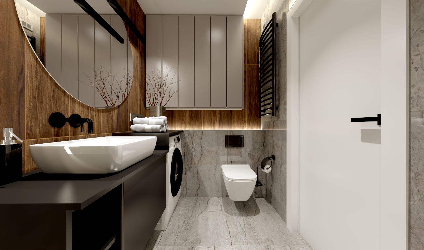 Wnętrze łazienki kontynuuje elegancki wymiar pozostałych pomieszczeń: armatura, grzejnik i dodatki w kolorze czarnym prezentują się niesamowicie w połączeniu z szarością i drewnem, a LEDowe oświetlenie mebli wykonanych na wymiar i okrągłe lustro prezentują się bardzo atrakcyjnie.